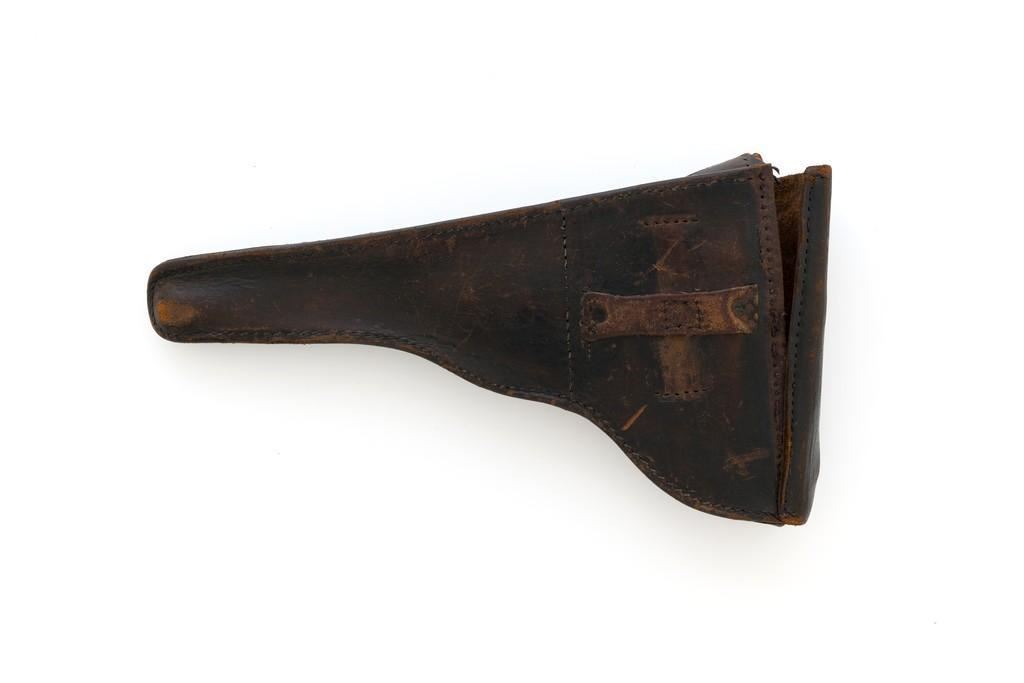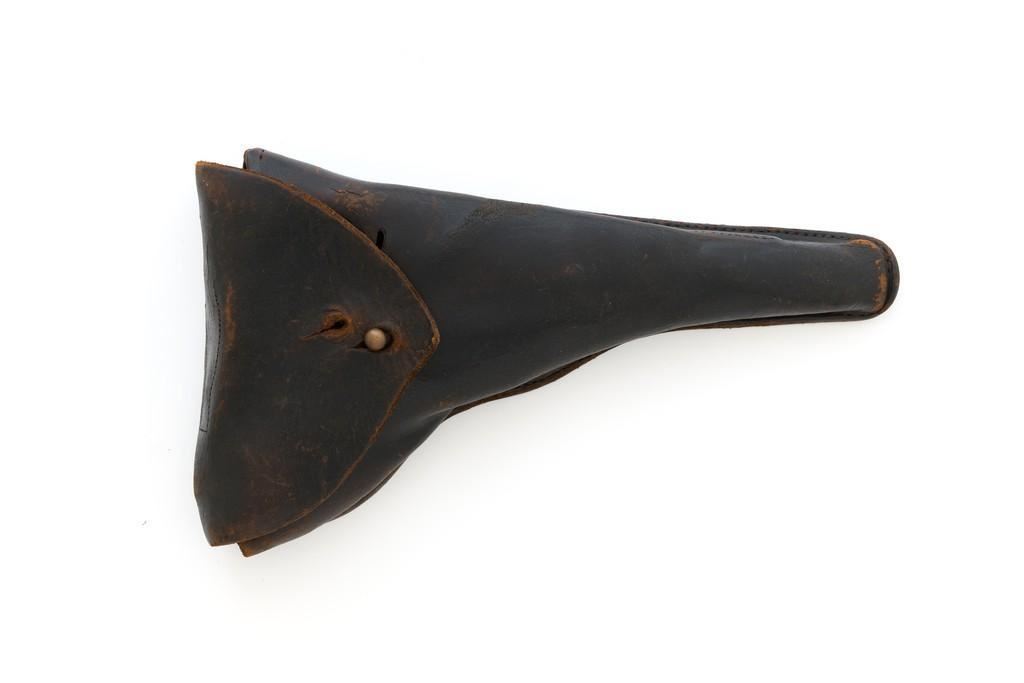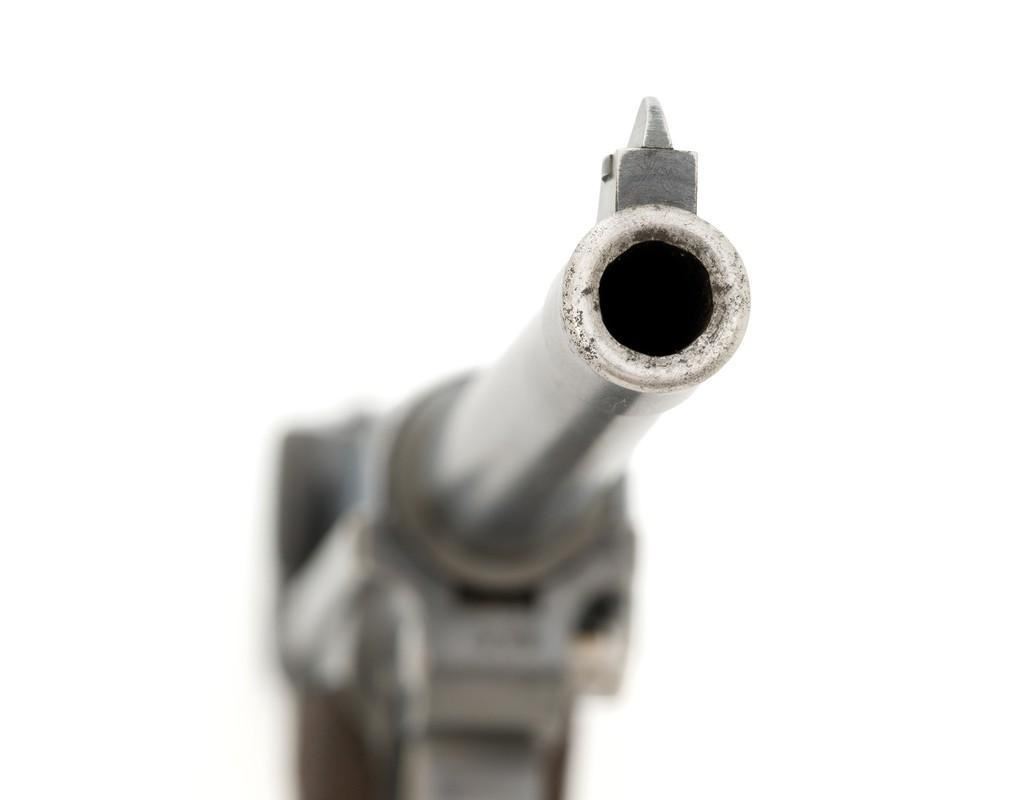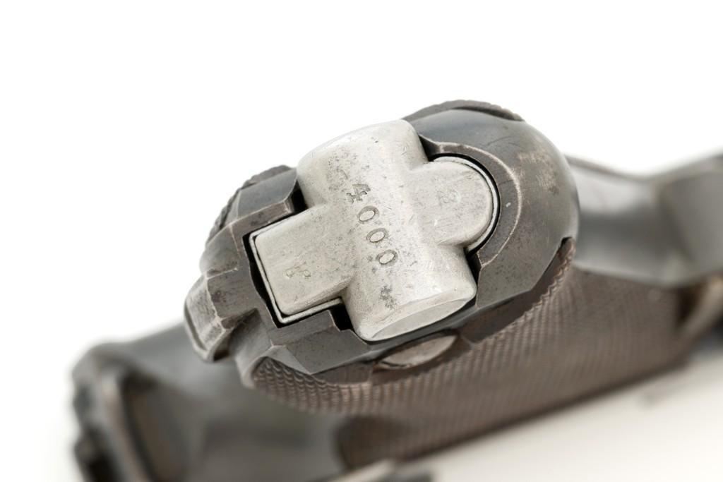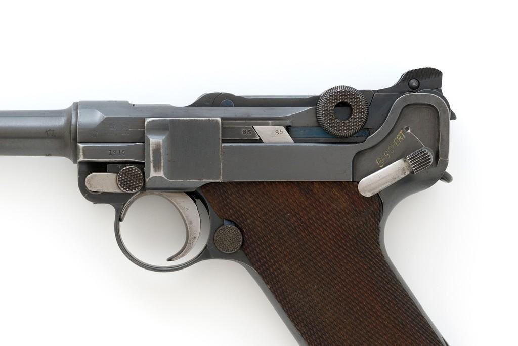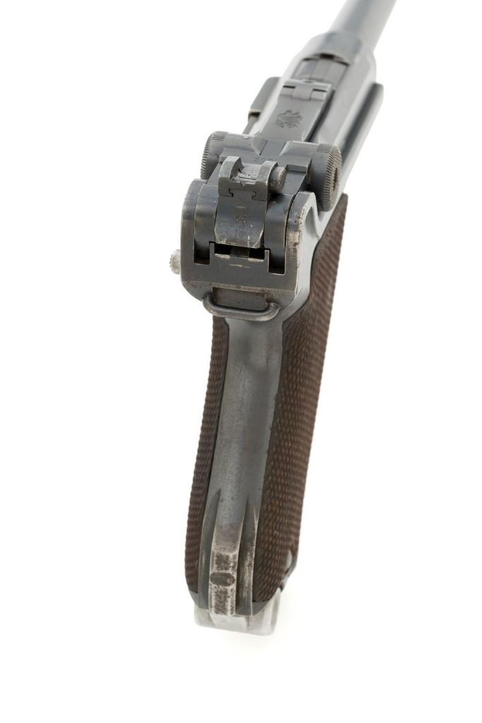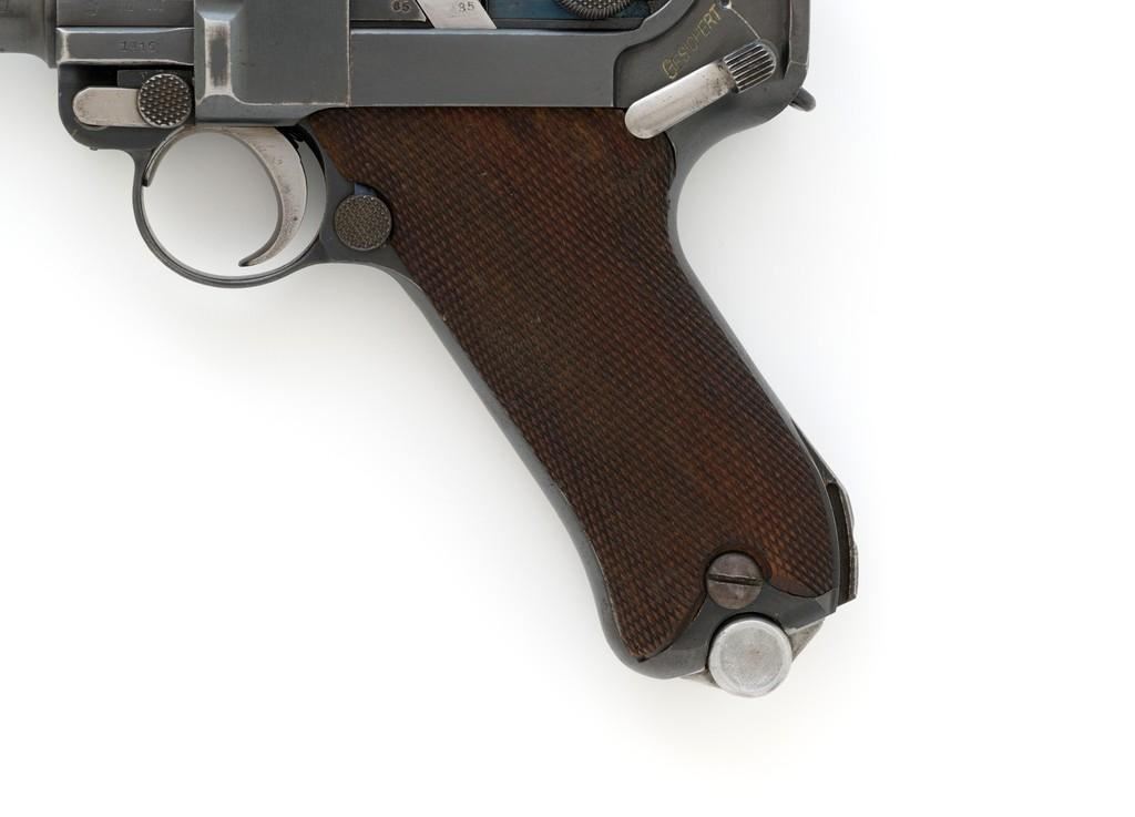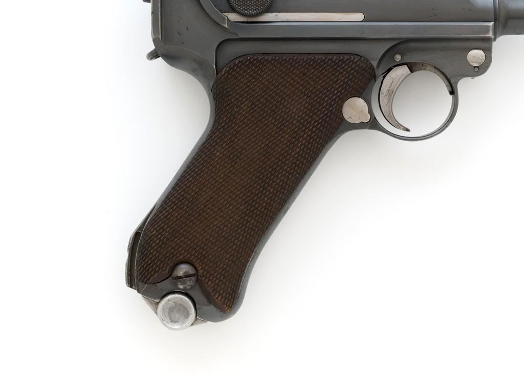 WWI Imperial German 1916 Dated Navy Luger with Holster, #985, 9mm cal., 6'' barrel, rust blue finish, straw colored small parts, checkered walnut grips, dovetailed inverted-''V'' front, and two-position adjustable rear sight with ''V''-notch, and stock lug. Includes one mismatched aluminum based Haenel Schmeisser magazine. Also included is a period modified, unmarked black leather holster. The exterior cleaning rod holder and interior compartment for the takedown tool have both been removed. The original belt loop has also been replaced, extra hole added to the front flat for the closing stud, and the lifting strap removed. Holster has no visible maker's marks but the inside of the flap has what appears to be a German name written in pencil. The pistols toggle is marked ''DWM'' with a ''1916'' chamber date. Imperial Navy proof mark and two ''(crown)M'' acceptance marks are visible on the left side of the receiver. Left side of barrel with Imperial Navy ''(crown)'' proof mark, bottom with ''(crown)M''; ''1916'' on left side of the front sight base and left edge of the frame, above the takedown lever. All visible numbers matching (excluding the magazine); grips and firing pin are not numbered. Pistol is in fine overall condition, retaining approx. 92%-94% original blue with light wear at the muzzle, sideplate, and stock lug accounting for most the finish loss. There is mild frosting present on the front and backstrap. Factory lettering and proof marks are clear. Straw colored parts are almost completely silver colored. Grips display normal signs of age and light handling wear; checkering detail is primarily crisp. Action and hold open function properly. Bore with scattered light erosion and is otherwise bright; rifling is very good. Magazine shows typical light rub wear and small marks from use. Holster is in fair condition as modified. The flap needs to be repaired and is holding on by only a few threads. Otherwise, leather remains supple and has general moderate scuffs, scratches, and some age cracking. Est: $2,500-$3,500. (C&R/PPT)