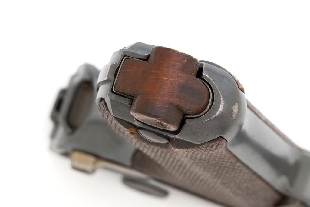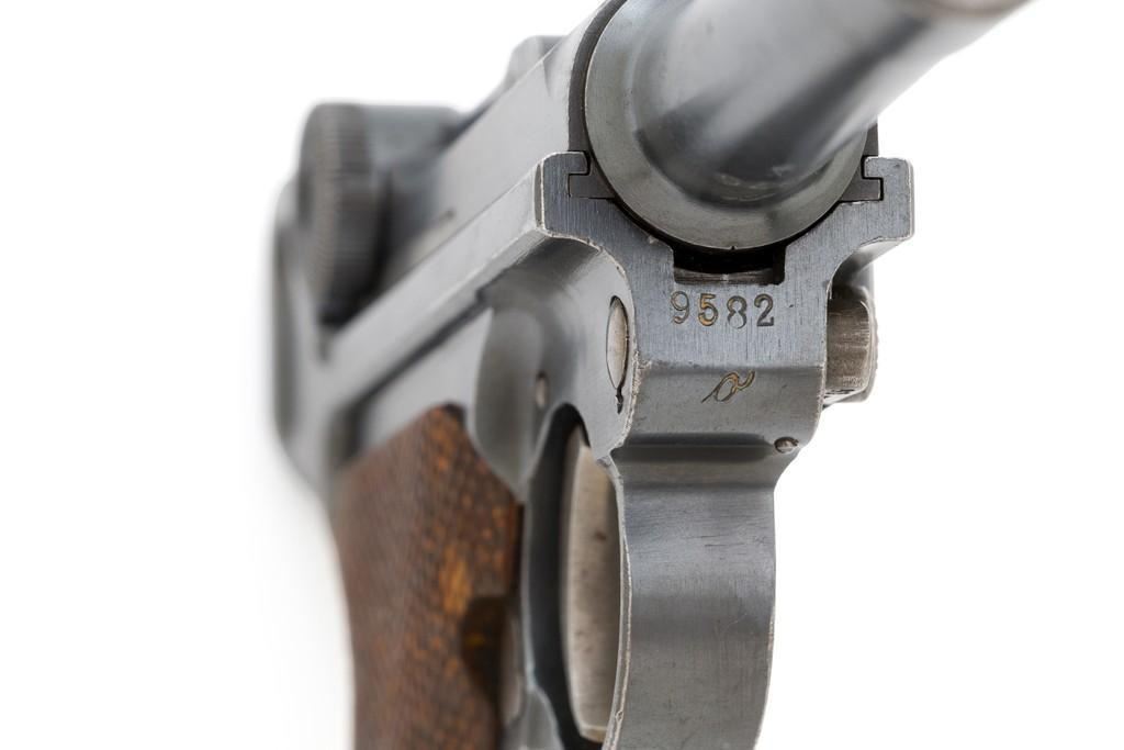 DWM 1920 Commercial Luger Semi-Automatic Pistol, #9582o, .30 Luger cal., 3.75'' barrel, blued finish, straw colored small parts, checkered walnut grips, dovetailed inverted-''V'' front sight, and fixed rear sight with ''V''-notched groove. Includes one unmarked period magazine with wood base. Pistol is marked ''DWM'' on the toggle. Left side of receiver marked ''(crown)N'' and ''GERMANY''. Upper safety position is marked ''GESICHERT'', lower position is blank. Underside of the barrel with ''(crown)N'' above the serial number. All visible numbers matching; grips and firing pin are not numbered. Pistol is in fine overall condition, retaining approx. 93%-94% original blue, showing areas of light edgewear and wear to the stock lug. There is some very mild frosting visible on the front and backstrap. Factory lettering and proof marks are clear. Straw colors have worn to approx. 40%, showing general thinning and toning, scattered salt and pepper blemishes. Grips are very good displaying signs of moderate age and wear, with a small chip missing from next to the left side grip screw. Action operates smoothly, hold open functions properly. There is mild pitting scattered throughout the bore; rifling is good. Magazine body has intermittent spots of brown patina to the bright metal and a few light marks on the base. Est.: $1,000-$1,500. (C&R/PPT)