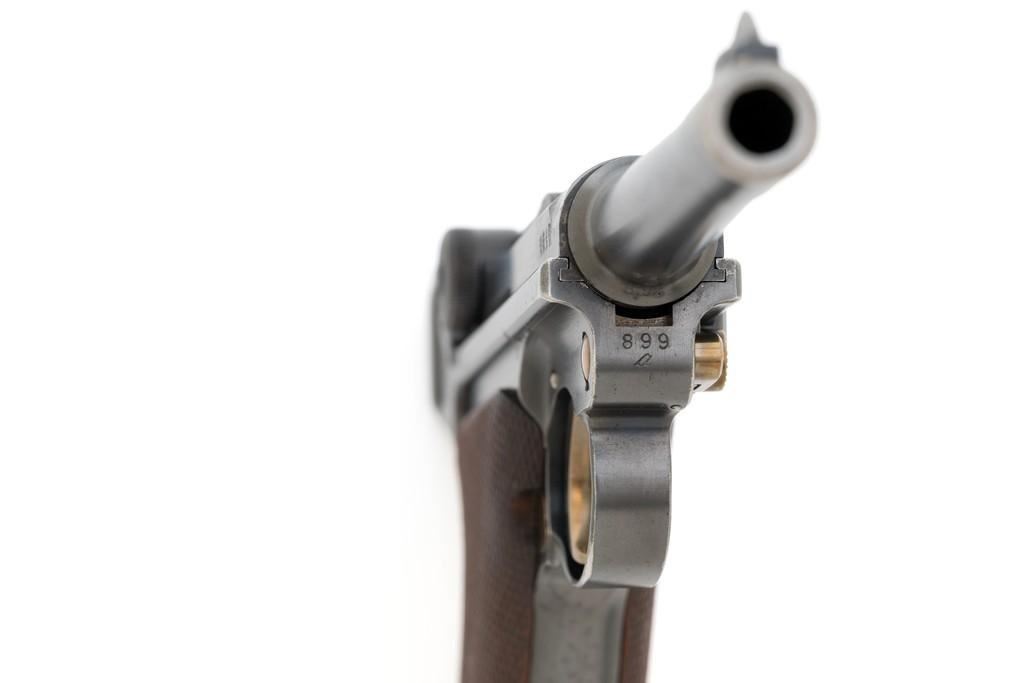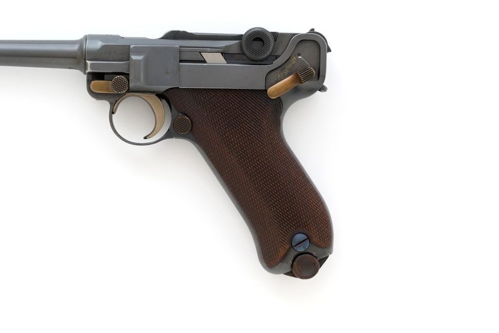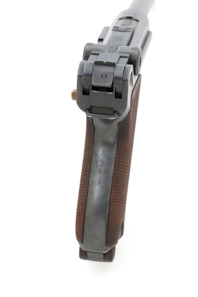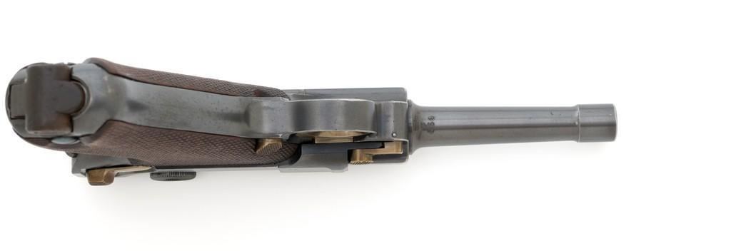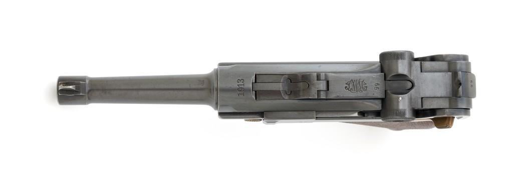 1913 Dated DWM P.08 Luger Semi-Automatic Pistol, #899a, 9mm cal., 4'' barrel, rust blue finish, straw colored small parts, checkered walnut grips, inverted-''V'' front sight, fixed rear sight with small ''V''-notched groove, no stock lug or grip safety. Includes one mis-matched nickel plated magazine with wood base, faintly numbered ''133+'' on the base, no other markings. Pistol is marked ''DWM'' on toggle with ''1913'' date on top of chamber. Right side of receiver with three '' (crown)/script letter'' military proofs and test fire proof mark. Most of the numbered parts are matching, including both grips. Toggle pin does not match and the numbers on the takedown lever are stamped upside down. Safety bar and firing pin are not numbered. Condition is fine to near excellent, with the top end showing signs of professional restoration; retaining approx. 95% blue, showing light wear at the muzzle; light wear and frosting to the front and backstrap. Grip screws are replacements and the straw colored parts show evidence of enhancement and nearly all the colors remain. Factory lettering and proof marks are clear. Grips show typical moderate handling wear, no significant blemishes. Action and hold open function properly. Rifling is worn but visible and the bore is lightly pitted throughout. Magazine body shows moderate yellow toning and there are tool marks to the right side near the pin that holds the base in place; base with small dents and scratches. Overall, a nice looking P.08 Luger. Est.: $1,000-$1,300. (C&R)