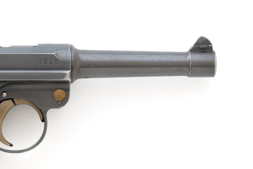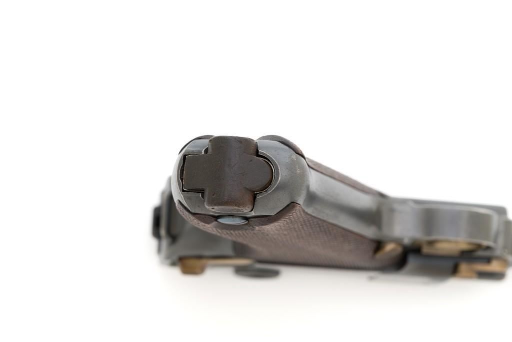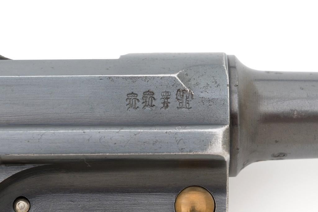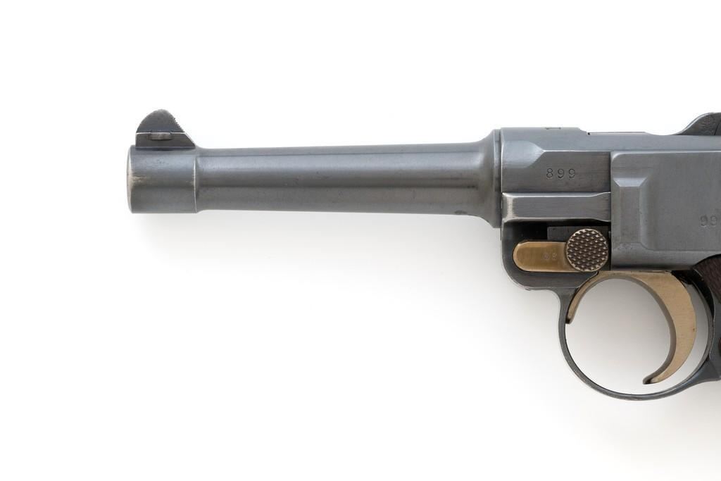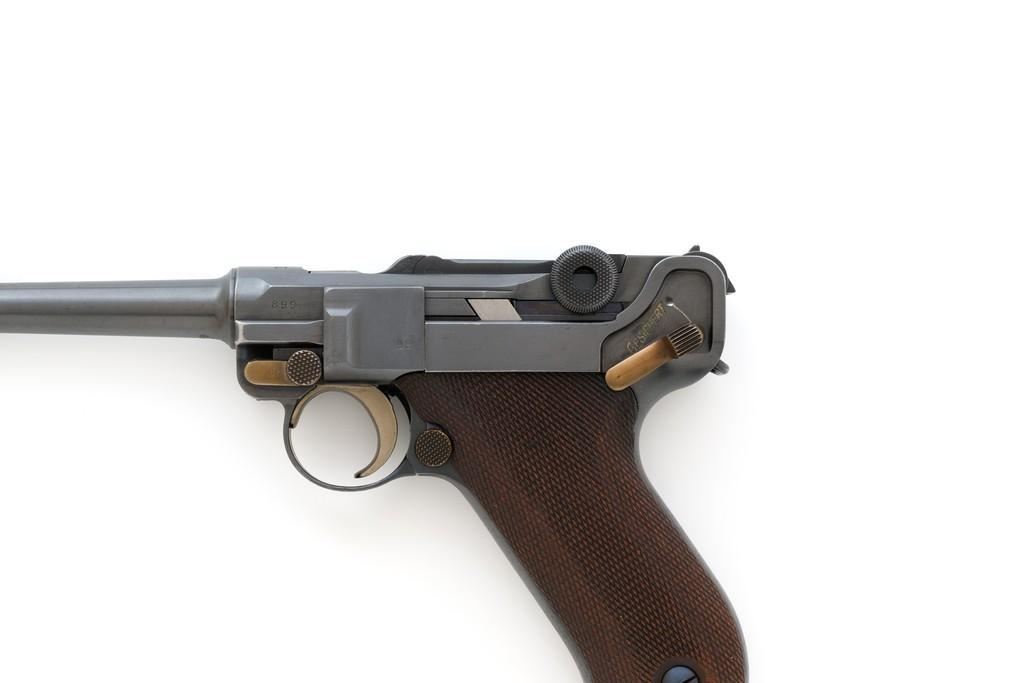 1913 Dated DWM P.08 Luger Semi-Automatic Pistol, #899a, 9mm cal., 4'' barrel, rust blue finish, straw colored small parts, checkered walnut grips, inverted-''V'' front sight, fixed rear sight with small ''V''-notched groove, no stock lug or grip safety. Includes one mis-matched nickel plated magazine with wood base, faintly numbered ''133+'' on the base, no other markings. Pistol is marked ''DWM'' on toggle with ''1913'' date on top of chamber. Right side of receiver with three '' (crown)/script letter'' military proofs and test fire proof mark. Most of the numbered parts are matching, including both grips. Toggle pin does not match and the numbers on the takedown lever are stamped upside down. Safety bar and firing pin are not numbered. Condition is fine to near excellent, with the top end showing signs of professional restoration; retaining approx. 95% blue, showing light wear at the muzzle; light wear and frosting to the front and backstrap. Grip screws are replacements and the straw colored parts show evidence of enhancement and nearly all the colors remain. Factory lettering and proof marks are clear. Grips show typical moderate handling wear, no significant blemishes. Action and hold open function properly. Rifling is worn but visible and the bore is lightly pitted throughout. Magazine body shows moderate yellow toning and there are tool marks to the right side near the pin that holds the base in place; base with small dents and scratches. Overall, a nice looking P.08 Luger. Est.: $1,000-$1,300. (C&R)