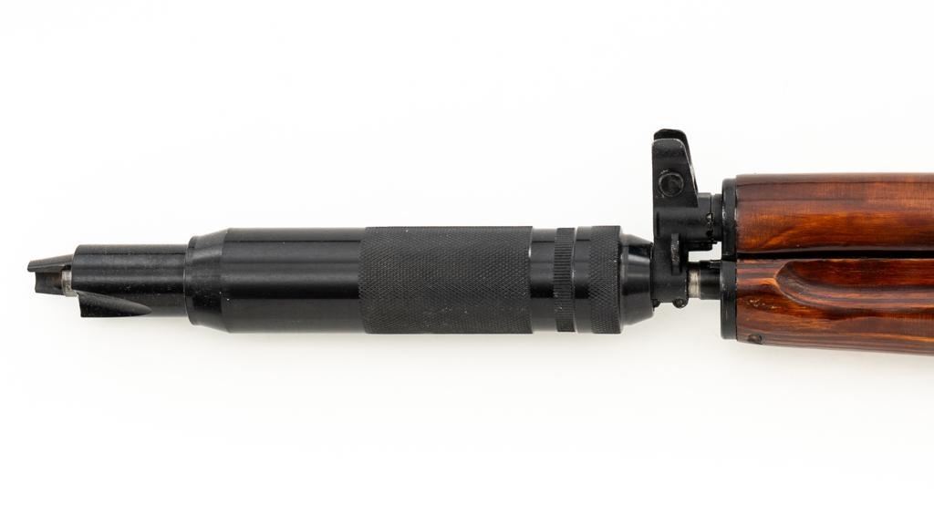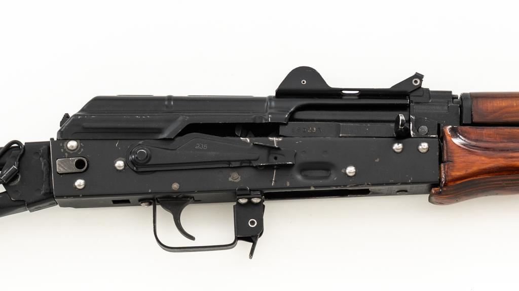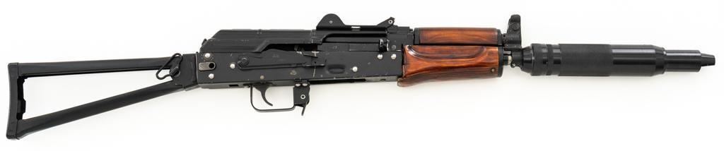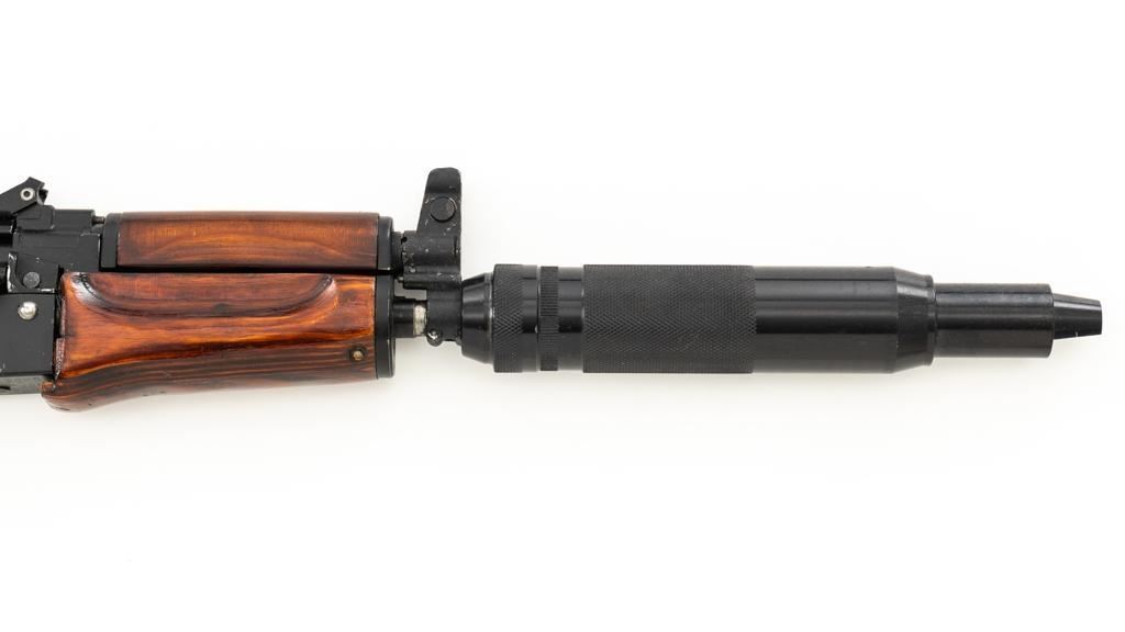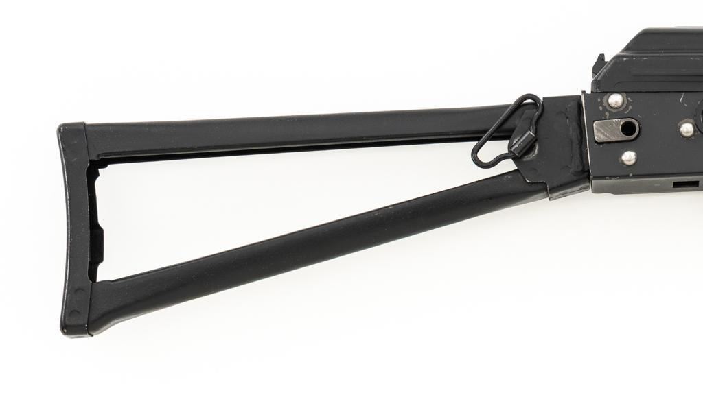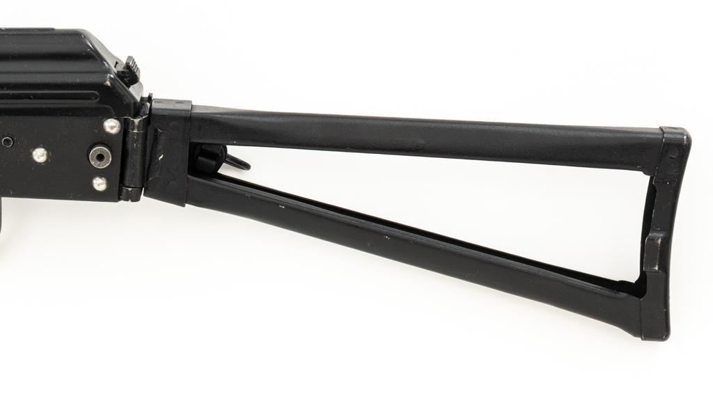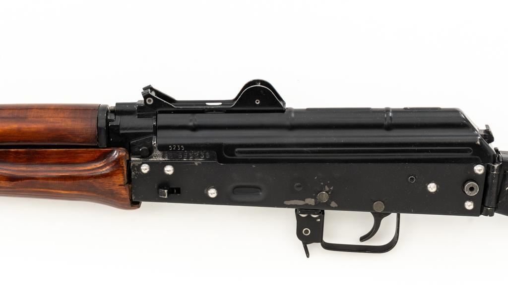 Tula AKS-74U Krinkov Kit Build Nodak Semi-Automatic Rifle, #K001798, 5.45x39 cal., 16.25" barrel. Includes Faux slip over suppressor with a built in slant brake at the end. Assembled from a Tula 1986 dated all matching AKS-74U parts kit, on a Nodak NDS-2SF receiver, although the builder is unknown. Folding stock has been pinned to give an OAL of 34.5", and the pistol grip has been removed, making this a CA compliant featureless rifle. Numbers match on trunnion, top cover, safety lever, and bolt. Receiver finish is a black paint type of finish that has started to flake in wear areas and around the rivets. Original Tula parts still retain their original bright black finish. Barrel has no visible markings and is likely US made. Bore is bright. A black canvas sling and an original ''OTK 2 86'' marked Krinkov sling is included. One Tapco 10-round magazine is included. Rifle has a Tapco G2 trigger installed. Includes bag with three extra triggers, small parts, magazine baseplates, and springs. Rifle is in very good surplus condition. Action functions smoothly. Est.: $1,500-$2,000. (Modern/PPT)
