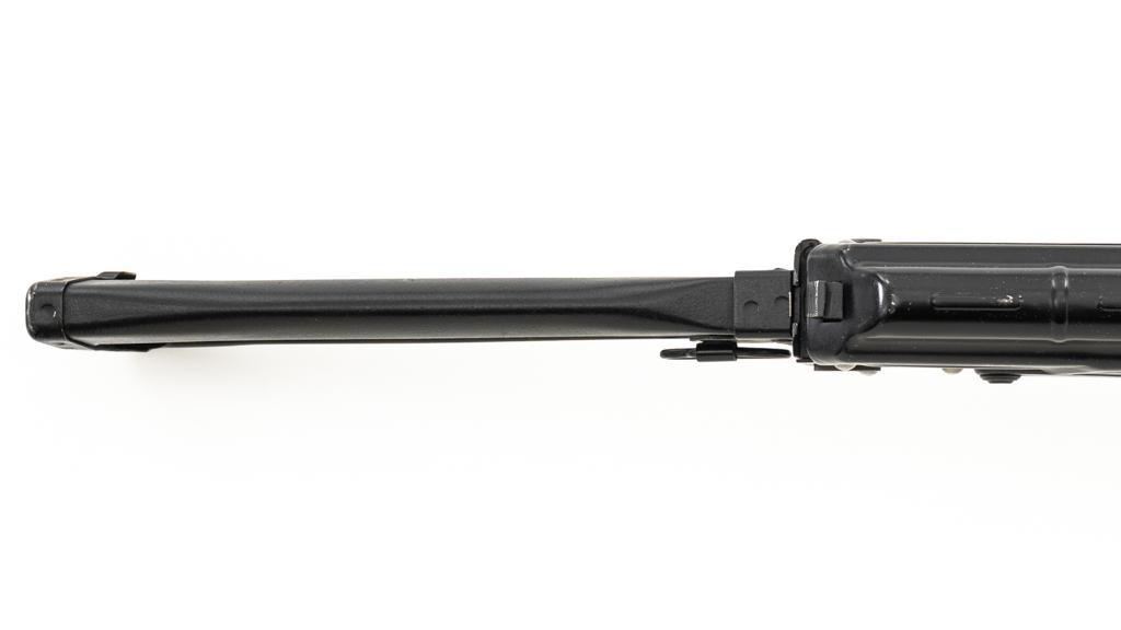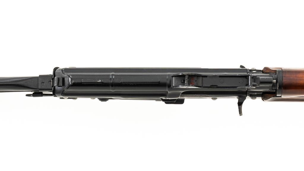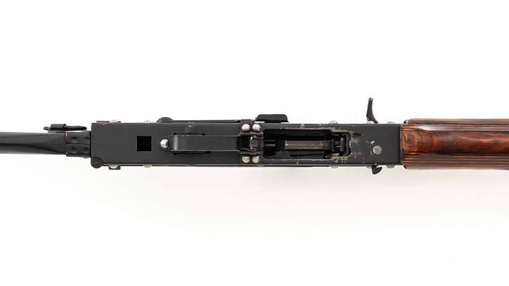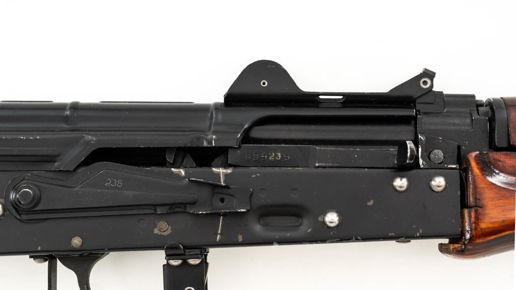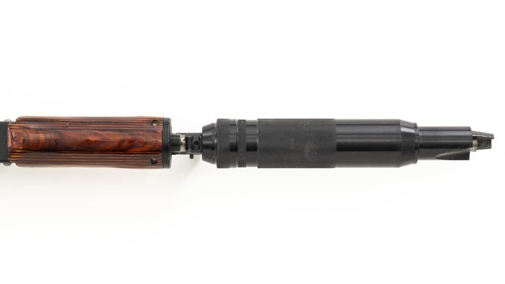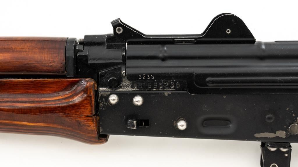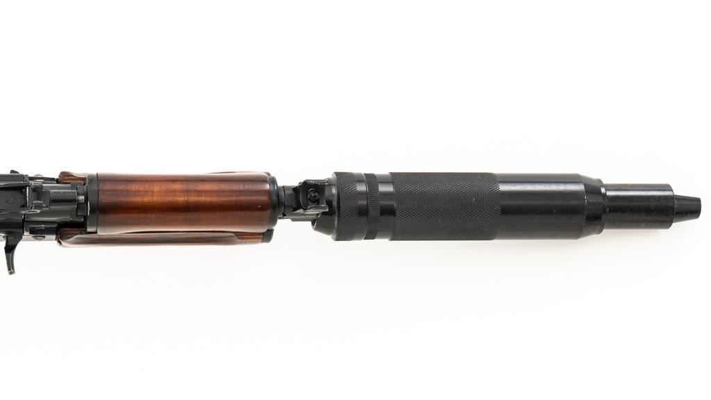 Tula AKS-74U Krinkov Kit Build Nodak Semi-Automatic Rifle, #K001798, 5.45x39 cal., 16.25" barrel. Includes Faux slip over suppressor with a built in slant brake at the end. Assembled from a Tula 1986 dated all matching AKS-74U parts kit, on a Nodak NDS-2SF receiver, although the builder is unknown. Folding stock has been pinned to give an OAL of 34.5", and the pistol grip has been removed, making this a CA compliant featureless rifle. Numbers match on trunnion, top cover, safety lever, and bolt. Receiver finish is a black paint type of finish that has started to flake in wear areas and around the rivets. Original Tula parts still retain their original bright black finish. Barrel has no visible markings and is likely US made. Bore is bright. A black canvas sling and an original ''OTK 2 86'' marked Krinkov sling is included. One Tapco 10-round magazine is included. Rifle has a Tapco G2 trigger installed. Includes bag with three extra triggers, small parts, magazine baseplates, and springs. Rifle is in very good surplus condition. Action functions smoothly. Est.: $1,500-$2,000. (Modern/PPT)