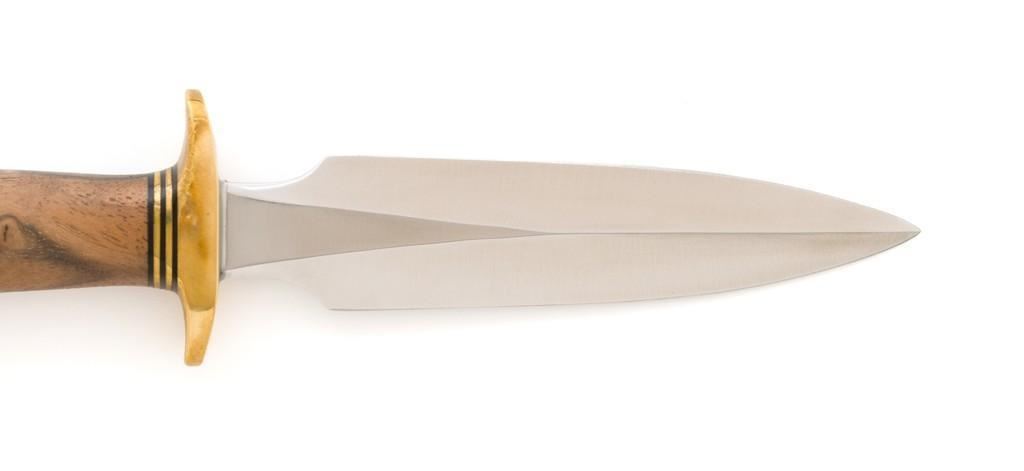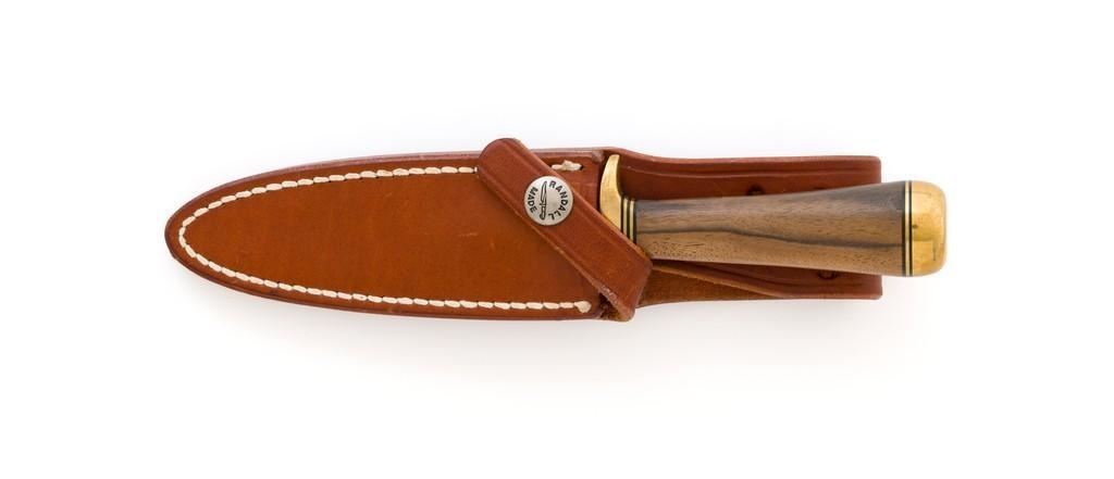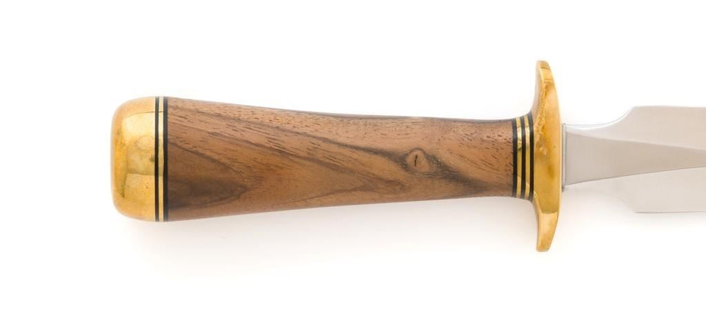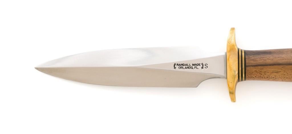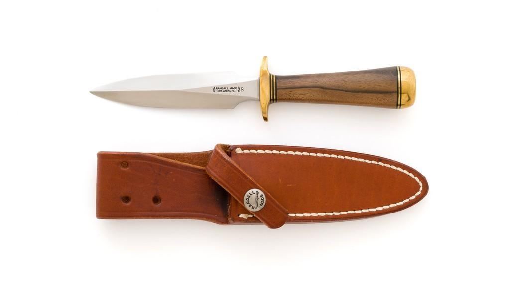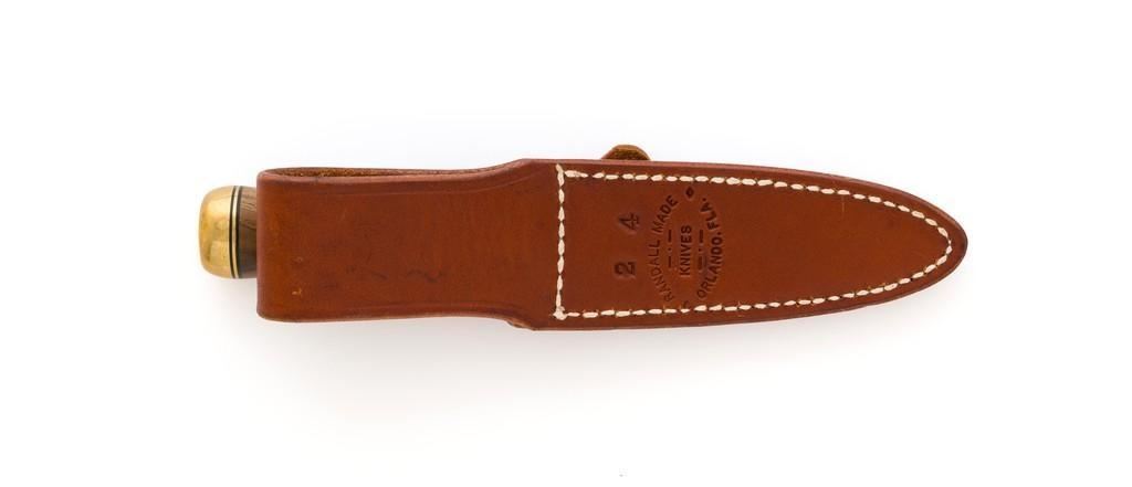 Randall Model 2-4 Stiletto Letter Opener with Sheath, 4'' double edge stainless blade is marked with Randall stainless logo. Overall length is 7.6''. Smooth walnut concave shaped handle with double hilt, brass pommel cap, with brass and black spacers. Includes brown leather Randall sheath with Randall logo and ''2 4'' on the backside; ''Randall Made'' snaps. Knife and sheath are in excellent condition. Blade with a crisp maker's mark and remains unsharpened. Brass shows mild toning. Sheath with a few light handling and storage marks. Est.: $600-$800.