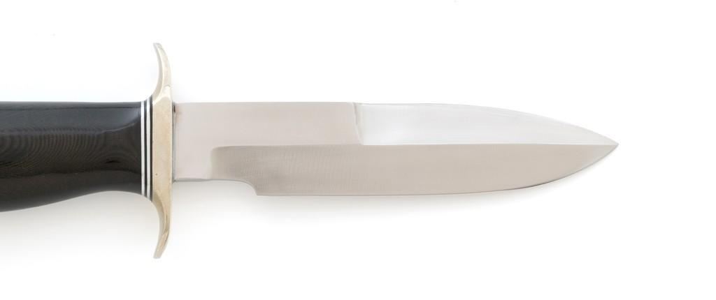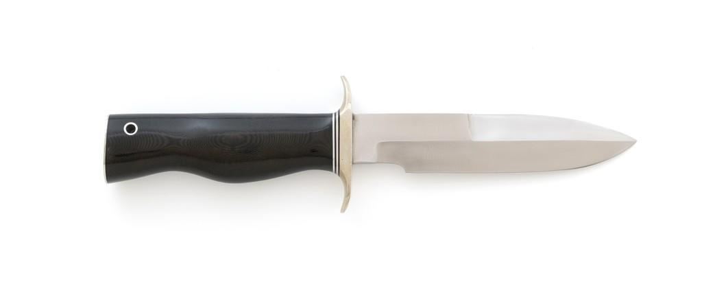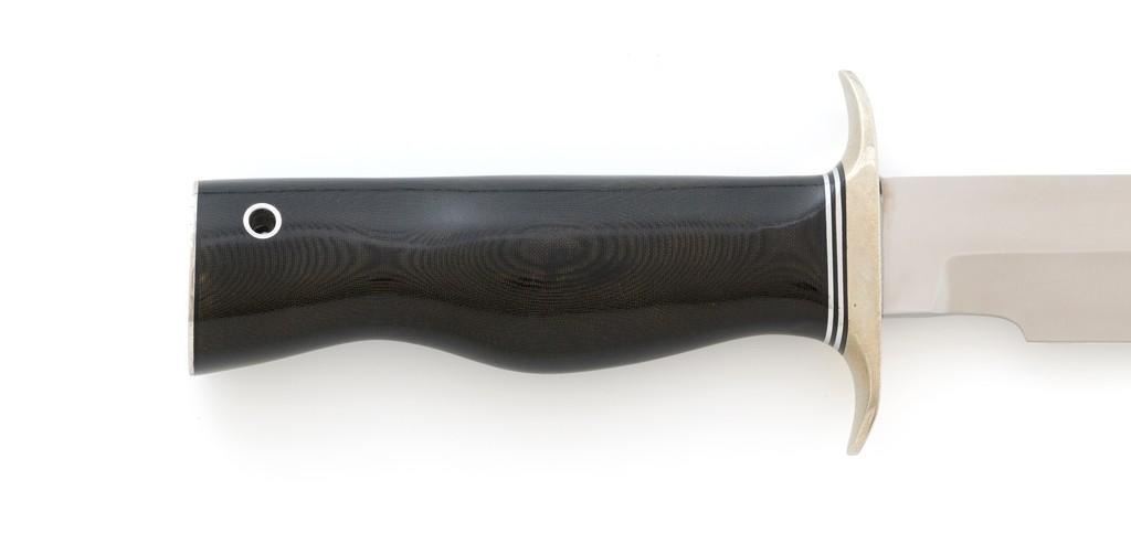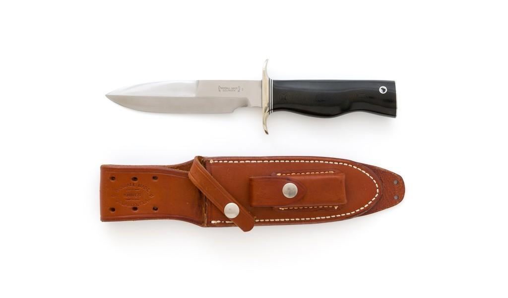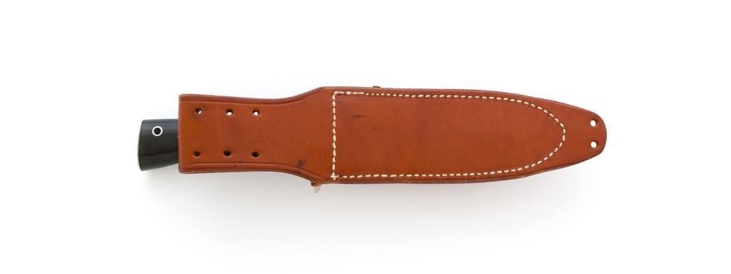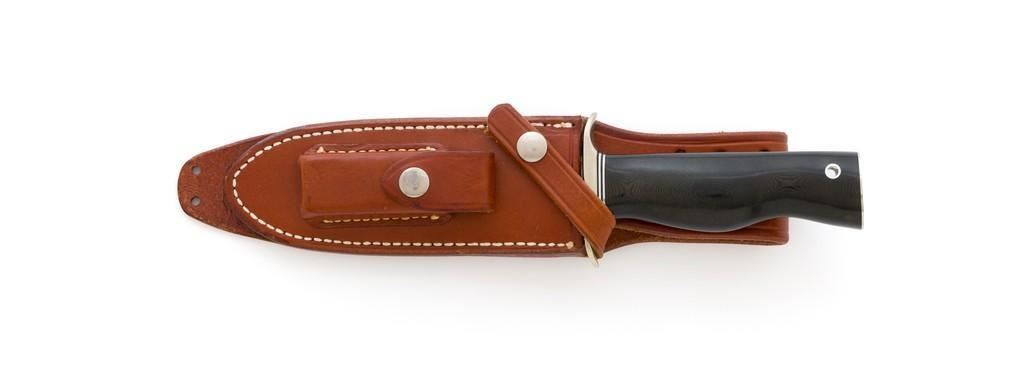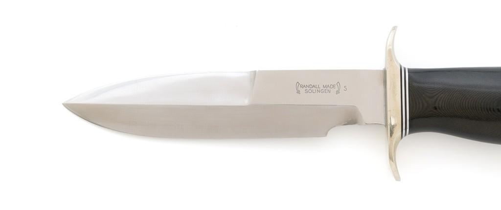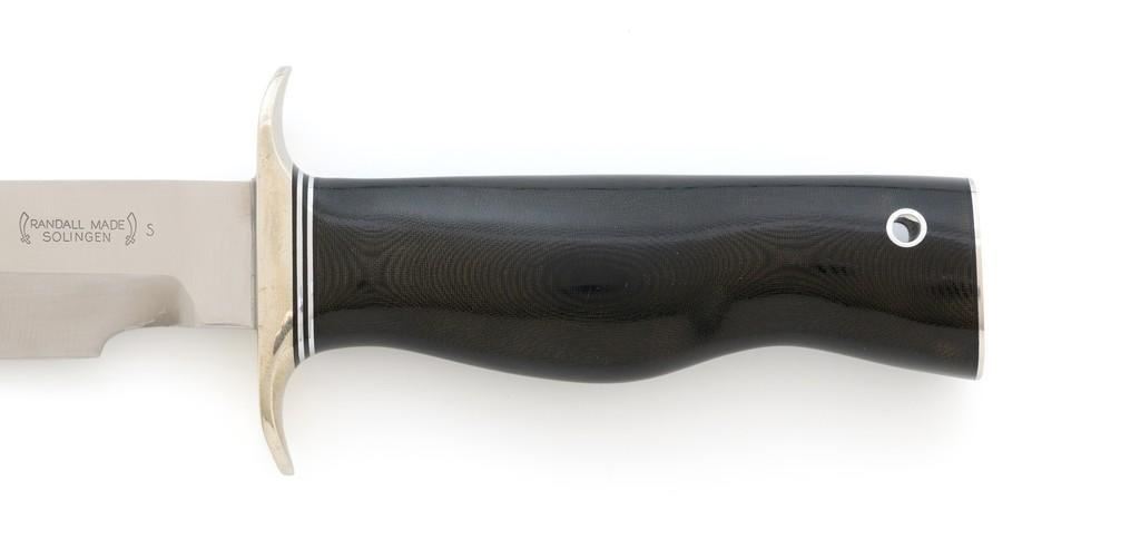 Randall ''Solingen Fighter'' Fixed Blade Knife with Sheath, 5.6'' stainless blade is marked ''Randall Made/Solingen'' with a small ''S'' outside of the logo. Overall length is 10.25''. Black micarta border patrol shaped handle with black and aluminum spacers. Nickel silver double hilt with aluminum pommel cap and wrist thong ferrule. In an original brown leather Randall Mode C style sheath, front with Randall logo, and plain stamps. Includes a ''Fine India'' sharpening stone. Knife is in excellent condition, with clear maker's mark, and remains unsharpened. Hilt shows some mild scratching and handling marks. Pommel cap with a few spots of mild discoloration. Sheath is excellent, showing a small amount of intermittent light scuffs and a few small dark spots, stitching and seams are excellent. Stone is unused. Est.: $800-$1,000.