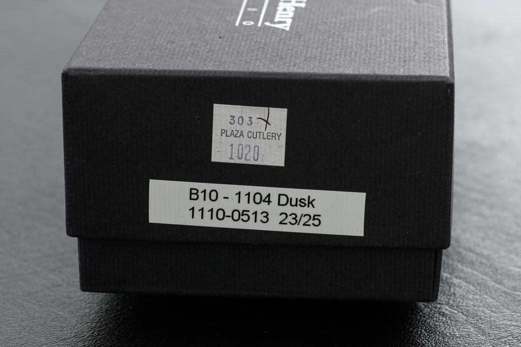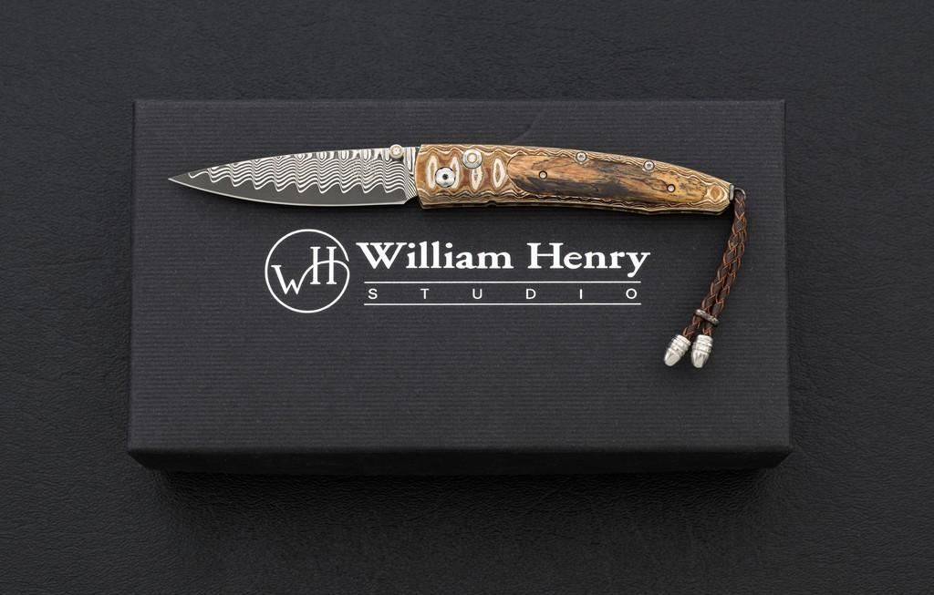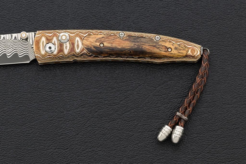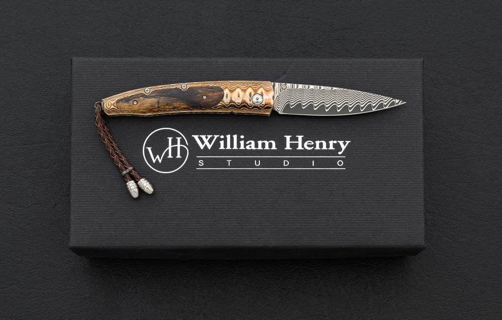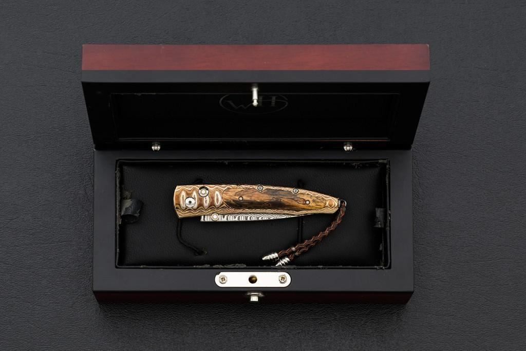 One of 25 William Henry Model B10-1104 Dusk Button Lock Folding Knife, 2.75'' ''Wave'' pattern ZDP-189 core damascus blade, 3.6'' overall closed length, white topaz inlaid thumb stud and button, heat-browned ''Wave'' mokume frame, spalted tamarind scales, stainless and titanium fittings, braided leather lanyard with stainless steel beads. Numbered 23/25 on front edge of the frame. Includes the original black WH box, wood presentation box, and matching numbered Certificate of Authenticity. Manufactured August 09, 2011. Knife is in new condition. Black box and exterior of the wood presentation box are excellent. Cover on the interior removeable panel is damaged. Est.: $1,000-$1,200.