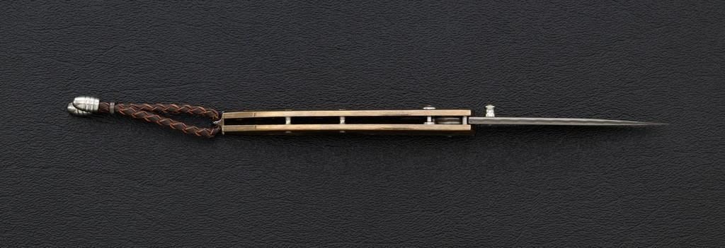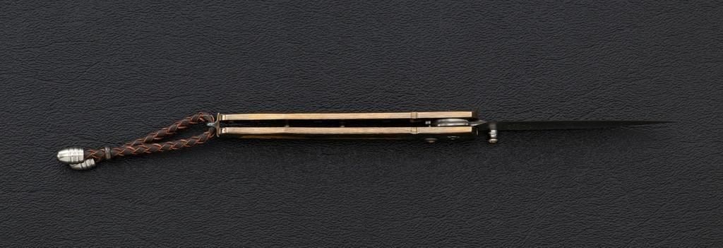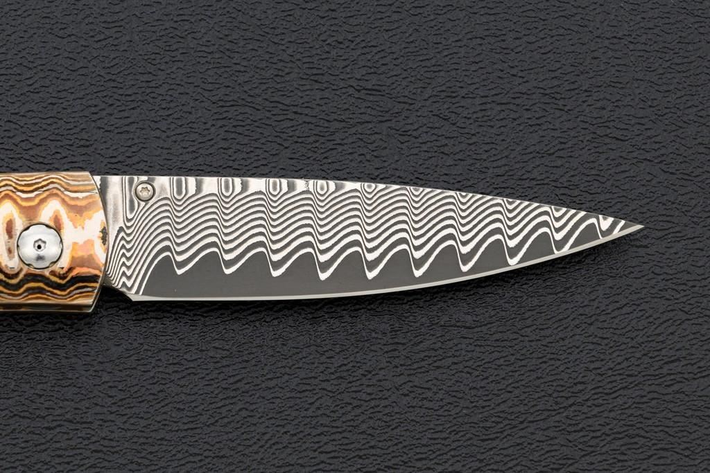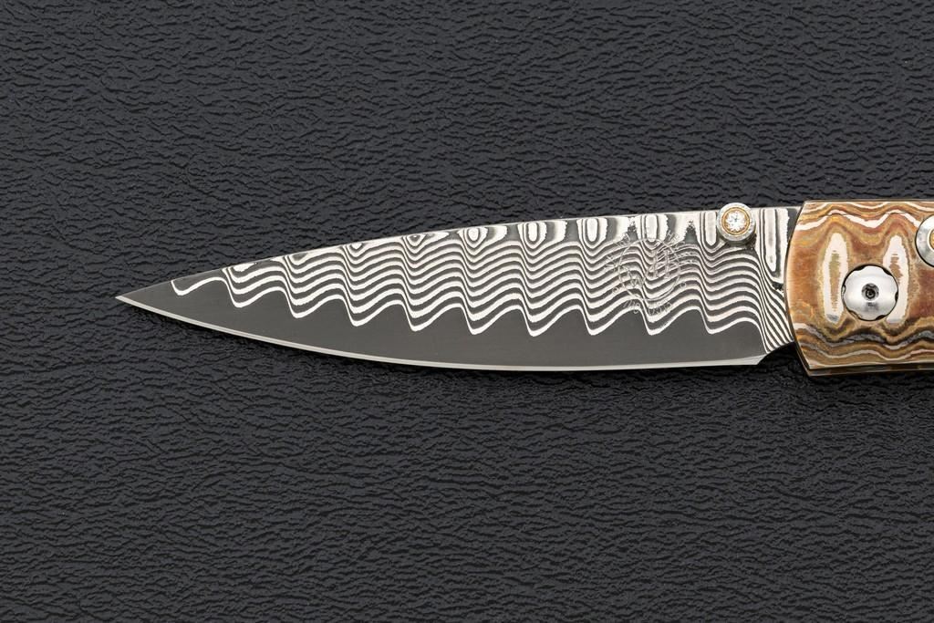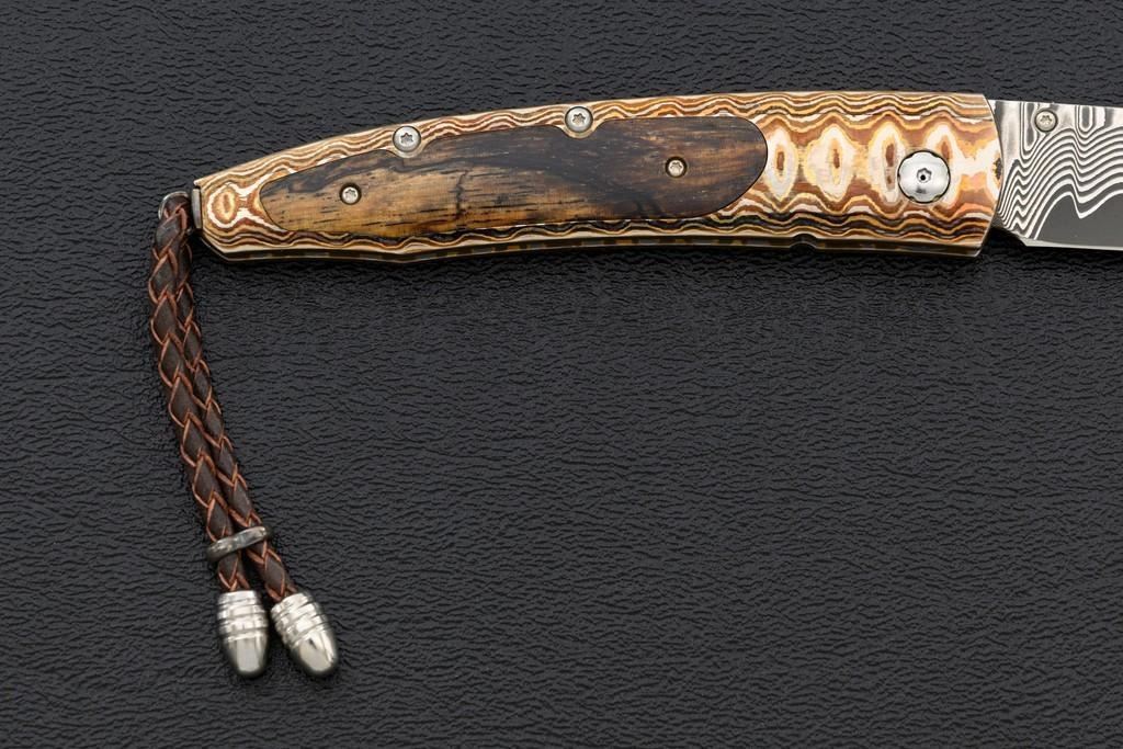 One of 25 William Henry Model B10-1104 Dusk Button Lock Folding Knife, 2.75'' ''Wave'' pattern ZDP-189 core damascus blade, 3.6'' overall closed length, white topaz inlaid thumb stud and button, heat-browned ''Wave'' mokume frame, spalted tamarind scales, stainless and titanium fittings, braided leather lanyard with stainless steel beads. Numbered 23/25 on front edge of the frame. Includes the original black WH box, wood presentation box, and matching numbered Certificate of Authenticity. Manufactured August 09, 2011. Knife is in new condition. Black box and exterior of the wood presentation box are excellent. Cover on the interior removeable panel is damaged. Est.: $1,000-$1,200.