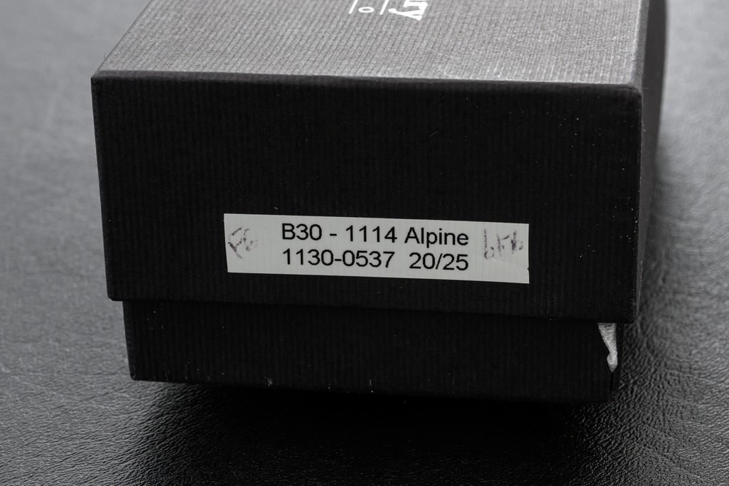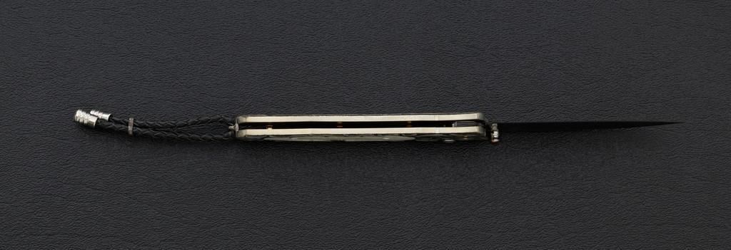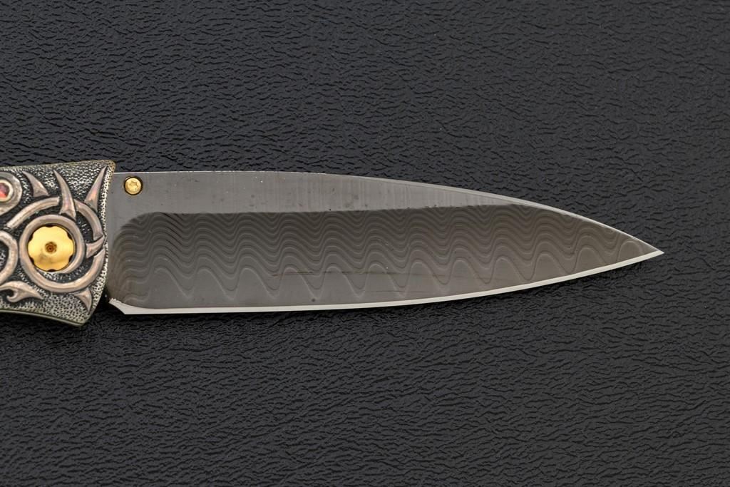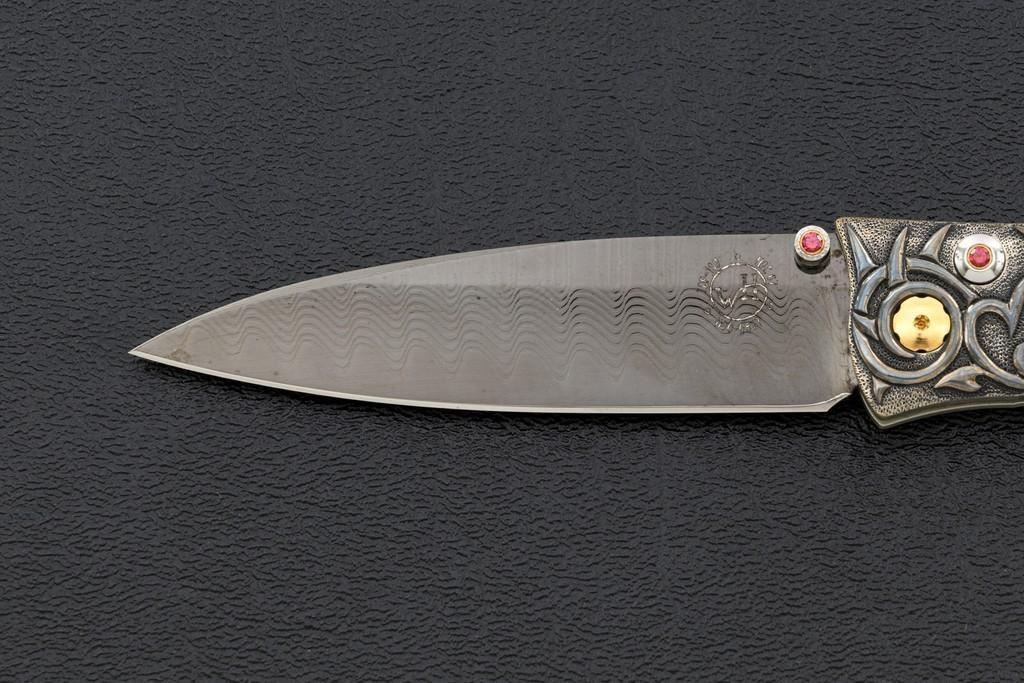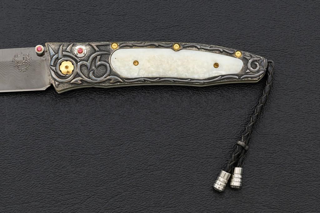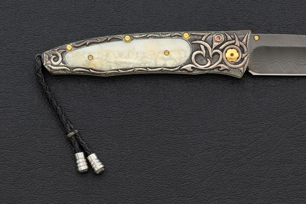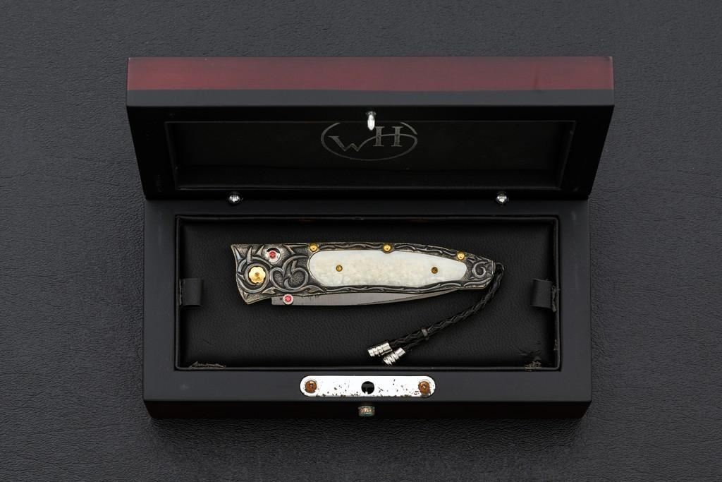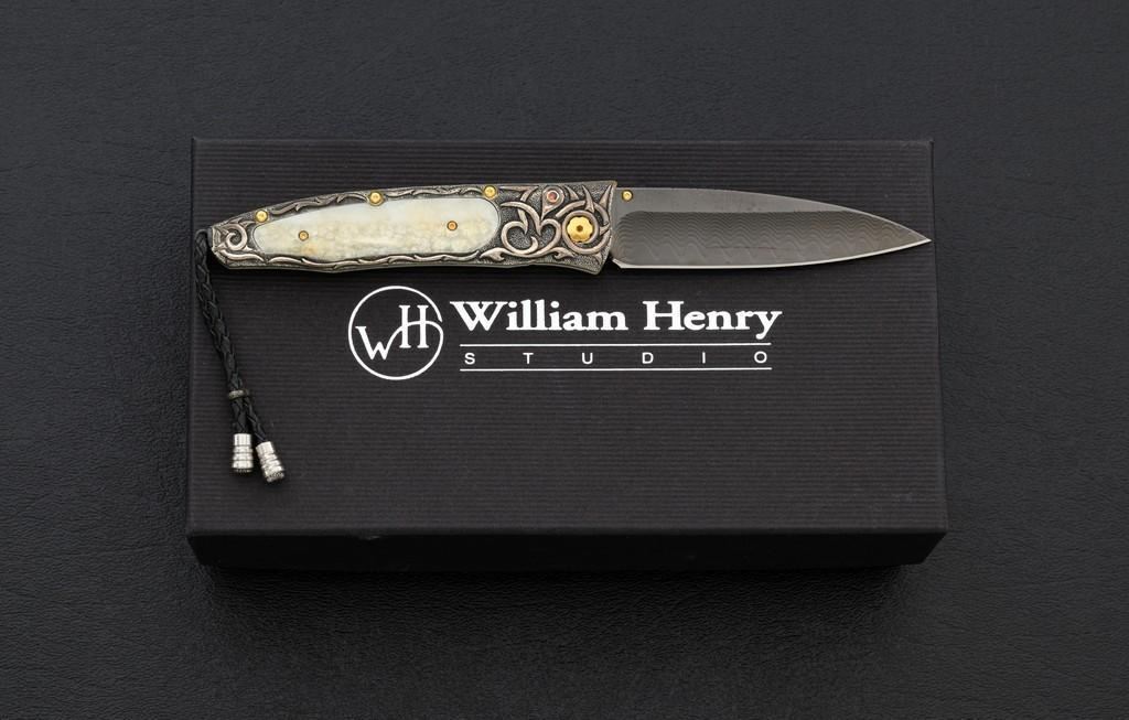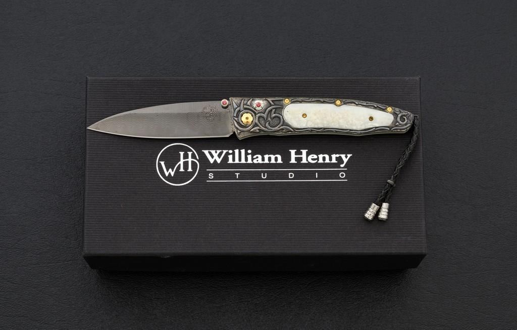 One of 25 William Henry Model B30-1114 Alpine Button Lock Folding Knife, 3.1'' black tungsten DLC coated ''Wave'' pattern damascus blade, 4'' overall closed length, corundum ruby inlaid thumb stud and button, hand-carved sterling silver and nickel frame,fossilzed scales, stainless and titanium fittings, braided leather lanyard with sterling silver beads. Numbered 20/25 on front edge of the frame. Includes the original black WH box, wood presentation box, and matching numbered Certificate of Authenticity. Manufactured January 25, 2012. Knife is in new condition. Boxes are in excellent condition. Interior of the wood box shows light wear. Est.: $1,000-$1,400.