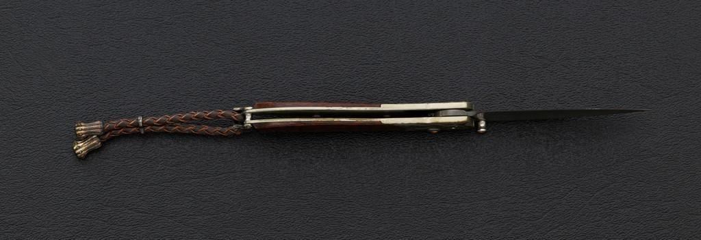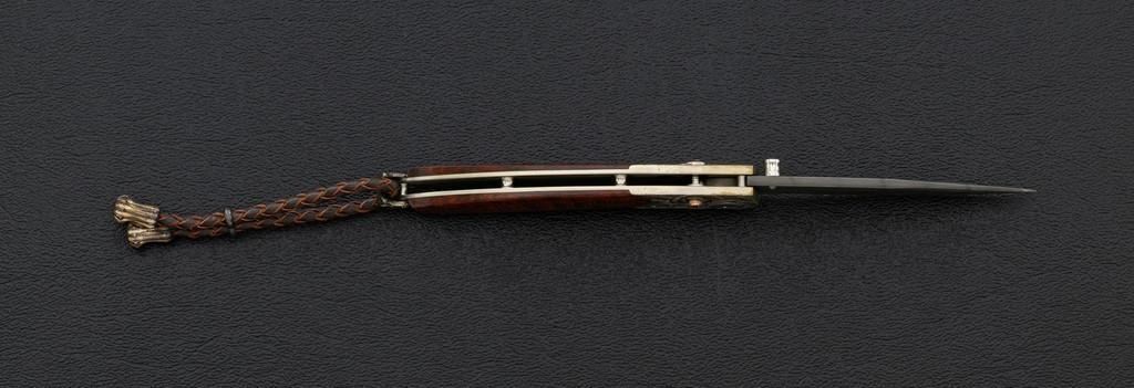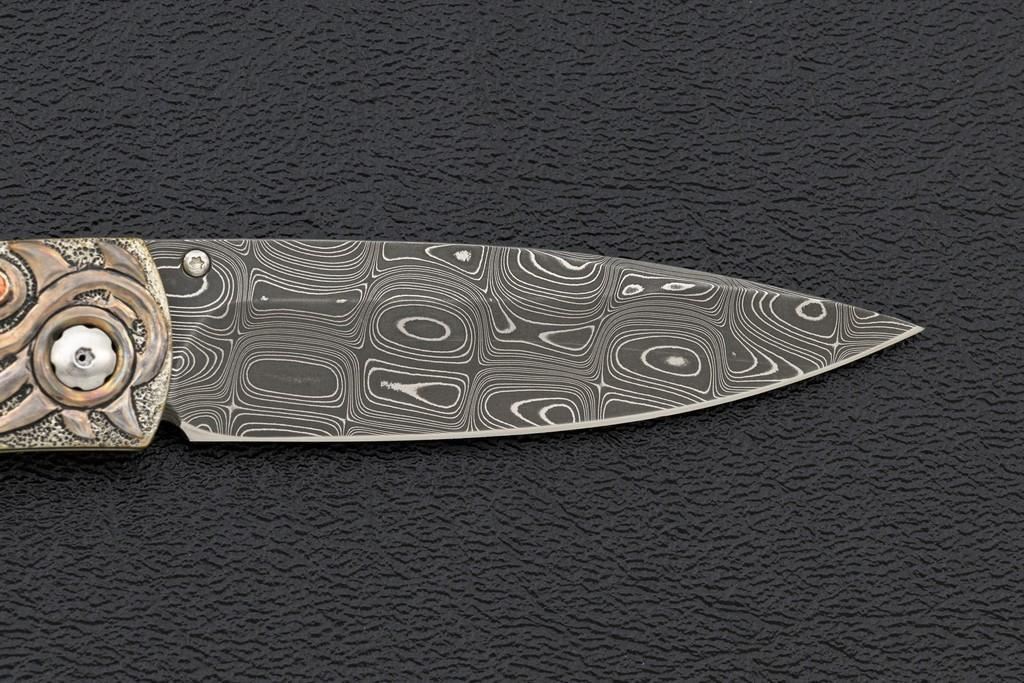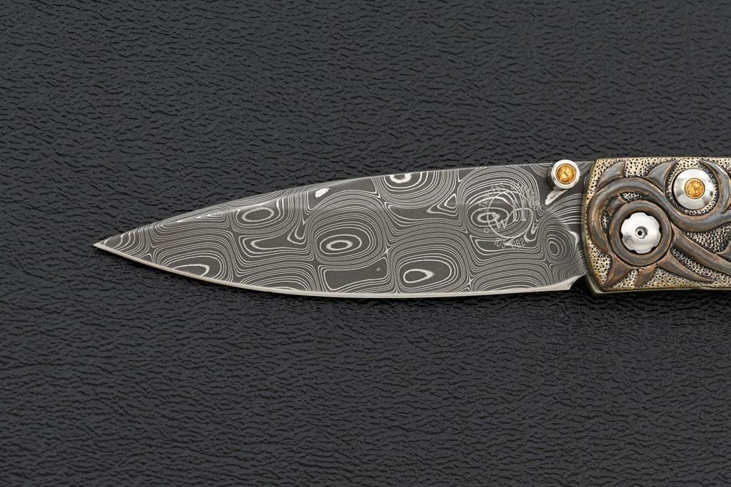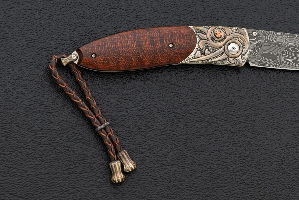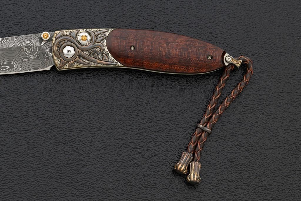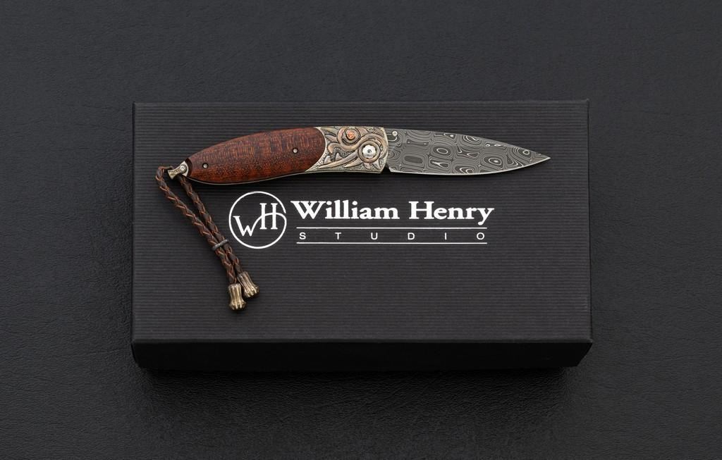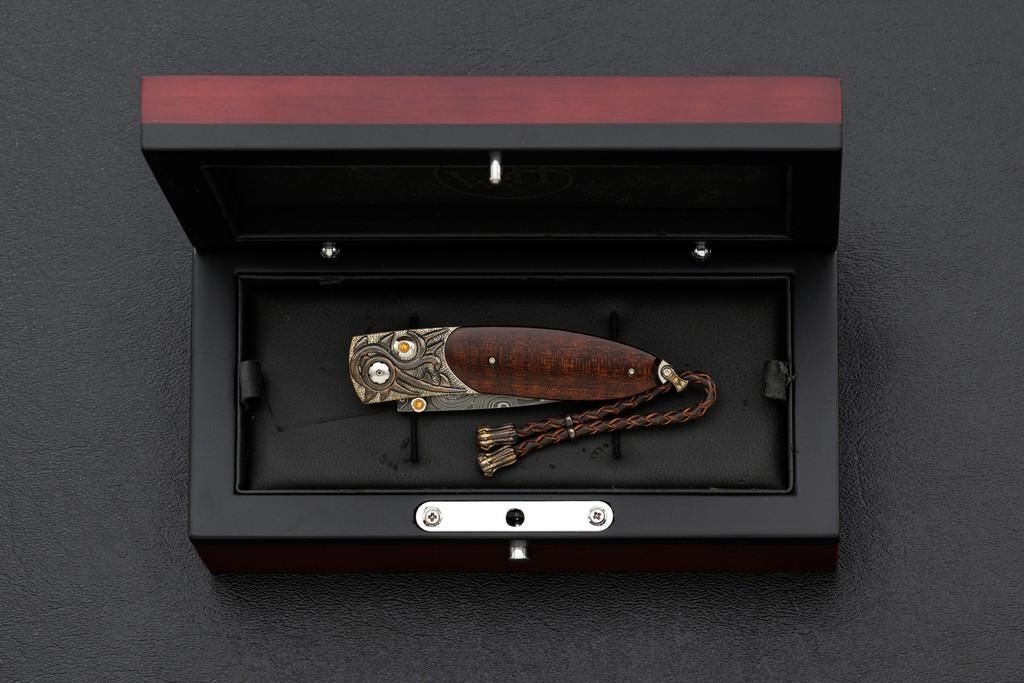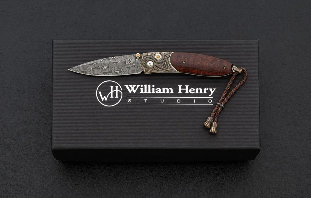 One of 25 William Henry Model B05 Rockdell Button Lock Folding Knife, 2.6'' Devin Thomas ''Typhoon'' patten damascus blade, 3.25'' overall closed length, citrine inlaid thumb stud and button, hand-carved sterling silver frame, snakewood scales, stainless and titanium fittings, braided leather lanyard with sterling silver beads. Numbered 25/25 on front edge of the frame. Includes the original black WH box, wood presentation box, black leather clipcase, and matching numbered Certificate of Authenticity. Manufactured October 29, 2010. Knife is in new condition. Exterior of the boxes are in excellent condition. The removeable interior panel of the wood presentation box has scattered scuffs and scratches. Est.: $900-$1,200.