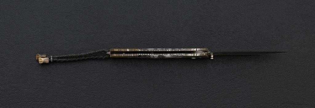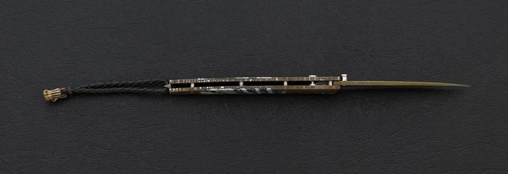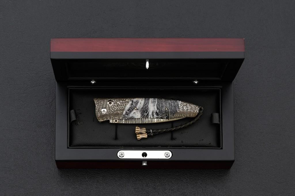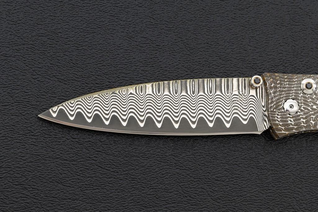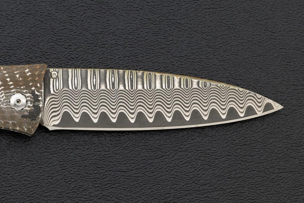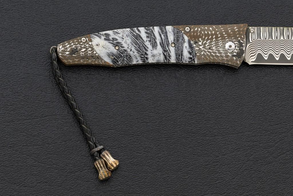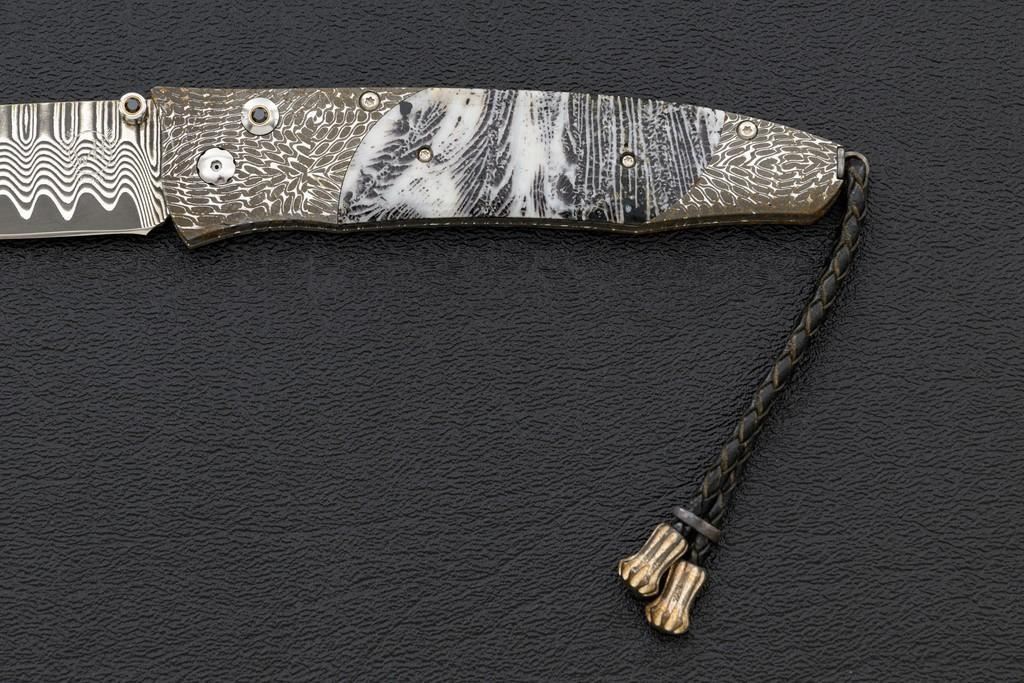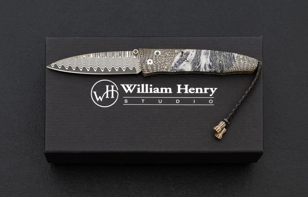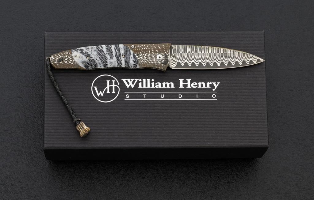 One of 100 William Henry Model B30 Archipelago Button Lock Folding Knife, 3.1'' ZPP-189 core ''Wave'' pattern damascus blade, 4'' overall closed length, spinel inlaid thumb stud and button, etched Chad Nichols ''River Rock'' pattern damascus frame, fossilized brain coral scales, stainless and titanium fittings, braided leather lanyard with sterling silver beads. Numbered 46/100 on front edge of the frame. Includes the original black WH box, wood presentation box, and matching numbered Certificate of Authenticity. Manufactured August 24, 2010. Knife is in new condition. Boxes are in excellent condition. Interior of the wood box shows moderate wear and some small losses to the black fabric cover. Est.: $1,000-$1,200.