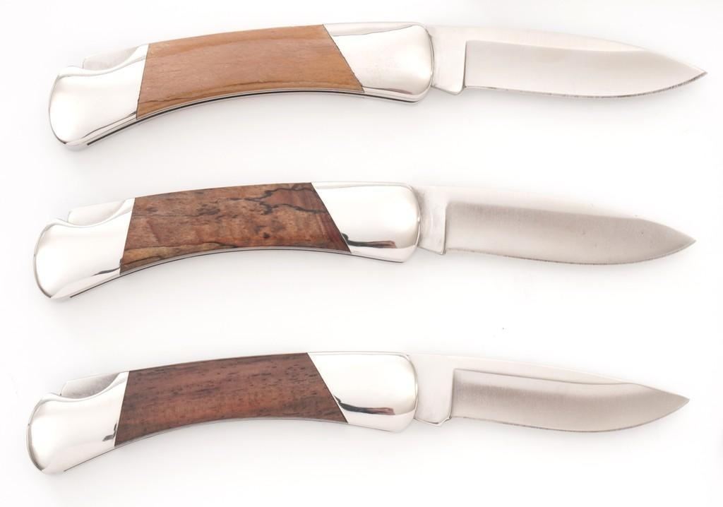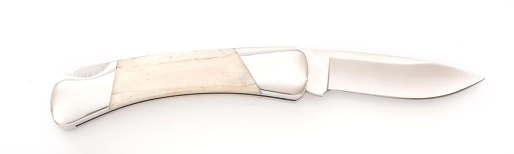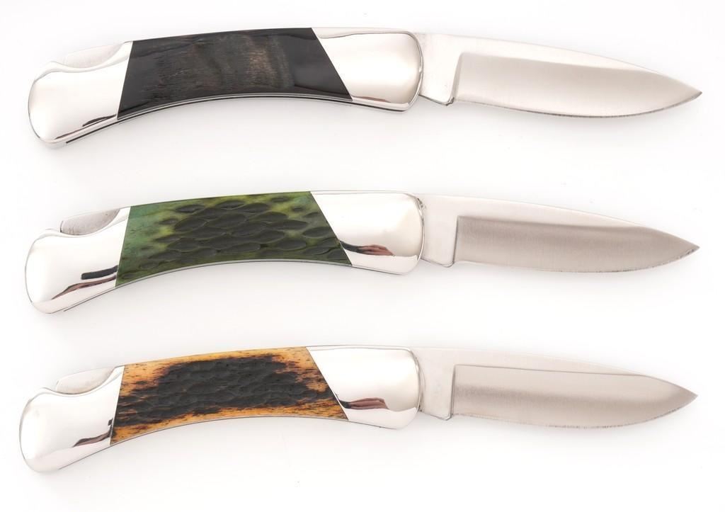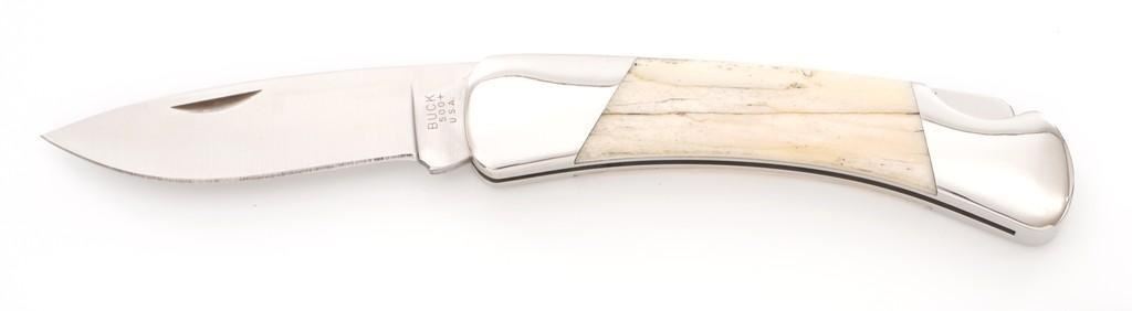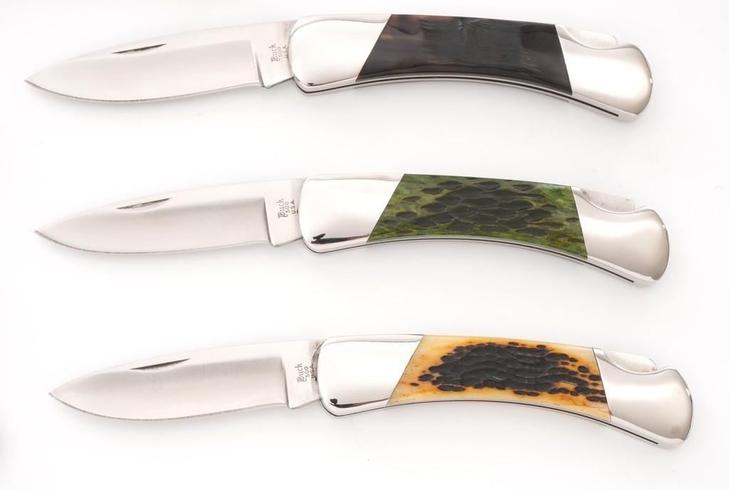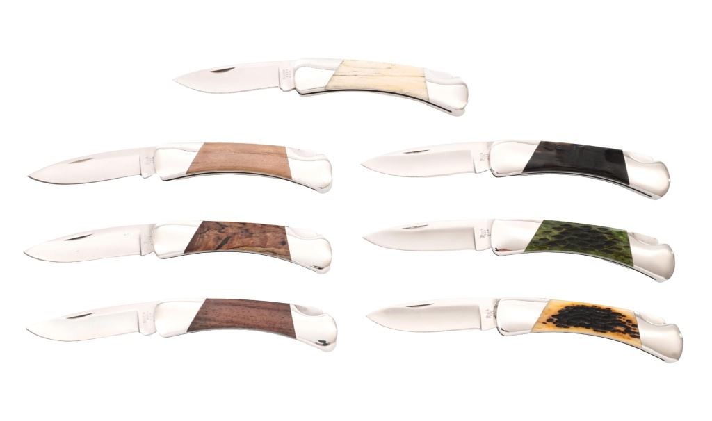 Lot of Seven (7) Custom Handled Buck Model 500 Duke Lockback Folding Knives, all have 3'' blades with three-line ''Buck(script)/500/U.S.A.'' blade stamps, nail nicks, and mirror polished bolsters. Handle materials include golden root jigged bone, fossilized bone, impala horn, bison bone, rosewood, green jigged bone, and spalted pear wood. All the knives are in excellent overall condition, blades appear unused and unsharpened. Some of the bolsters display typical minor handling marks or micro-scratching. Handles are excellent. Est.: $800-$1,200/lot.
