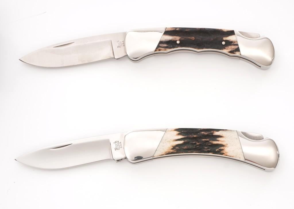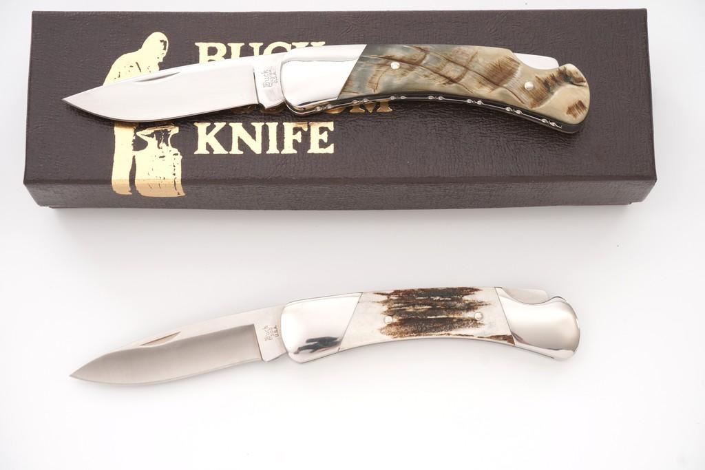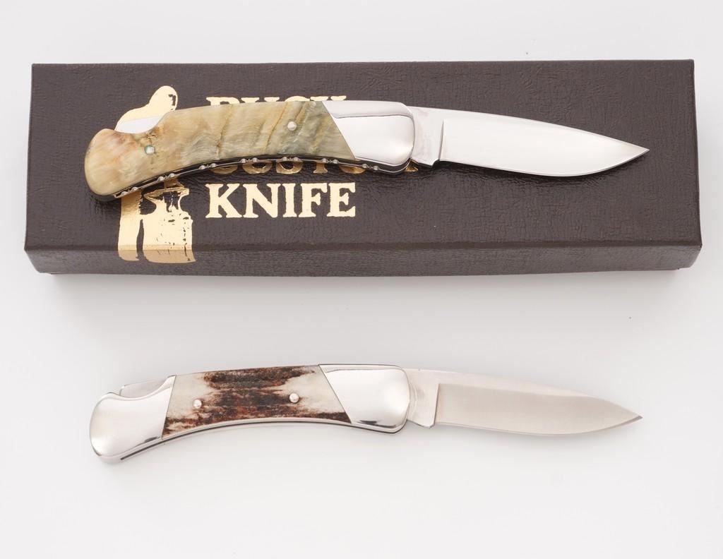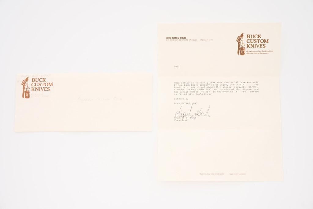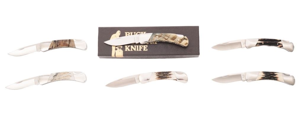 Lot of Six (6) Buck Model 500 Duke Lockback Folding Knives (Four Custom Shop), all have 3'' blades, two (2) with three-line ''Buck(script)/500/U.S.A.'' blade stamps, four (4) with three-line ''Buck(script)/CUSTOM/U.S.A.'' blade stamps; all with nail nicks and mirror polished bolsters. Custom knives with mirror polished blades. Handle materials include finger grooved sambar stag, sambar stag (custom blade stamp), sambar stag, ram's horn (custom blade stamp), moose horn (custom blade stamp), and Barbados sheep (custom blade stamp). The ram's horn knife is numbered ''365'', has file worked bolsters, and includes a two-piece brown Buck Custom Knife box and Buck factory letter. All the knives are in excellent overall condition, blades appear unused and unsharpened. Some of the bolsters display typical minor handling marks or micro-scratching. Handles are excellent. Est.: $800-$1,200/lot.