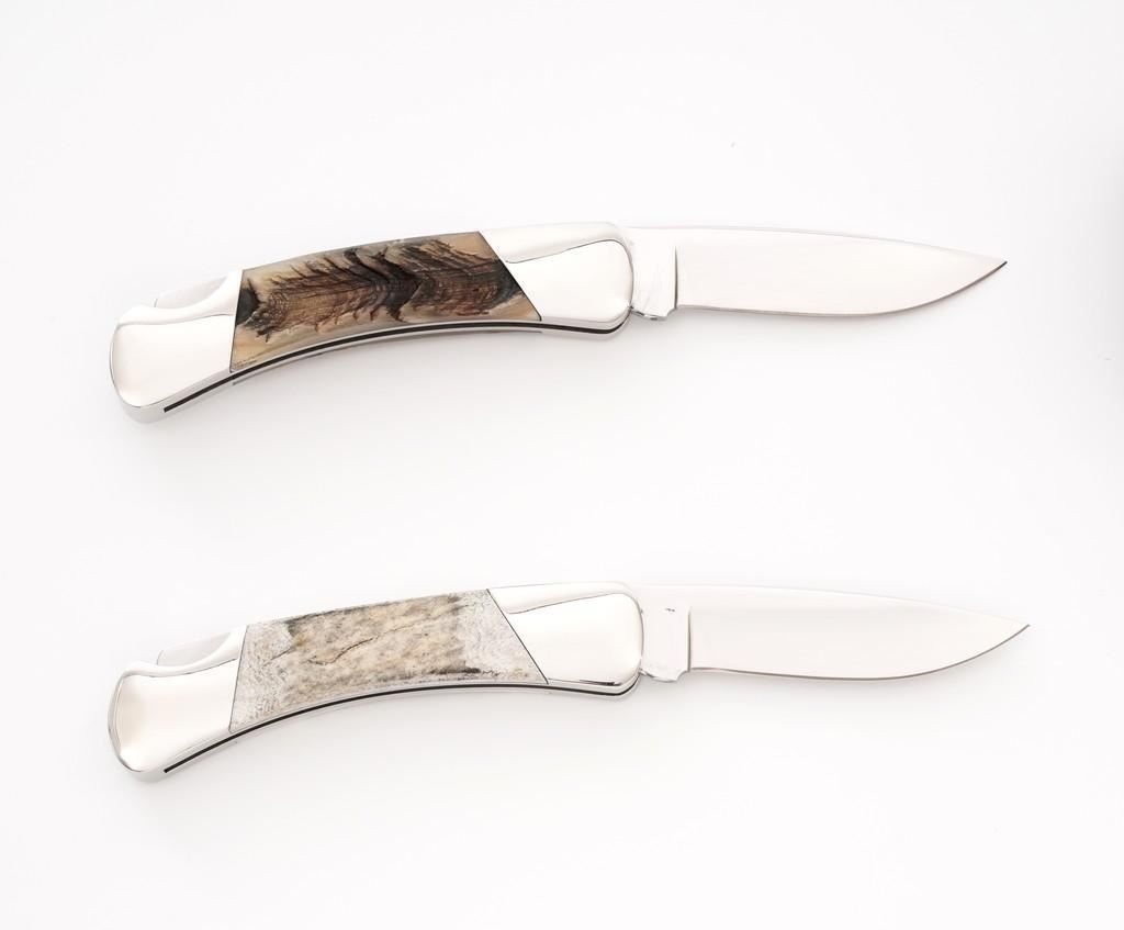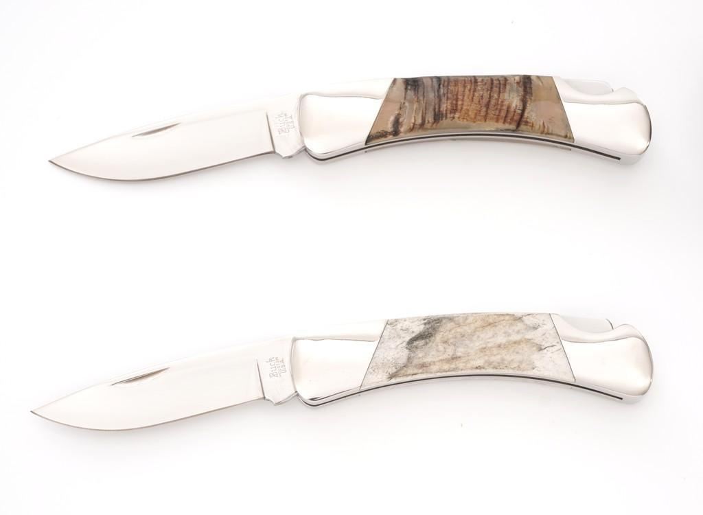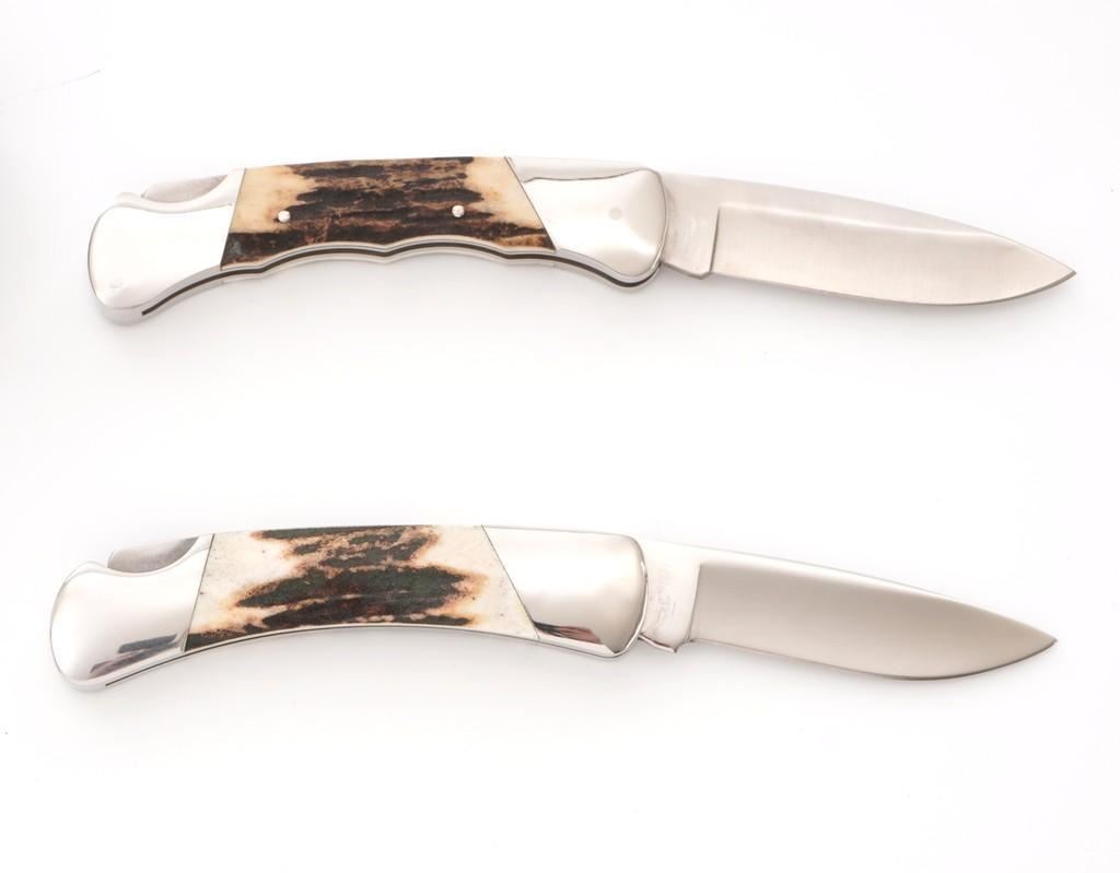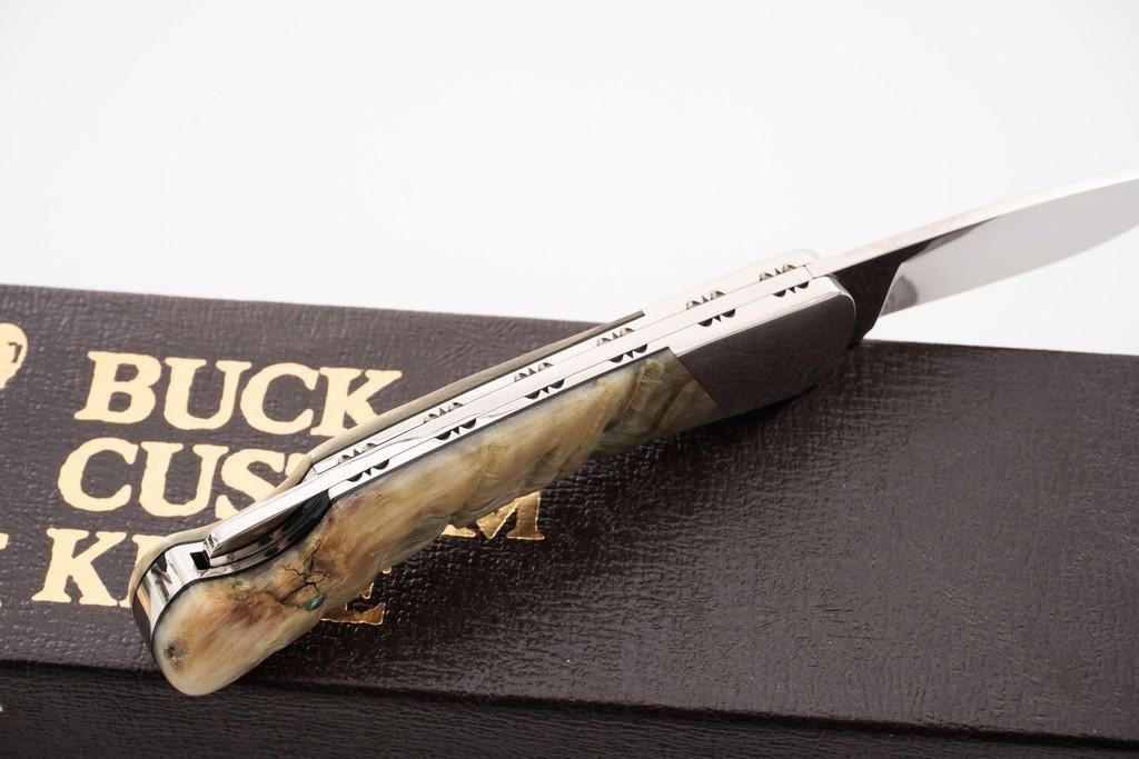 Lot of Six (6) Buck Model 500 Duke Lockback Folding Knives (Four Custom Shop), all have 3'' blades, two (2) with three-line ''Buck(script)/500/U.S.A.'' blade stamps, four (4) with three-line ''Buck(script)/CUSTOM/U.S.A.'' blade stamps; all with nail nicks and mirror polished bolsters. Custom knives with mirror polished blades. Handle materials include finger grooved sambar stag, sambar stag (custom blade stamp), sambar stag, ram's horn (custom blade stamp), moose horn (custom blade stamp), and Barbados sheep (custom blade stamp). The ram's horn knife is numbered ''365'', has file worked bolsters, and includes a two-piece brown Buck Custom Knife box and Buck factory letter. All the knives are in excellent overall condition, blades appear unused and unsharpened. Some of the bolsters display typical minor handling marks or micro-scratching. Handles are excellent. Est.: $800-$1,200/lot.