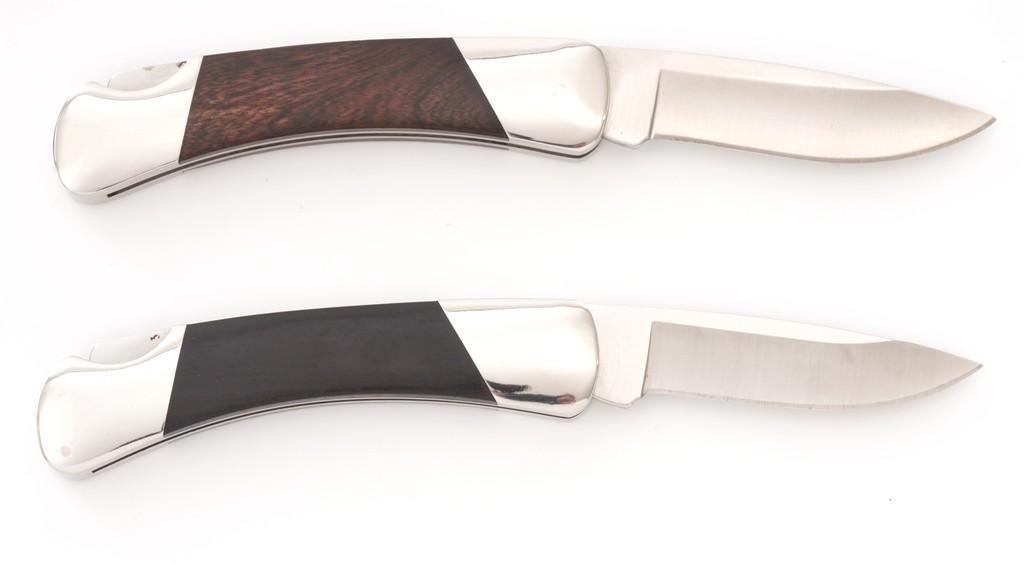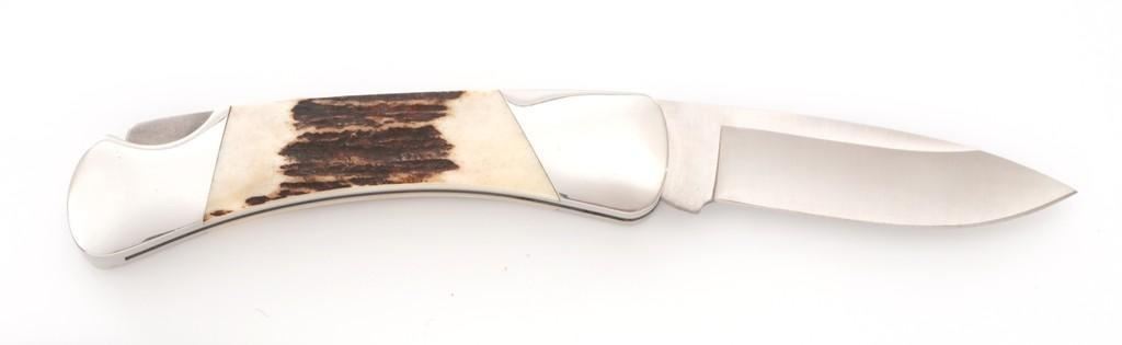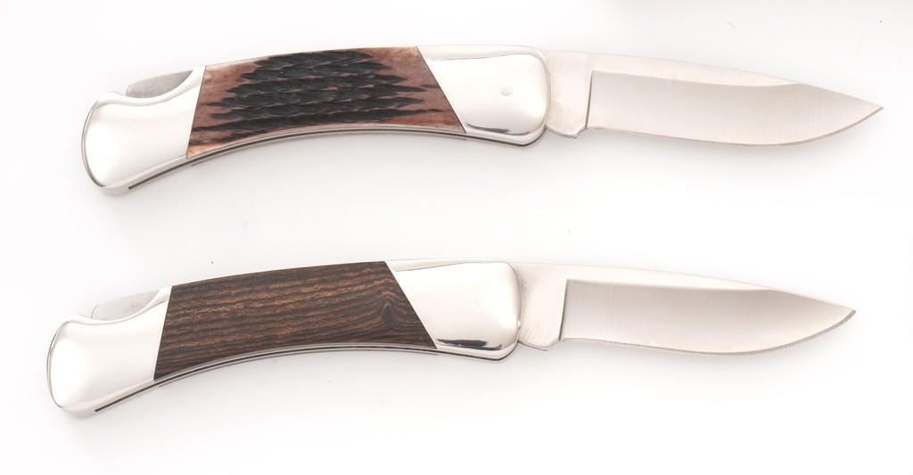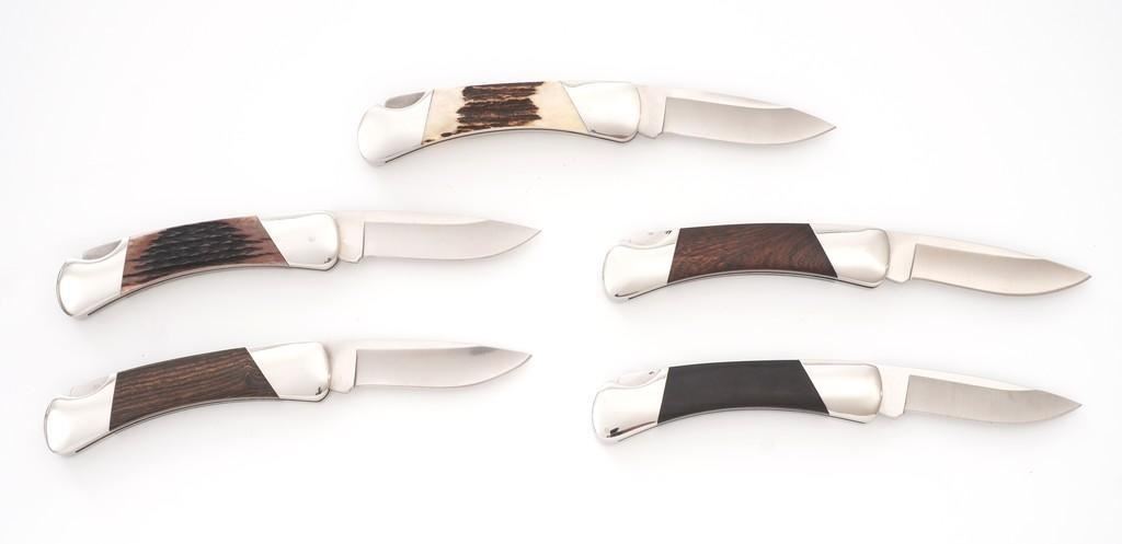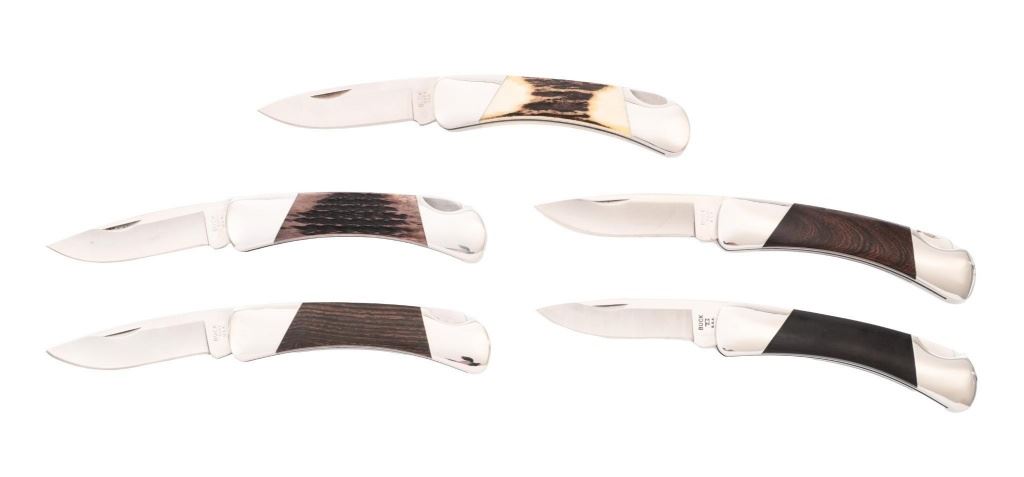 Lot of Five (5) Buck Model 500 Duke Lockback Folding Knives, all have 3'' blades, four (4) with three-line ''Buck/500/U.S.A.'' blade stamps, one is marked in three-lines ''Buck/(anvil)/U.S.A.''; all have nail nicks and mirror polished bolsters. Handle materials include macassar ebony wood, ironwood, kingwood, sambar stag, and brown jigged bone. Each knife comes with a random fabric Buck knife pouch. All the knives are in excellent overall condition, blades appear unused and unsharpened. Some of the bolsters display typical minor handling marks or micro-scratching. Handles are excellent. Est.: $600-$1,000/lot.