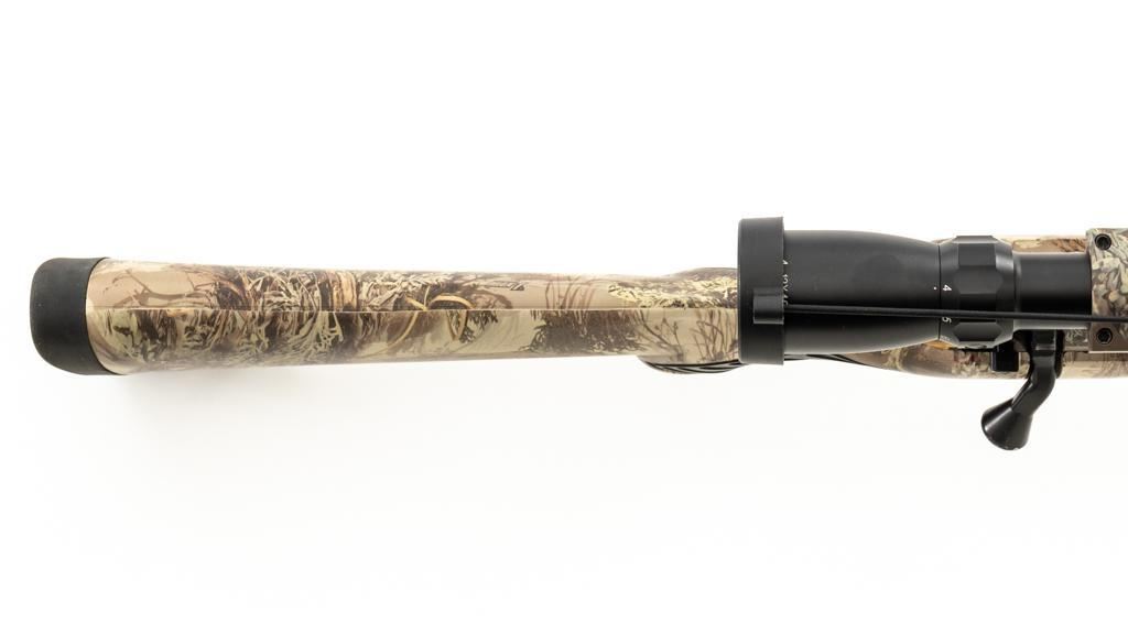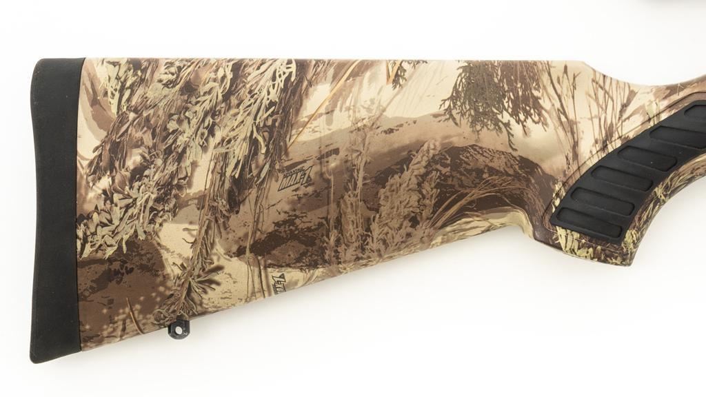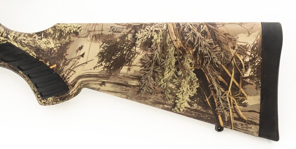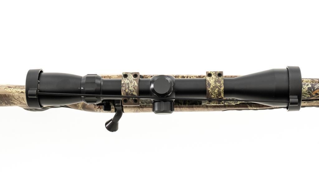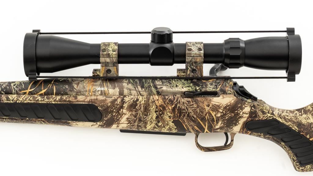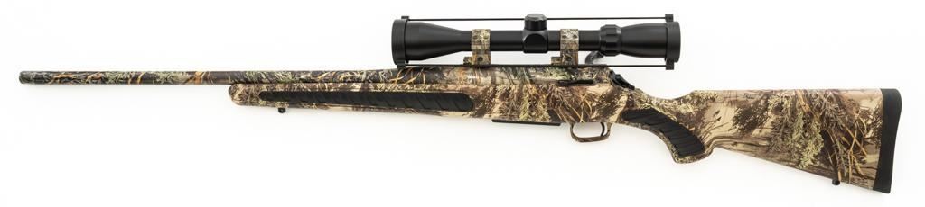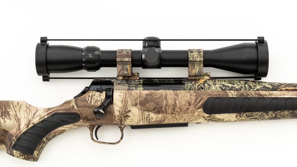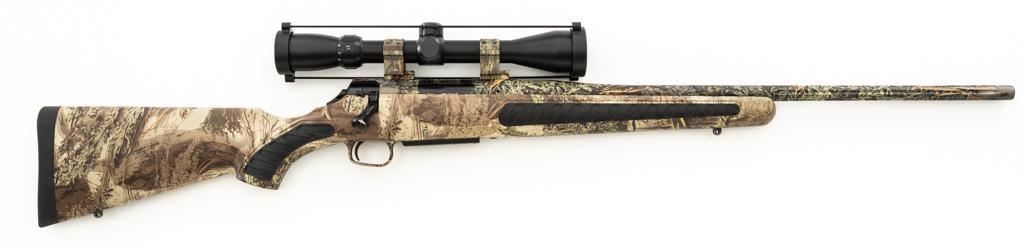 Thompson Center Venture Predator Bolt Action Rifle, #U068777, .223 Rem. cal., 22'' free-floated fluted barrel, Realtree MAX-1 Camo finish. Synthetic one-piece pistol grip stock with soft rubber inserts, also finished in Realtree camouflage, ending with a solid rubber recoil pad, providing a 13.5'' LOP. There is no provision for sights. Includes one detachable polymer three-round magazine. Rifle is topped with Weaver two-piece bases, rings, and an unmarked 4-12x variable power rifle scope, finished in matte black with a duplex reticle, and lens covers. Scope is excellent with clear, bright optics. Rifle is in excellent overall condition, showing finish loss to the bolt handle, and light wear to the rubber stock inserts. Action functions smoothly with a crisp trigger. Bore is mirror bright with excellent rifling. Est.: $400-$600. (Modern/PPT)