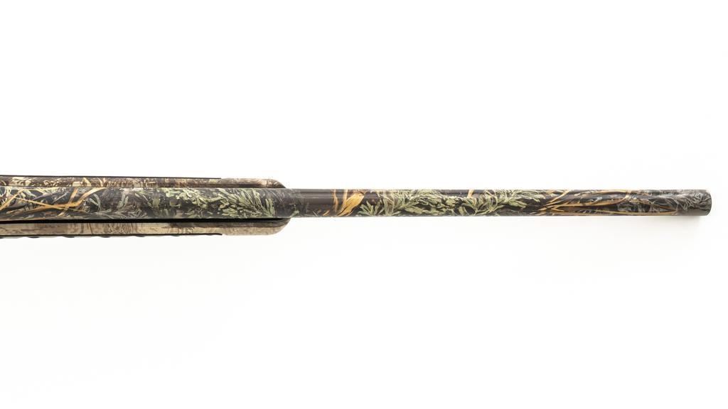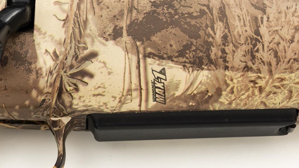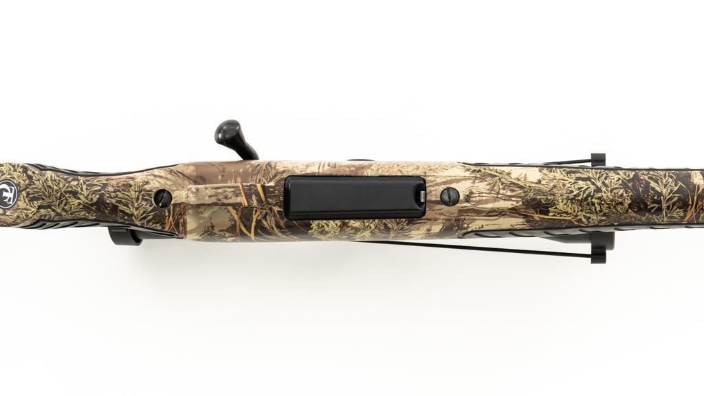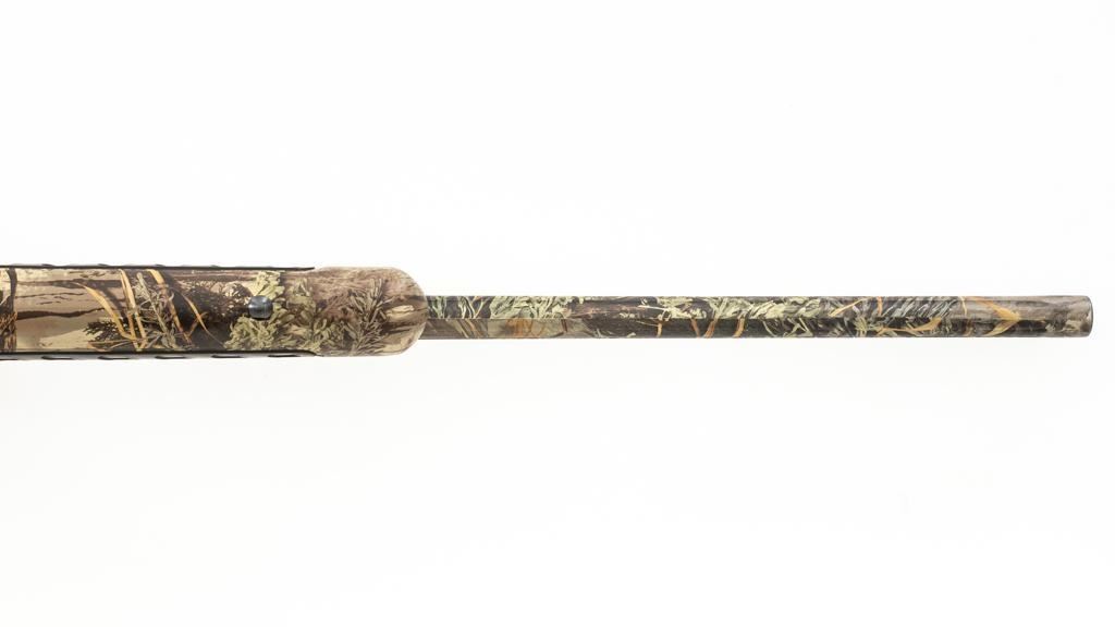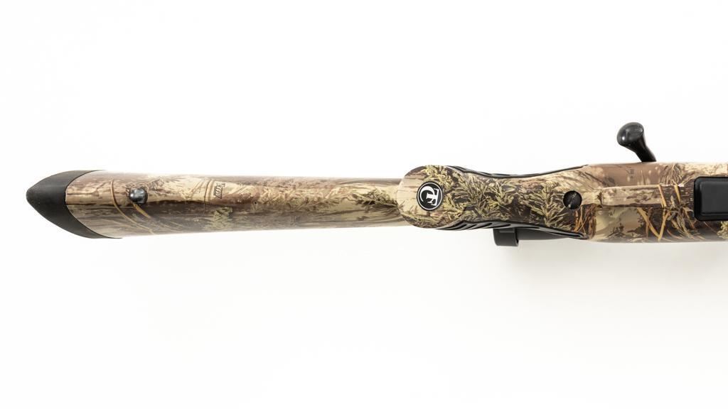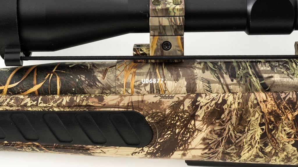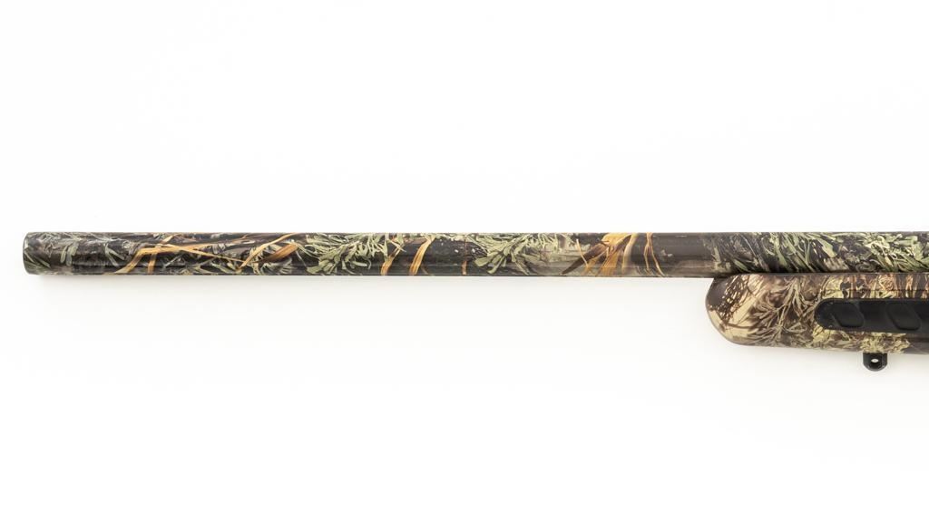 Thompson Center Venture Predator Bolt Action Rifle, #U068777, .223 Rem. cal., 22'' free-floated fluted barrel, Realtree MAX-1 Camo finish. Synthetic one-piece pistol grip stock with soft rubber inserts, also finished in Realtree camouflage, ending with a solid rubber recoil pad, providing a 13.5'' LOP. There is no provision for sights. Includes one detachable polymer three-round magazine. Rifle is topped with Weaver two-piece bases, rings, and an unmarked 4-12x variable power rifle scope, finished in matte black with a duplex reticle, and lens covers. Scope is excellent with clear, bright optics. Rifle is in excellent overall condition, showing finish loss to the bolt handle, and light wear to the rubber stock inserts. Action functions smoothly with a crisp trigger. Bore is mirror bright with excellent rifling. Est.: $400-$600. (Modern/PPT)