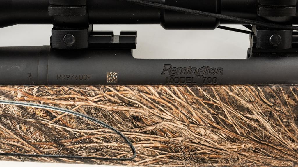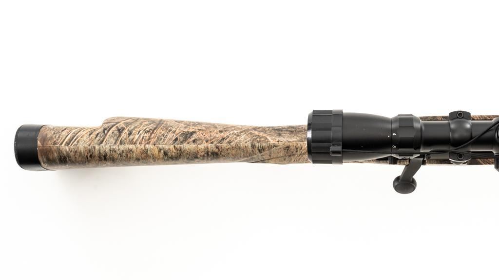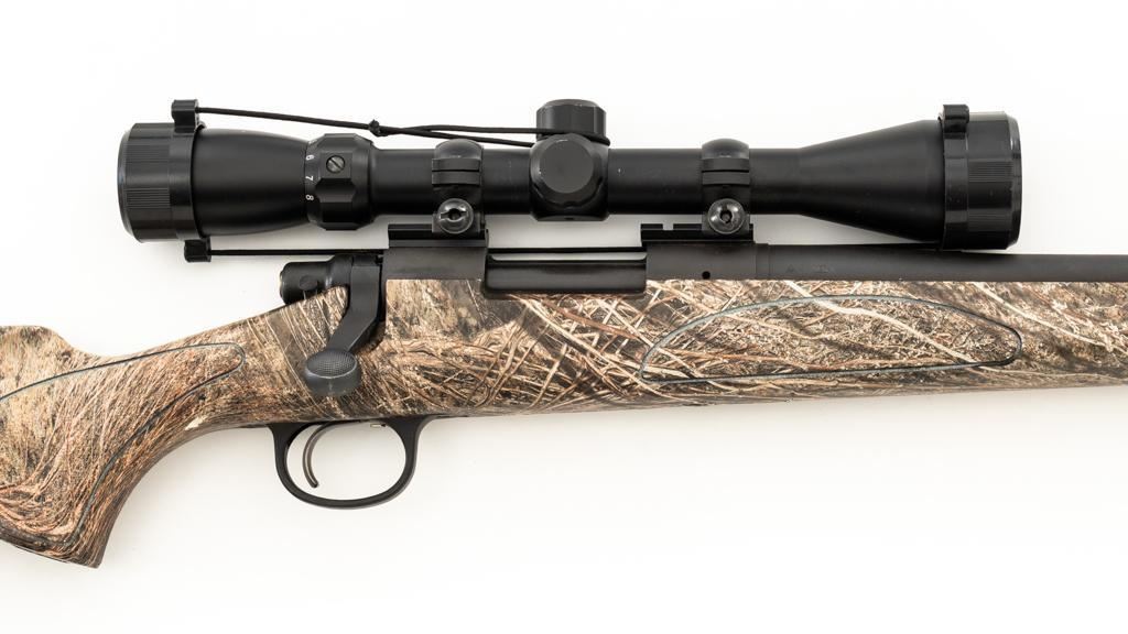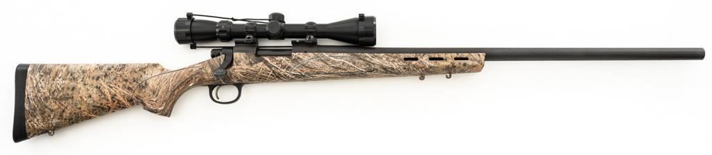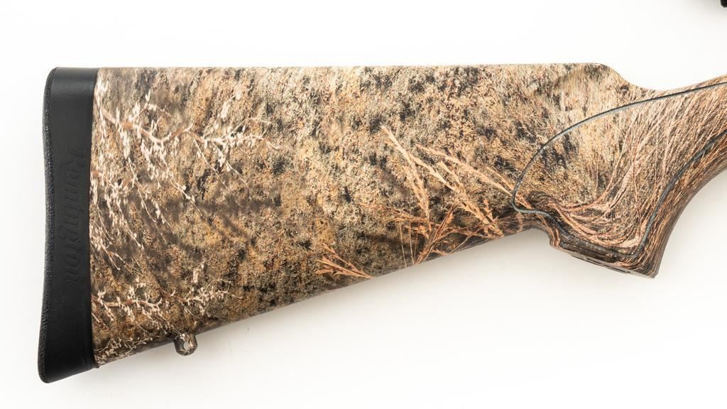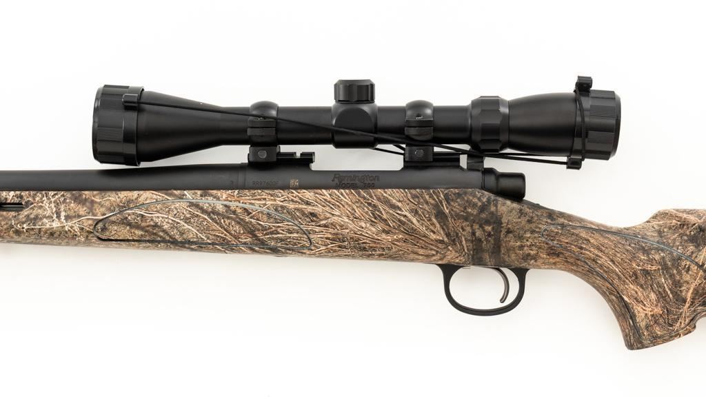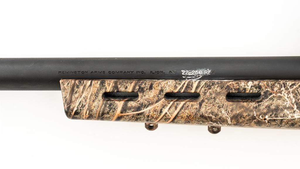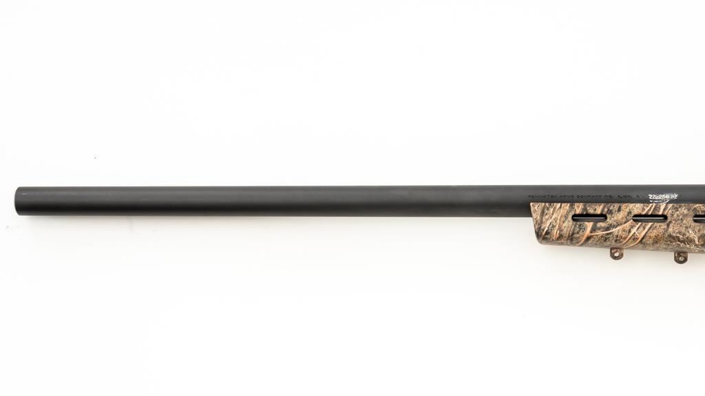 Remington Model 700 ADL Varmint Bolt Action Rifle, #RR97600F, .22-250 Rem. cal., 26'' heavy barrel, with matte finish. Checkered synthetic Mossy Oak Brush camo one-piece synthetic pistol grip stock with ventilated beavertail forend, sling swivel studs, ending with a solid black rubber recoil pad, providing a 13.25'' LOP. There is no provision for sights, with blind magazine. Rifle is topped with Weaver two-piece bases, rings, and an unmarked 4-12x40mm scope, finished in matte black with a duplex reticle. Scope is in excellent condition, with clear, bright optics. Rifle is in excellent overall condition, retaining approx. 98% factory matte finish, showing only minor handling marks. Action is smooth with a crisp trigger. Bore is mirror bright with excellent rifling. Est.: $400-$600. (Modern/PPT)