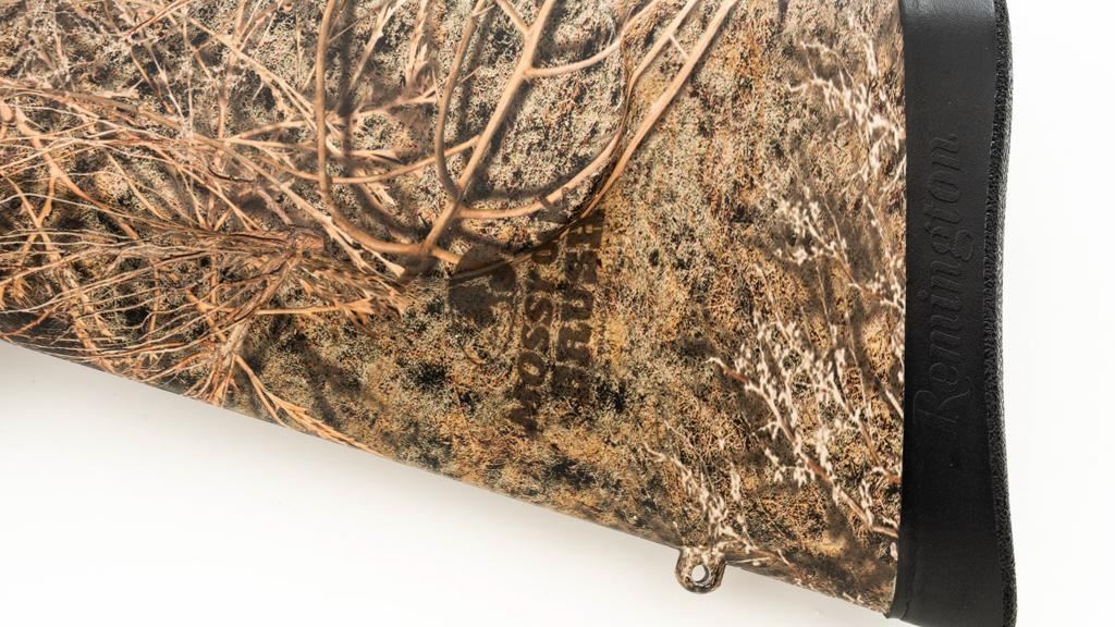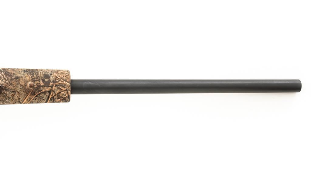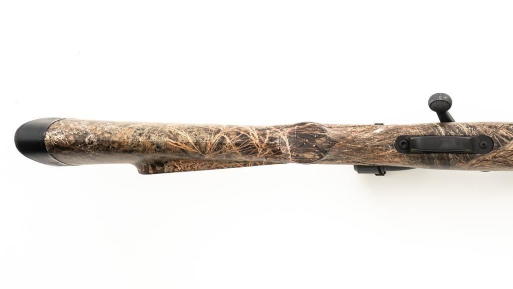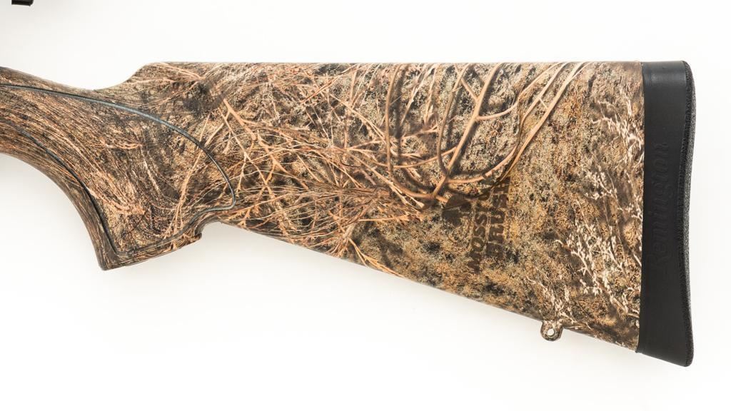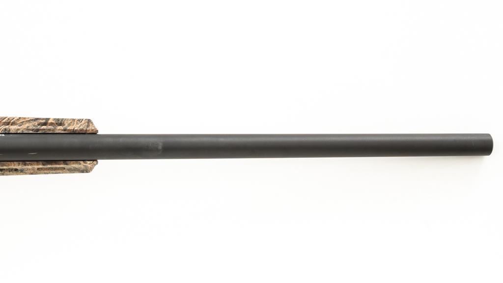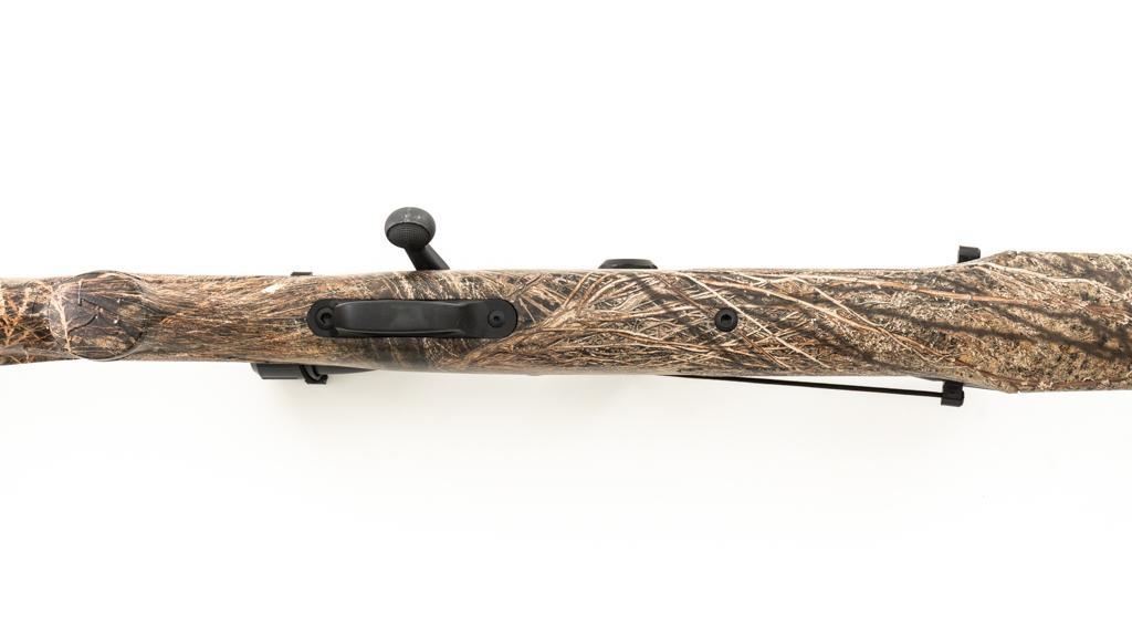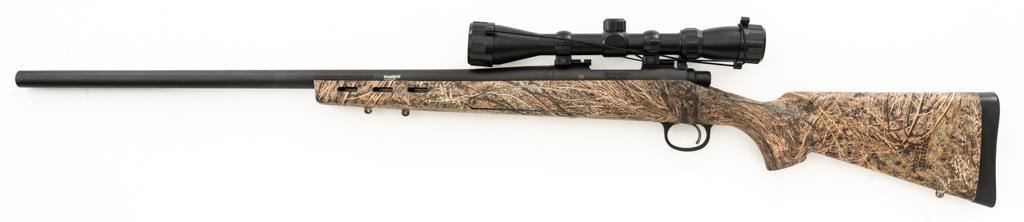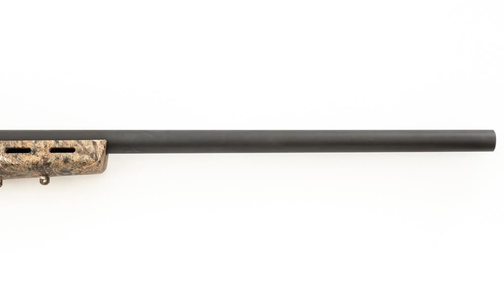 Remington Model 700 ADL Varmint Bolt Action Rifle, #RR97600F, .22-250 Rem. cal., 26'' heavy barrel, with matte finish. Checkered synthetic Mossy Oak Brush camo one-piece synthetic pistol grip stock with ventilated beavertail forend, sling swivel studs, ending with a solid black rubber recoil pad, providing a 13.25'' LOP. There is no provision for sights, with blind magazine. Rifle is topped with Weaver two-piece bases, rings, and an unmarked 4-12x40mm scope, finished in matte black with a duplex reticle. Scope is in excellent condition, with clear, bright optics. Rifle is in excellent overall condition, retaining approx. 98% factory matte finish, showing only minor handling marks. Action is smooth with a crisp trigger. Bore is mirror bright with excellent rifling. Est.: $400-$600. (Modern/PPT)