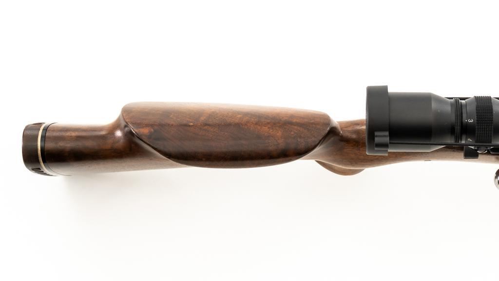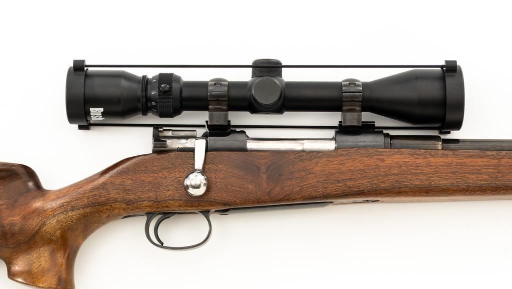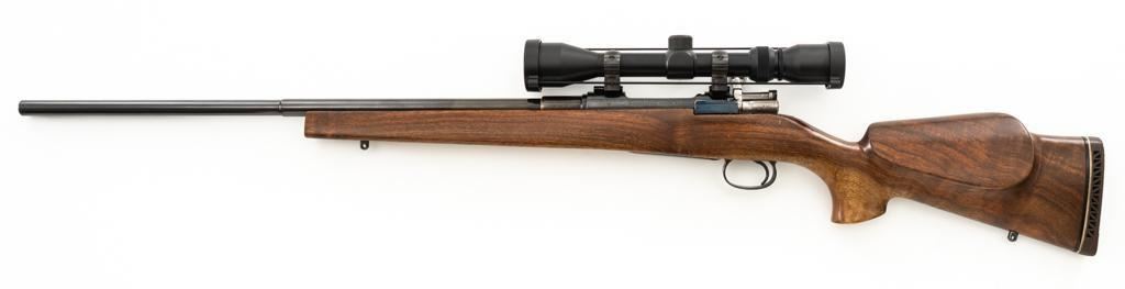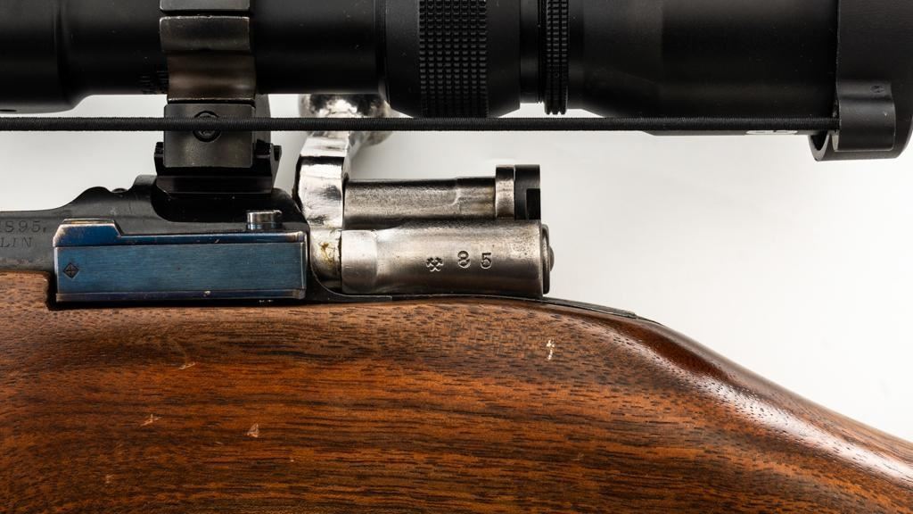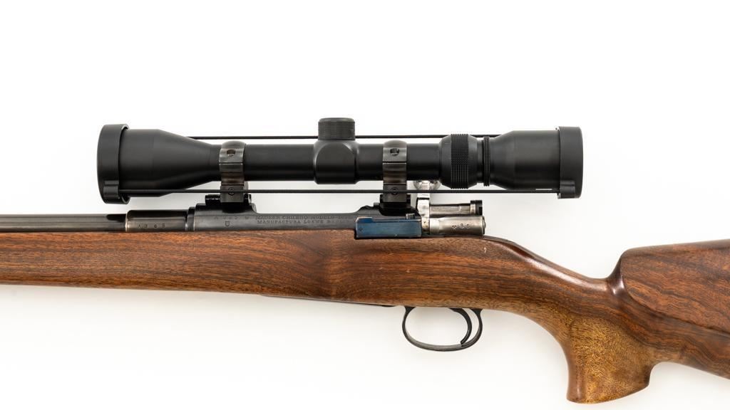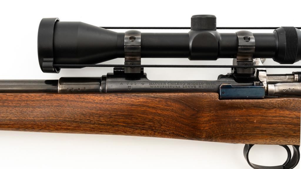 Custom Antique Chilean Model 1895 Mauser Bolt Action Rifle, #A385, 7x57mm cal., 25'' military barrel, with blue finish. Smooth walnut custom one-piece pistol grip stock with exaggerated roll over cheekpiece, sling swivel studs, ending with a ventilated rubber recoil pad, providing a 13.5'' LOP. No sights, contoured chrome bolt with flag safety, and internal box magazine. Left side of the receiver is marked ''MANUFACTURA LOEWE BERLIN''. Visible numbers are matching. Rifle is topped with two-piece bases, rings, and a Bushnell 3-9x scope, finished in matte black, with lens covers, and a duplex reticle. Scope is in excellent condition, with clear, bright optics. Rifle is in fine overall condition as modified, retaining approx. 90% blue, showing some areas of thinning and toning. Bolt release retains strong fire blued finish. Stock with scattered moderate scuffs and indentations consistent with field use. Action functions well. Bore near excellent with well-defined rifling. Est.: $300-$500. (Antique)