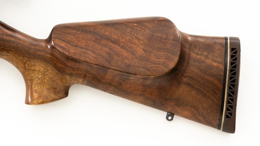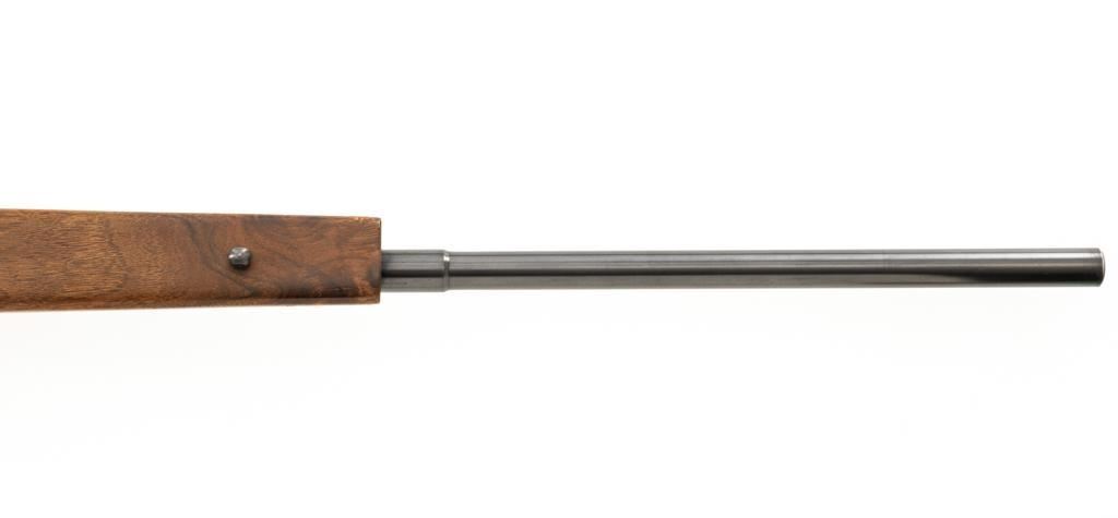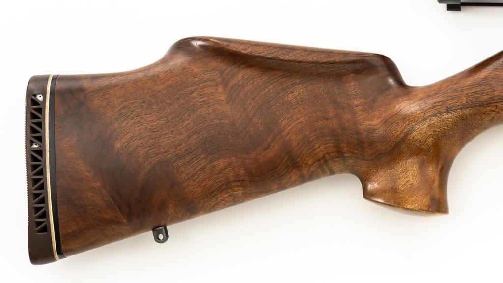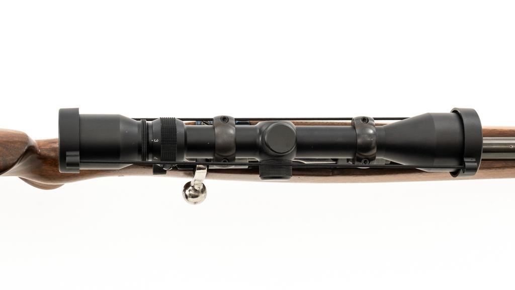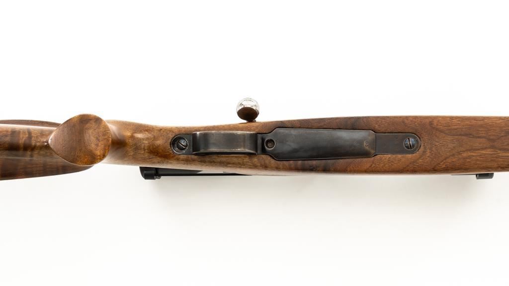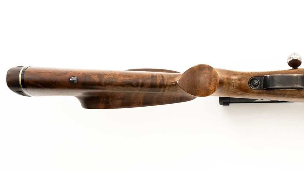 Custom Antique Chilean Model 1895 Mauser Bolt Action Rifle, #A385, 7x57mm cal., 25'' military barrel, with blue finish. Smooth walnut custom one-piece pistol grip stock with exaggerated roll over cheekpiece, sling swivel studs, ending with a ventilated rubber recoil pad, providing a 13.5'' LOP. No sights, contoured chrome bolt with flag safety, and internal box magazine. Left side of the receiver is marked ''MANUFACTURA LOEWE BERLIN''. Visible numbers are matching. Rifle is topped with two-piece bases, rings, and a Bushnell 3-9x scope, finished in matte black, with lens covers, and a duplex reticle. Scope is in excellent condition, with clear, bright optics. Rifle is in fine overall condition as modified, retaining approx. 90% blue, showing some areas of thinning and toning. Bolt release retains strong fire blued finish. Stock with scattered moderate scuffs and indentations consistent with field use. Action functions well. Bore near excellent with well-defined rifling. Est.: $300-$500. (Antique)
