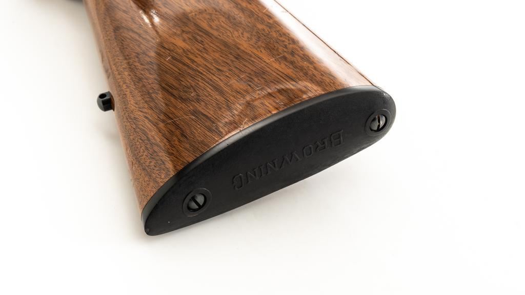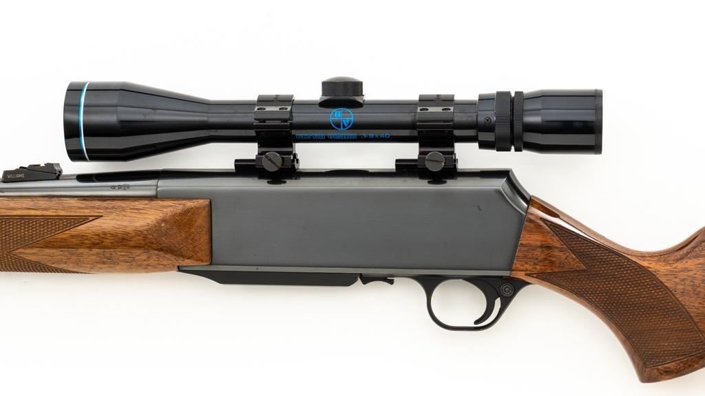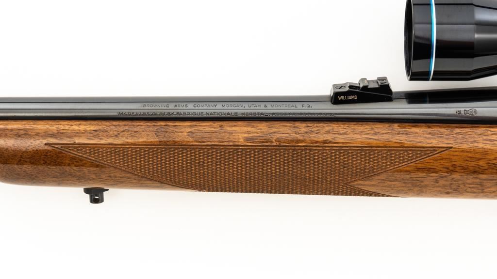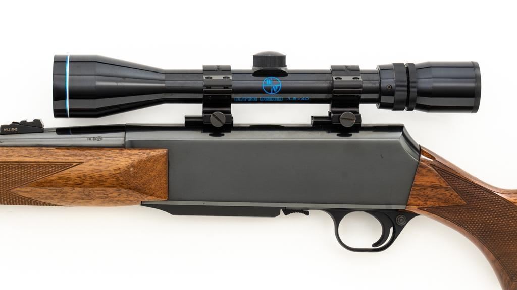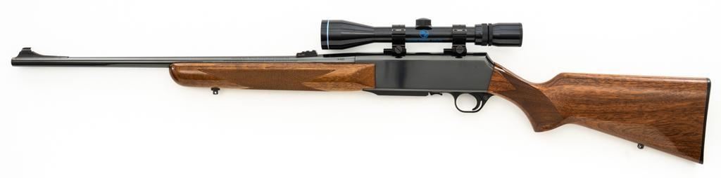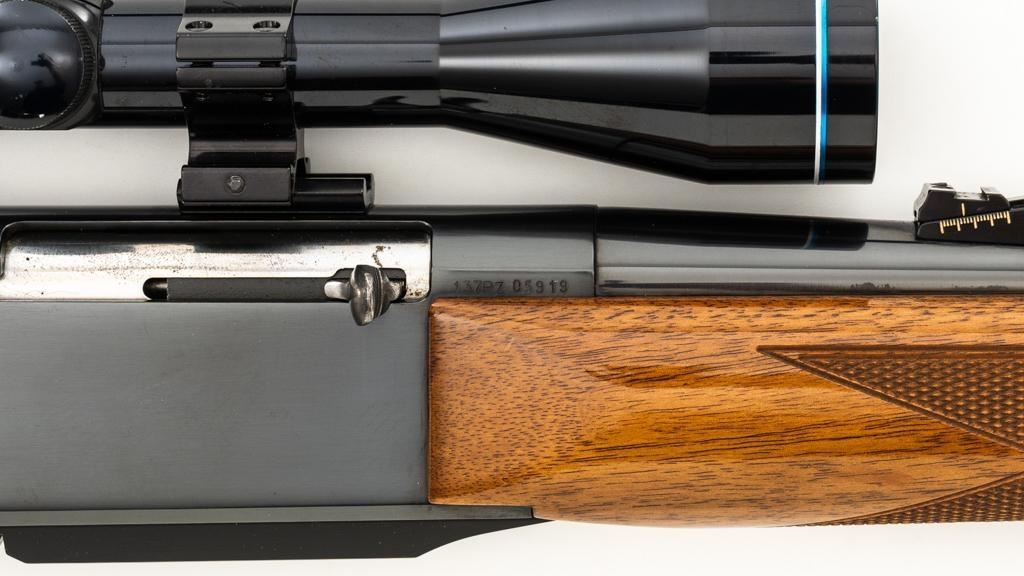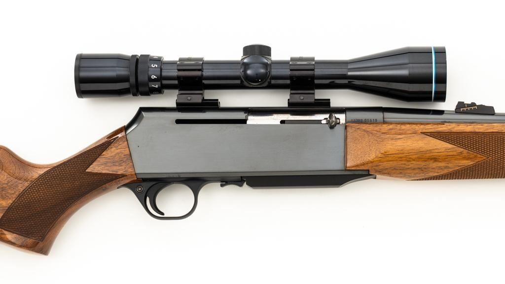 Belgian Browning BAR Semi-Automatic Rifle, #137PZ05919, .30-06 cal., 22'' barrel, blue finish, checkered walnut stock and forend, black plastic Browning buttplate, beaded blade front sight on ramped base, Williams rear sight base is present but the leaf has been removed to accommodate the scope. Made in Belgium and assembled in Portugal. Manufactured 1981. Topped with an Ultra Vision 3-9x40 scope on Weaver rings and mounts. Scope features a gloss black finish and duplex reticle. When looking directly at the objective lens it is foggy but when looking through the scope, the optics are clear. Rim of the objective bell is also slightly misshapen. Rifle is in near excellent condition, retaining approx. 98% + original factory blue. Stock and forend with several small pressure dings and very light scratches, not thru the finish, to both cheek area and forend. Action is crisp and operates smoothly. Bore is bright with excellent rifling. Est.: $700-$900. (Modern/PPT)