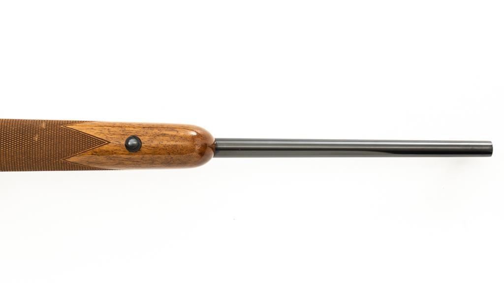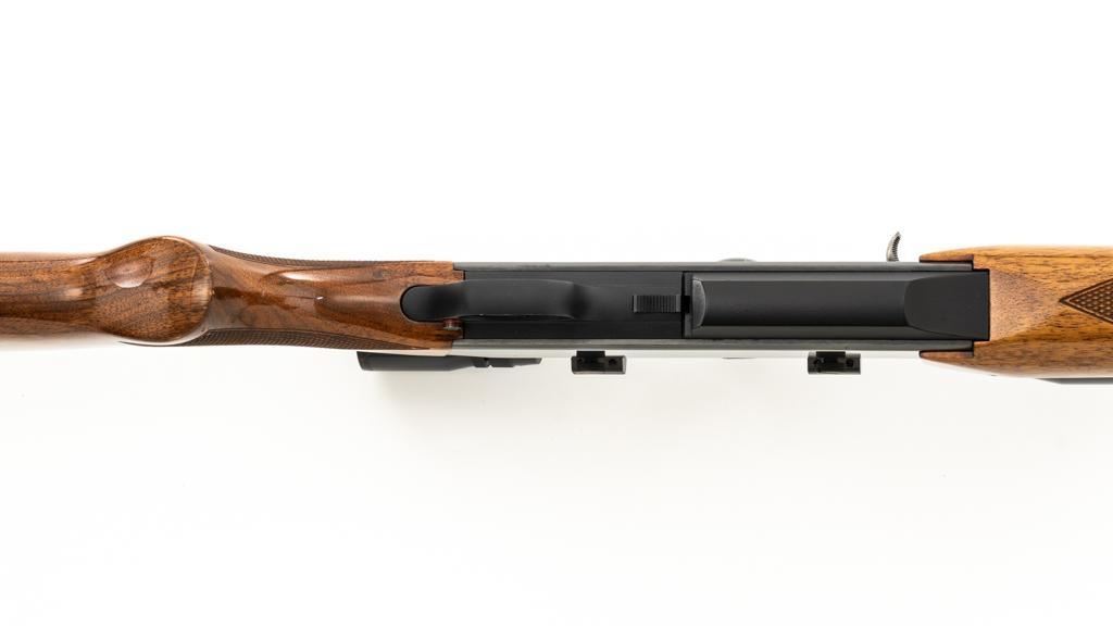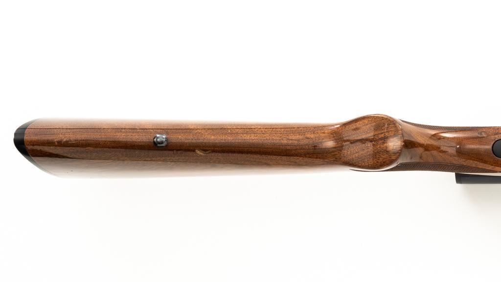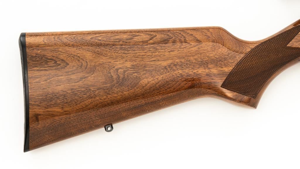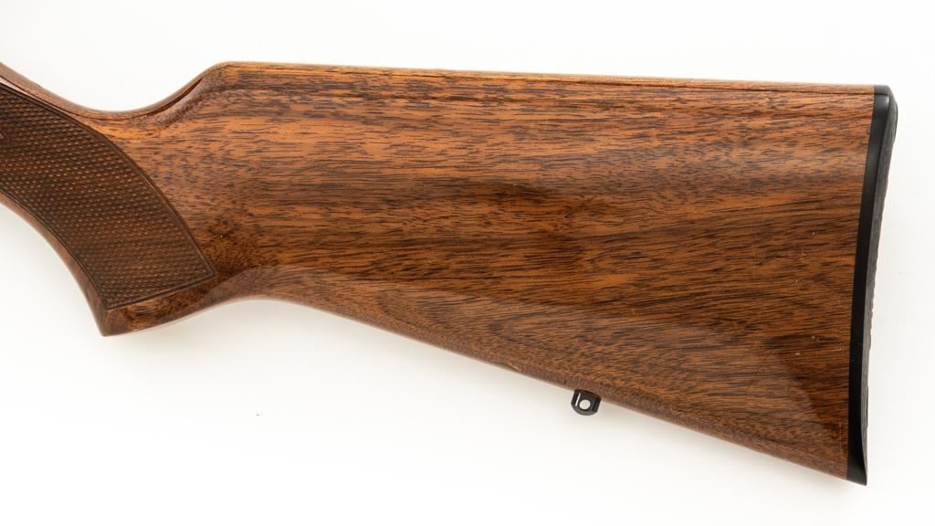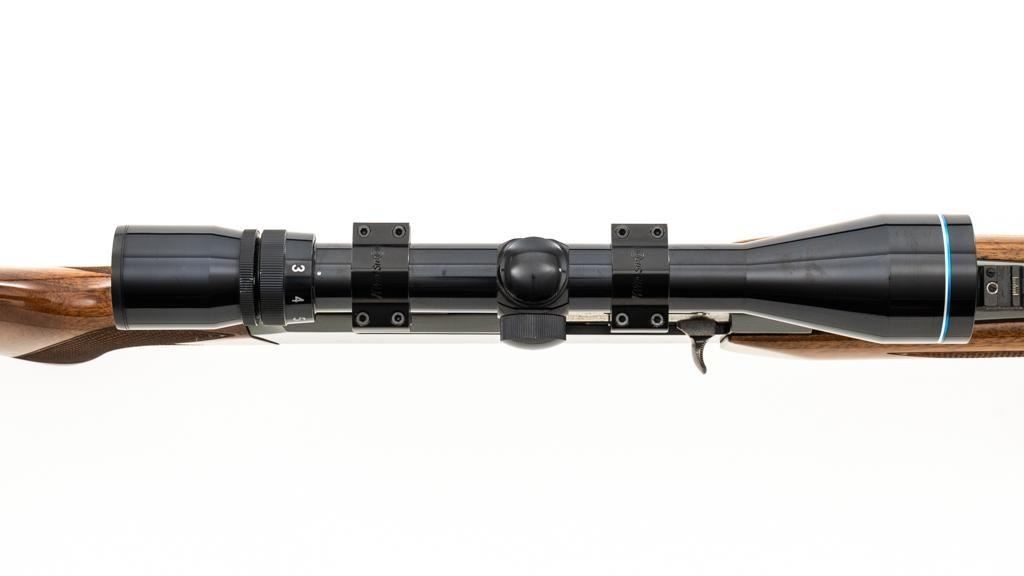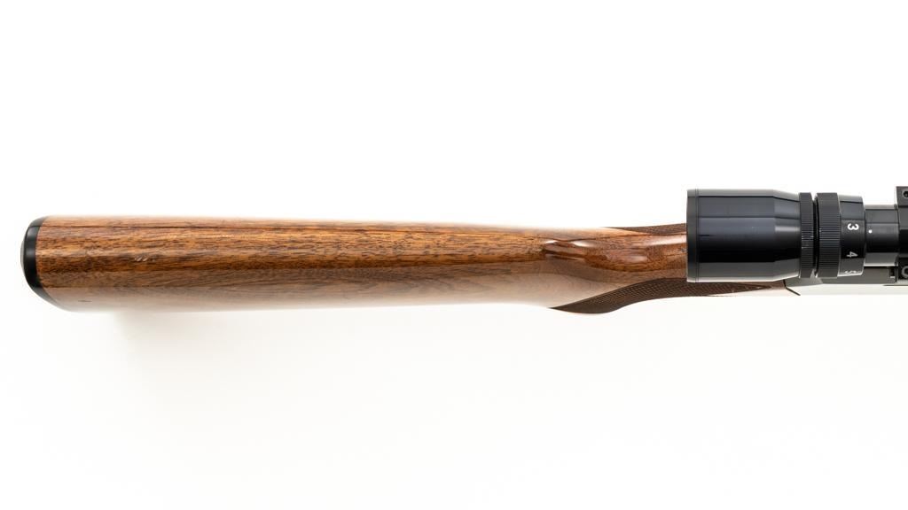 Belgian Browning BAR Semi-Automatic Rifle, #137PZ05919, .30-06 cal., 22'' barrel, blue finish, checkered walnut stock and forend, black plastic Browning buttplate, beaded blade front sight on ramped base, Williams rear sight base is present but the leaf has been removed to accommodate the scope. Made in Belgium and assembled in Portugal. Manufactured 1981. Topped with an Ultra Vision 3-9x40 scope on Weaver rings and mounts. Scope features a gloss black finish and duplex reticle. When looking directly at the objective lens it is foggy but when looking through the scope, the optics are clear. Rim of the objective bell is also slightly misshapen. Rifle is in near excellent condition, retaining approx. 98% + original factory blue. Stock and forend with several small pressure dings and very light scratches, not thru the finish, to both cheek area and forend. Action is crisp and operates smoothly. Bore is bright with excellent rifling. Est.: $700-$900. (Modern/PPT)