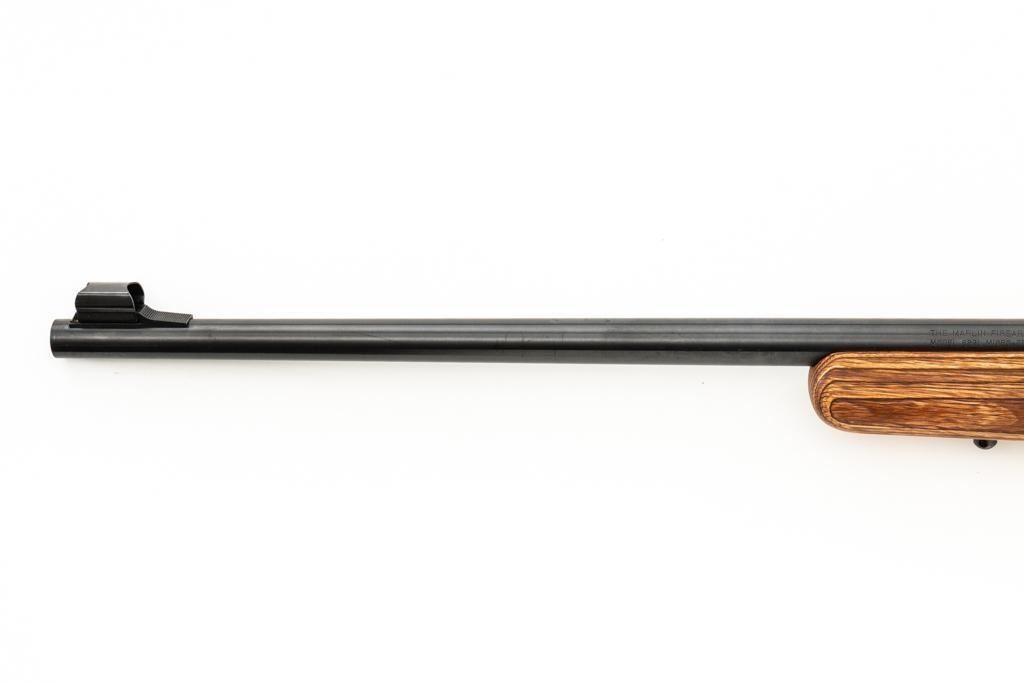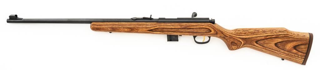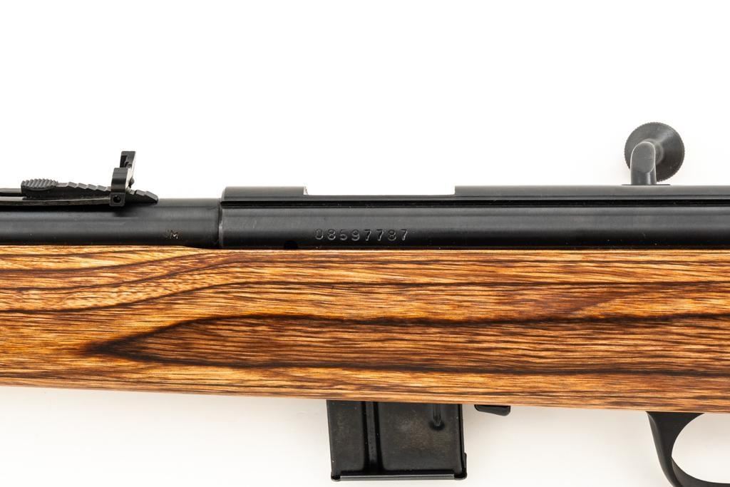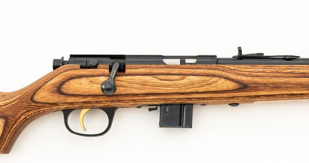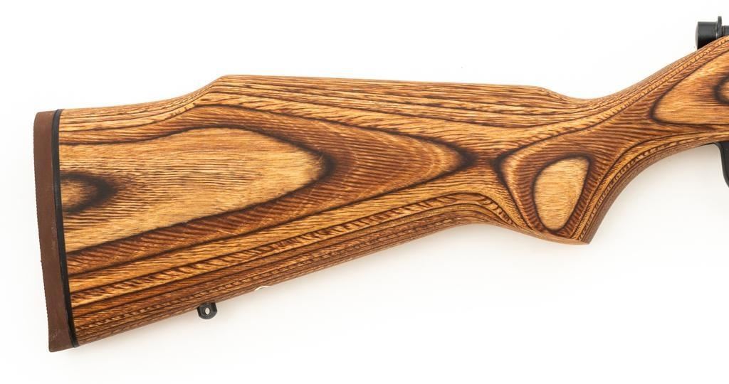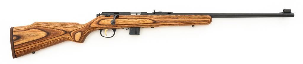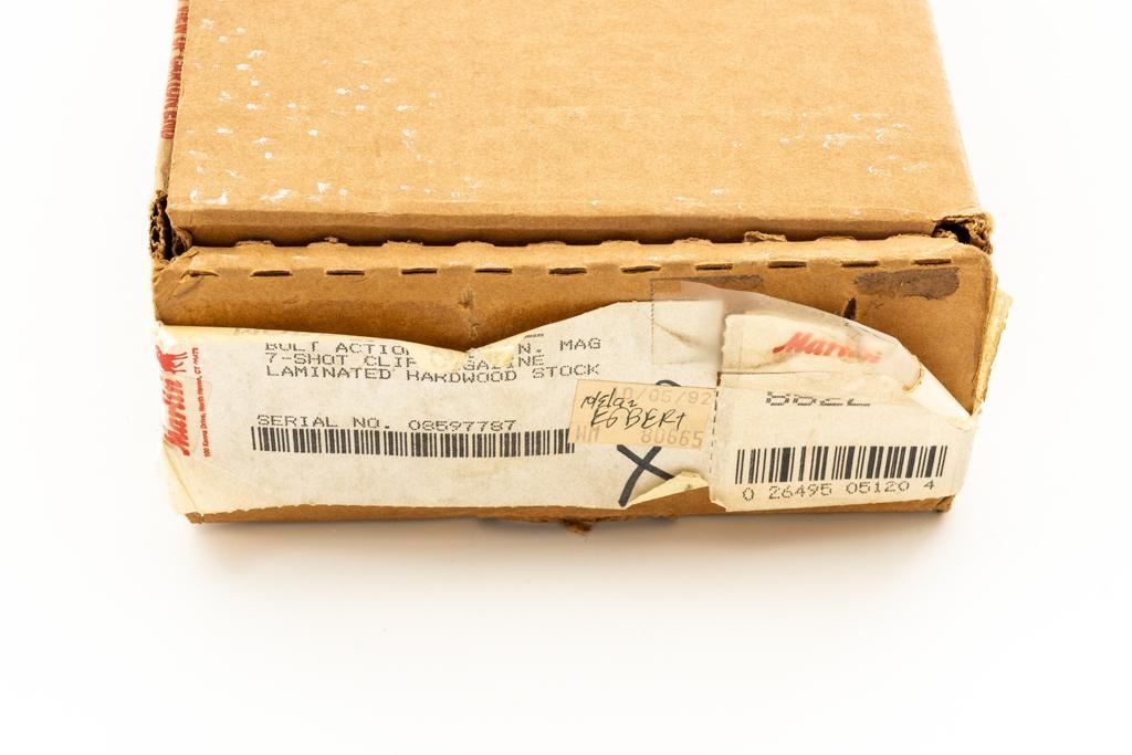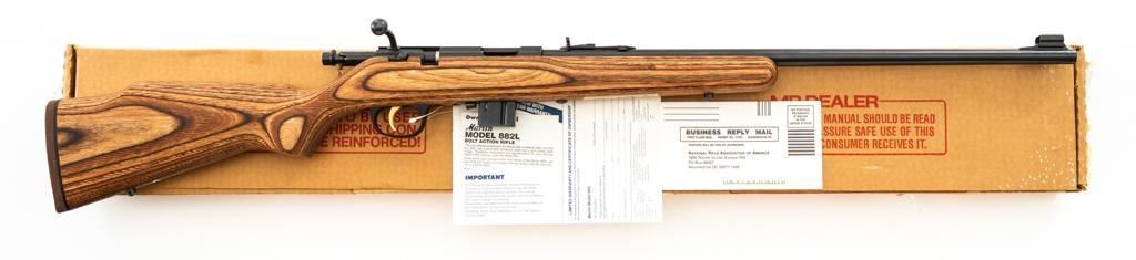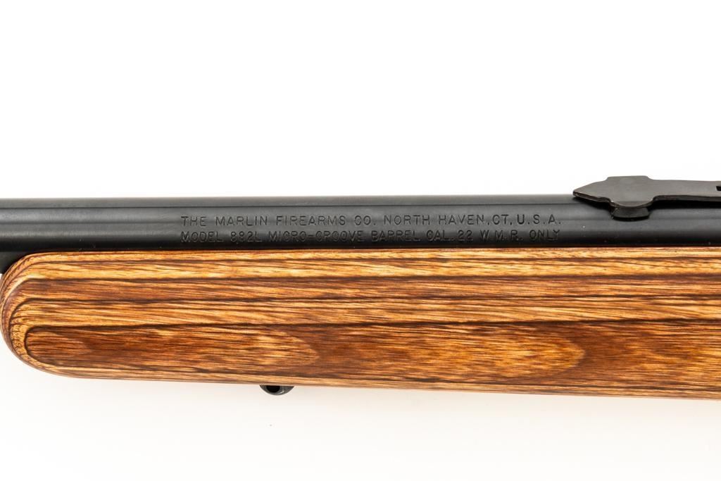 1st Year Production Marlin Model 882L Bolt Action Rifle, #08597787, .22 WMR cal., 22'' ''JM'' marked micro-groove barrel, blue finish. Smooth laminated wood one-piece Monte Carlo stock has sling swivel studs, Marlin ''bullseye'', and ends with a Marlin solid rubber pad, providing a 14'' LOP. Rifle also features a hooded ramped brass beaded blade front, folding semi-buckhorn rear sight, gold colored trigger, factory grooved receiver, and one 7-round blue steel detachable magazine. Includes the factory cardboard box with matching end label, warranty card, hanging instruction manual, and associated packaging materials. Mfg'd 1992, the first year of production. Rifle is in excellent, as new condition, and may be unfired, with only a few light handling and storage marks. Action is smooth with a crisp trigger. Bore is mirror bright with excellent rifling. Est.: $500-$700. (Modern/PPT)