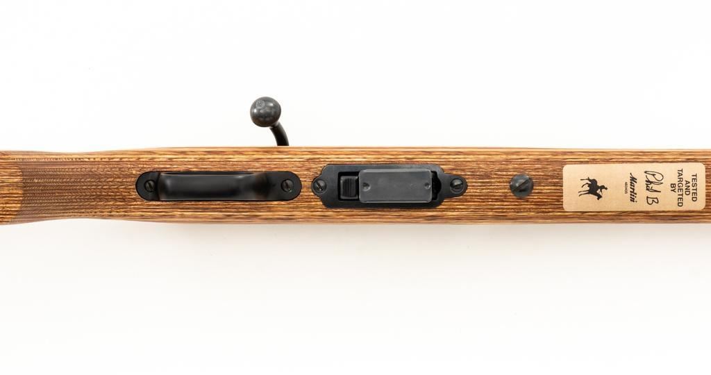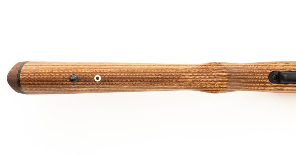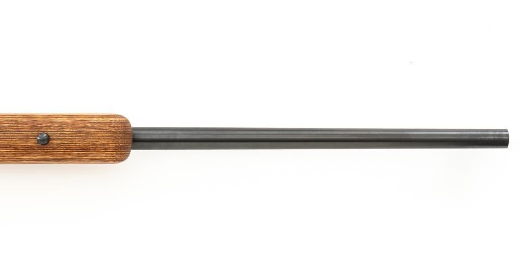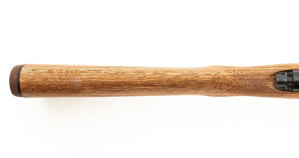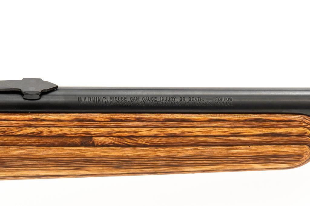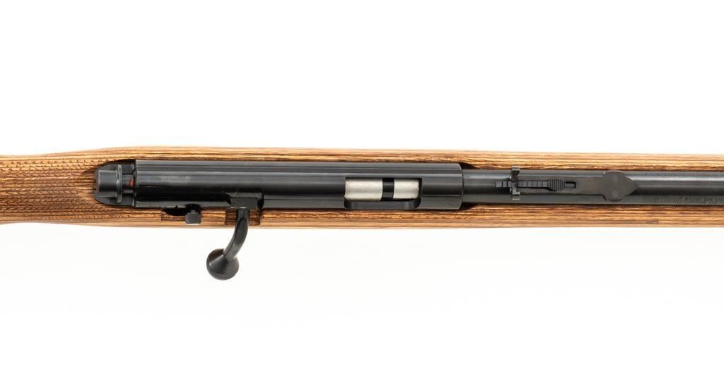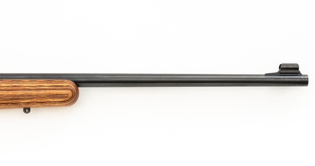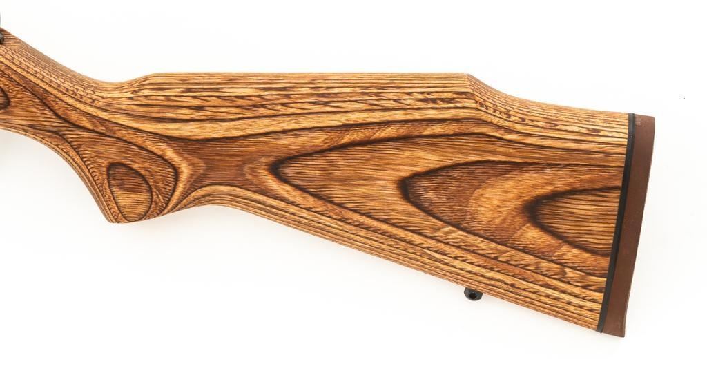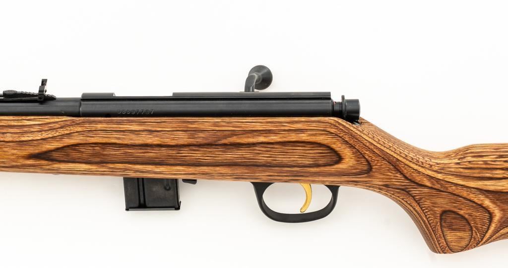 1st Year Production Marlin Model 882L Bolt Action Rifle, #08597787, .22 WMR cal., 22'' ''JM'' marked micro-groove barrel, blue finish. Smooth laminated wood one-piece Monte Carlo stock has sling swivel studs, Marlin ''bullseye'', and ends with a Marlin solid rubber pad, providing a 14'' LOP. Rifle also features a hooded ramped brass beaded blade front, folding semi-buckhorn rear sight, gold colored trigger, factory grooved receiver, and one 7-round blue steel detachable magazine. Includes the factory cardboard box with matching end label, warranty card, hanging instruction manual, and associated packaging materials. Mfg'd 1992, the first year of production. Rifle is in excellent, as new condition, and may be unfired, with only a few light handling and storage marks. Action is smooth with a crisp trigger. Bore is mirror bright with excellent rifling. Est.: $500-$700. (Modern/PPT)