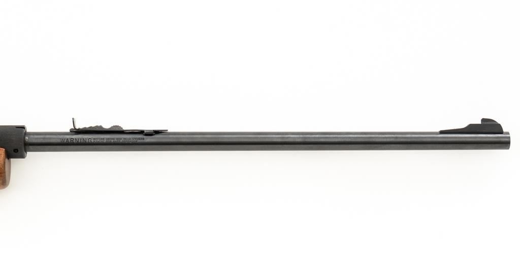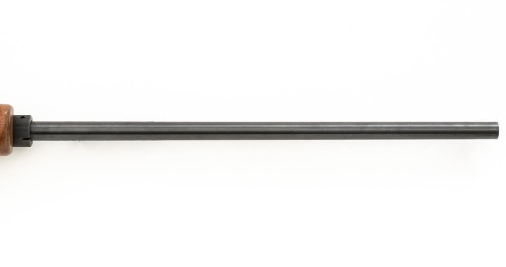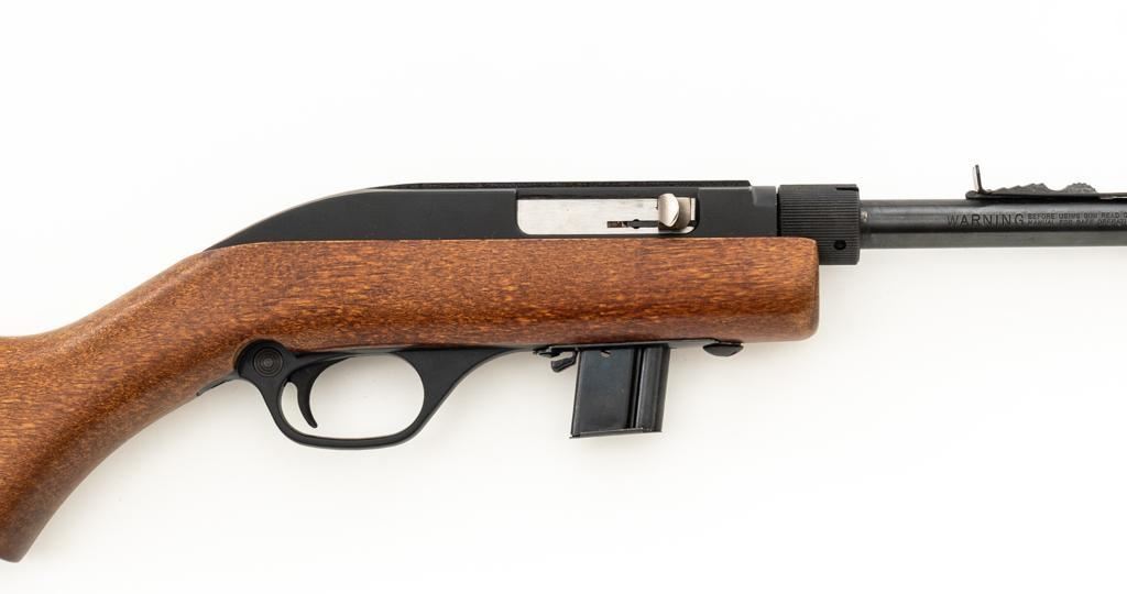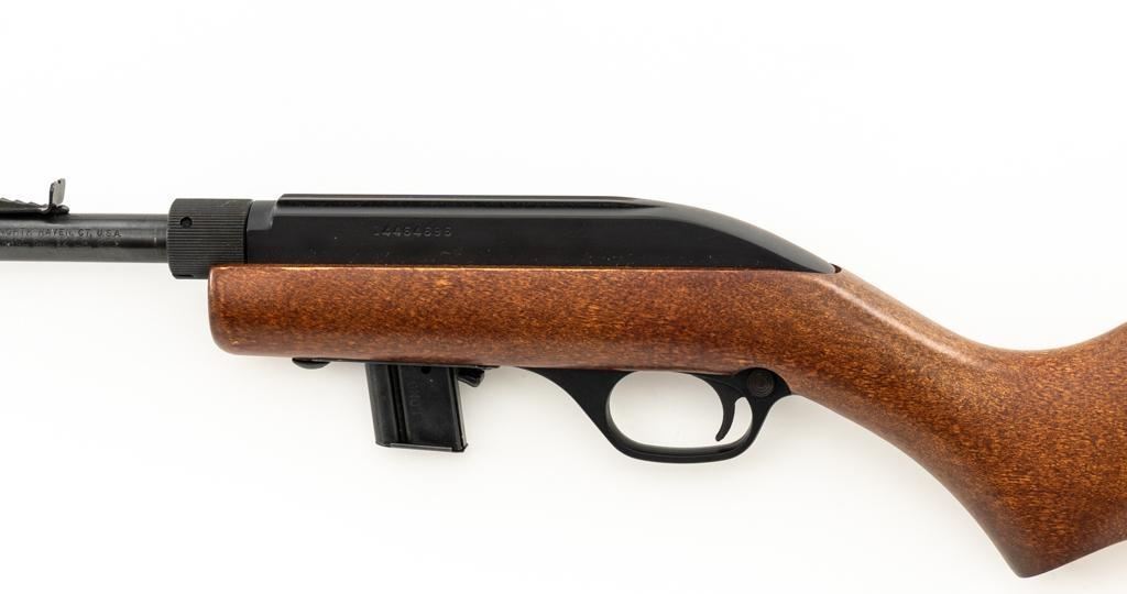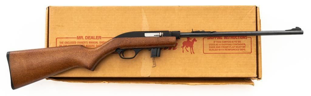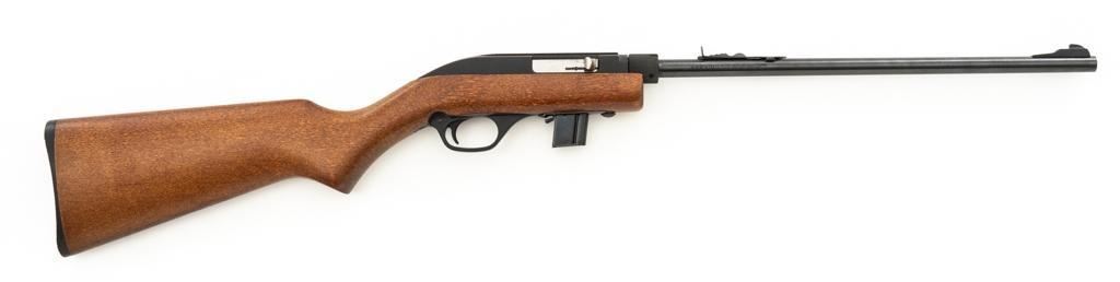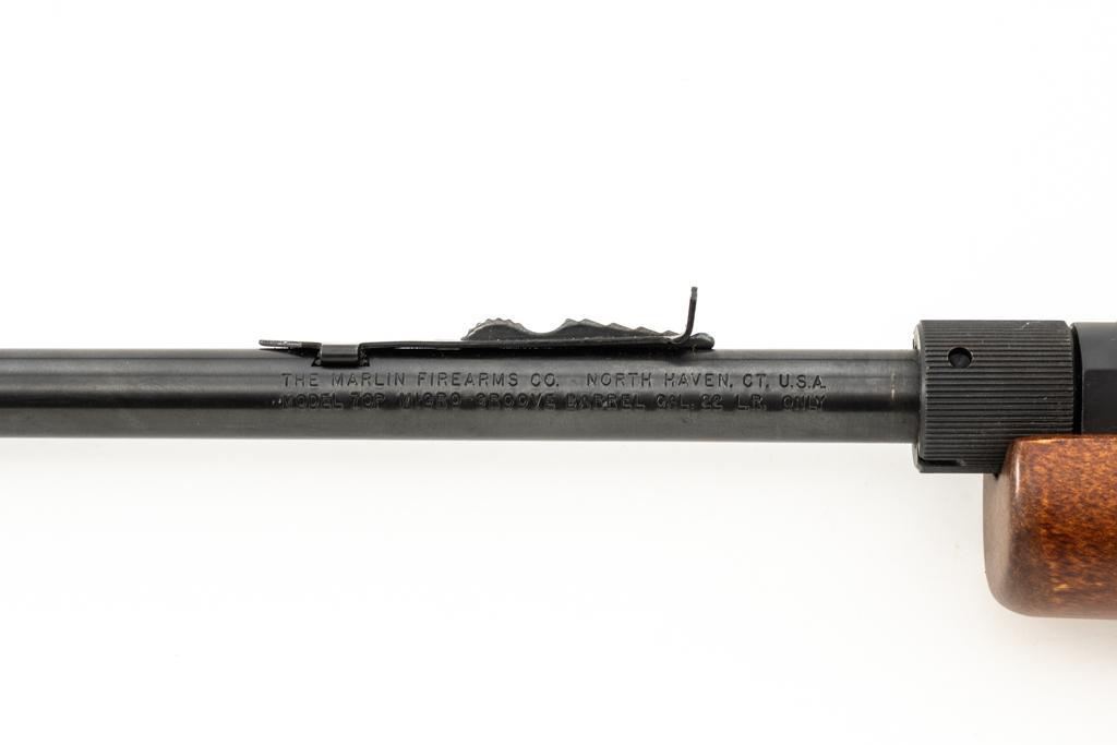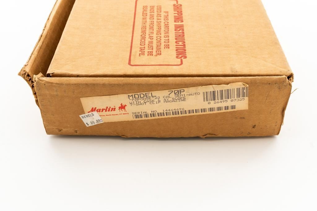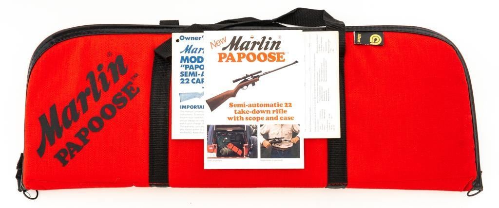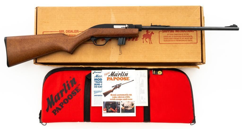 1st Year Production Marlin Model 70P Papoose Semi-Automatic Takedown Carbine, #14464696, .22 LR cal., 16.5'' micro-groove barrel, blue finish, smooth walnut one-piece pistol grip stock ending with a checkered plastic buttplate, providing a 13.5'' LOP, ramped blade front and standard elevator ''U''- notch rear sight, one 7-round blue steel magazine, and factory grooved receiver. Includes factory cardboard box with matching end label, instruction manual, literature, and red/black Marlin Papoose Cordura nylon boot. Also included is a Tasco 4x15 fixed power scope with fine cross hair reticle, and unmarked scope rings. Mfg'd 1986, the first year of production. Carbine is in excellent overall condition, retaining approx. 98%-99% factory finish, with minor handling marks. Stock is in excellent condition, with modest high point edgewear. Action functions smoothly. Bore is bright with excellent rifling, showing little use. Est.: $400-$600. (Modern/PPT)