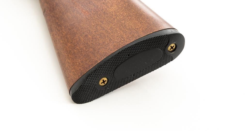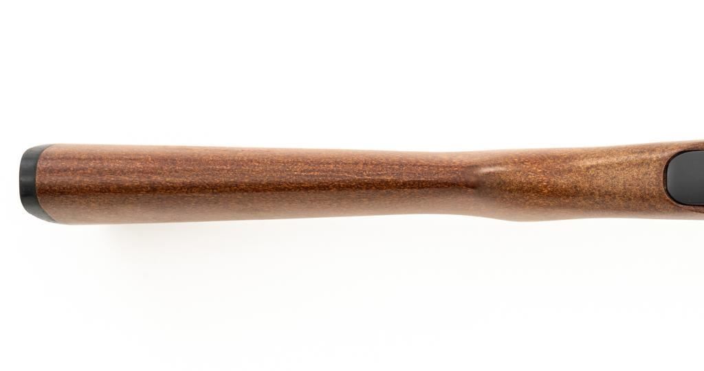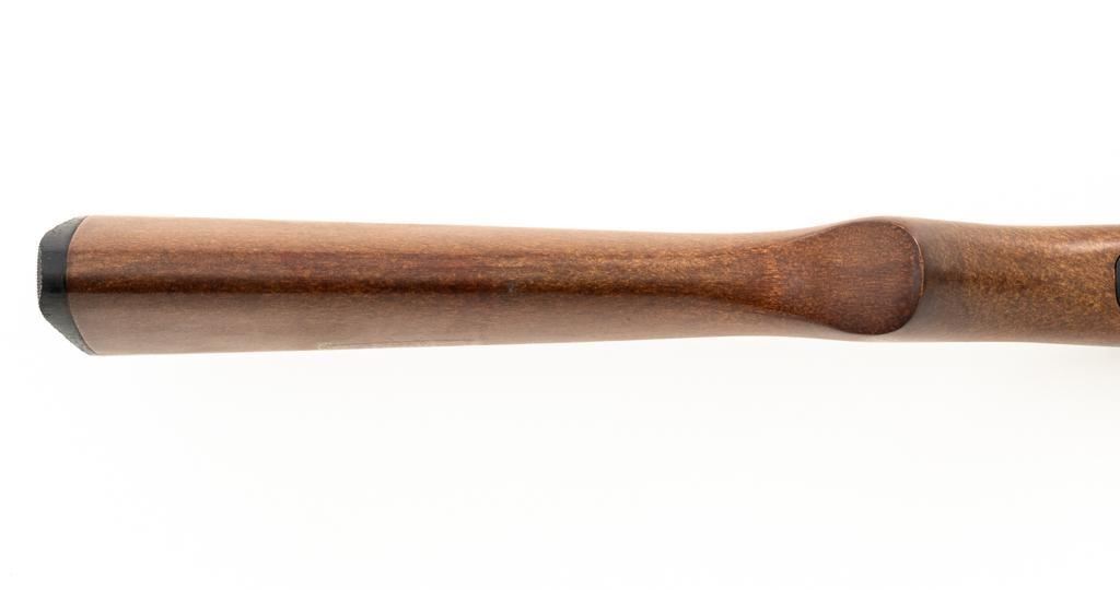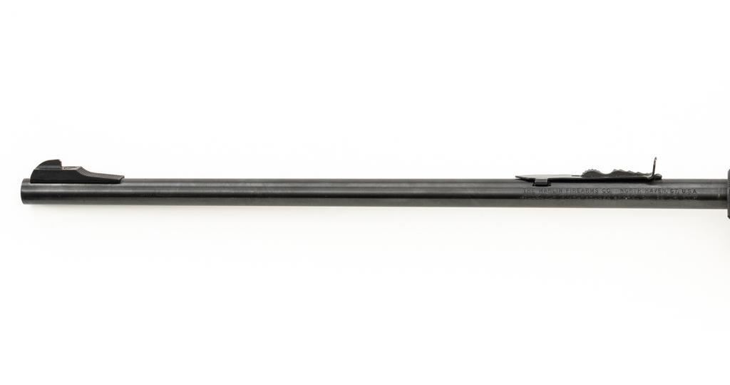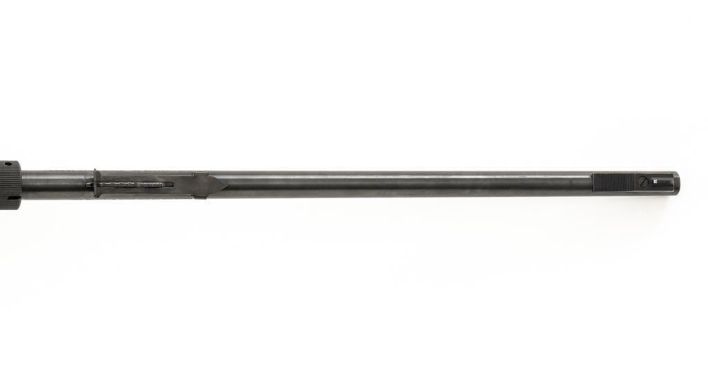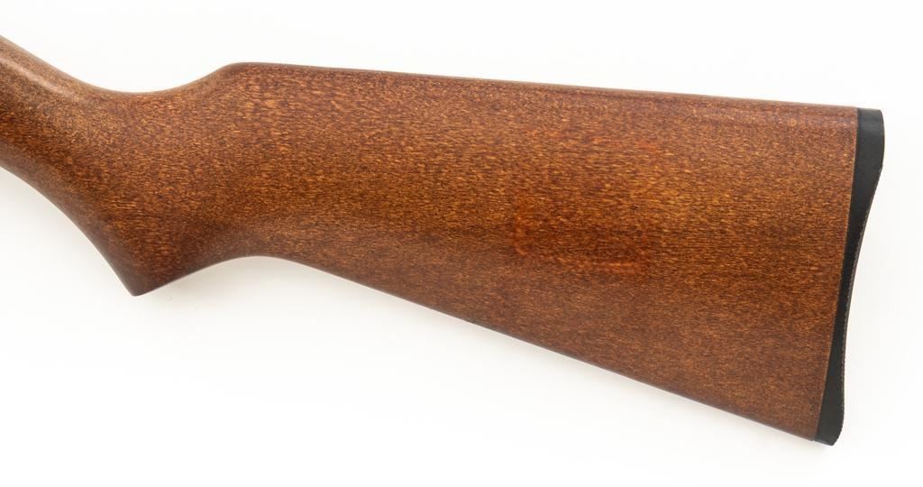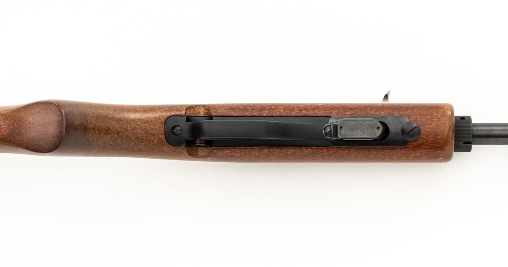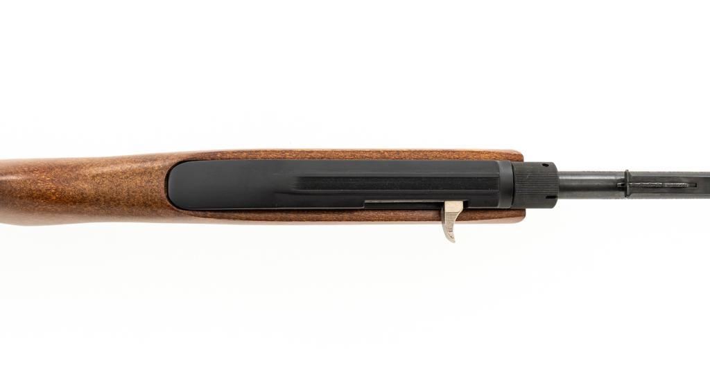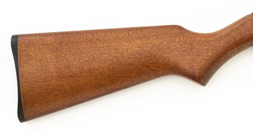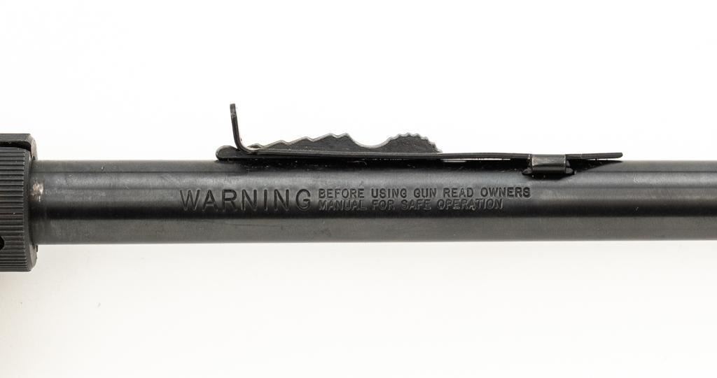1st Year Production Marlin Model 70P Papoose Semi-Automatic Takedown Carbine, #14464696, .22 LR cal., 16.5'' micro-groove barrel, blue finish, smooth walnut one-piece pistol grip stock ending with a checkered plastic buttplate, providing a 13.5'' LOP, ramped blade front and standard elevator ''U''- notch rear sight, one 7-round blue steel magazine, and factory grooved receiver. Includes factory cardboard box with matching end label, instruction manual, literature, and red/black Marlin Papoose Cordura nylon boot. Also included is a Tasco 4x15 fixed power scope with fine cross hair reticle, and unmarked scope rings. Mfg'd 1986, the first year of production. Carbine is in excellent overall condition, retaining approx. 98%-99% factory finish, with minor handling marks. Stock is in excellent condition, with modest high point edgewear. Action functions smoothly. Bore is bright with excellent rifling, showing little use. Est.: $400-$600. (Modern/PPT)
