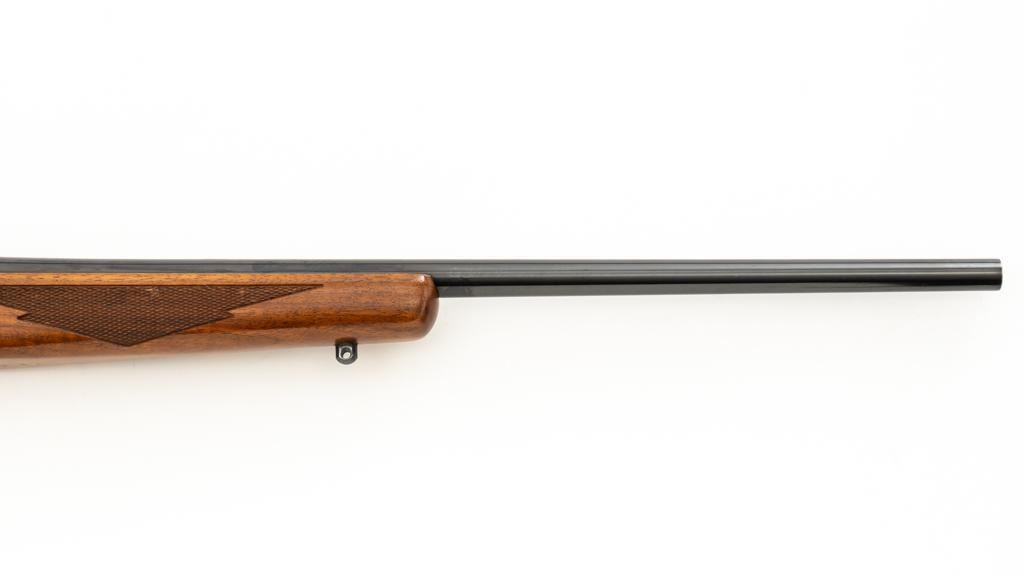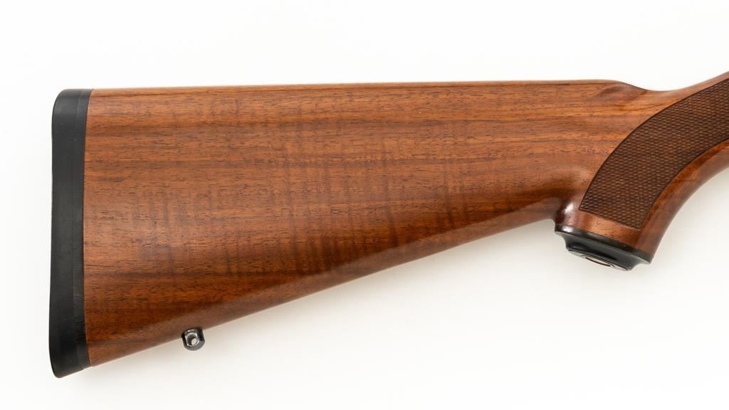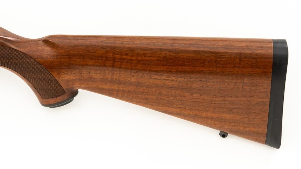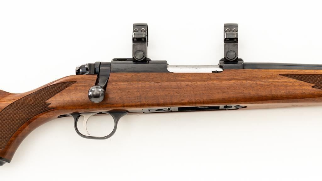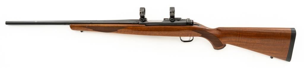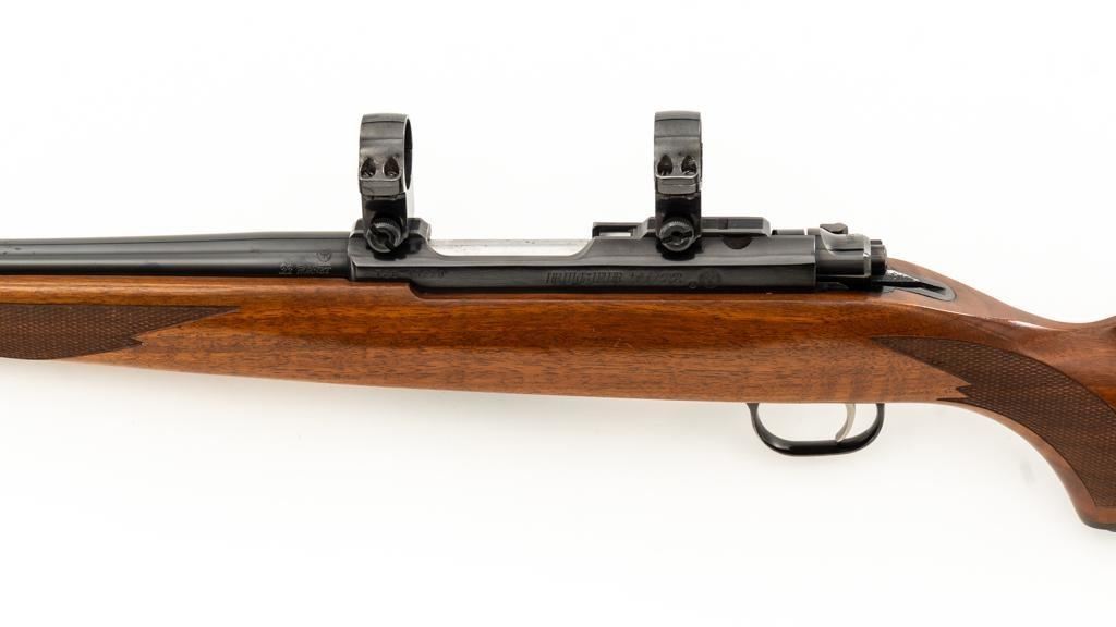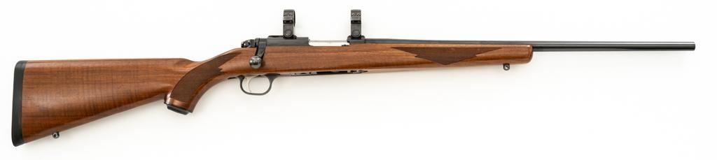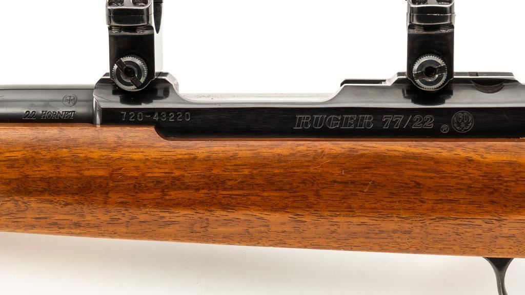Ruger 77/22 Bolt Action Rifle, #720-43220, .22 Hornet cal., 20'' barrel, blue finish. Checkered walnut one-piece pistol grip stock has sling swivel studs and ends with a solid rubber recoil pad, providing a 13.75'' LOP. There is no provision for sights. Includes one 9-round detachable Ruger rotary magazine and Ruger scope rings. Bolt displays matching serial number. Mfg'd 2017. Rifle is in very good+ overall condition, retaining approx. 94%-95% factory finish, with a couple of rubs along the barrel, intermittent light scratches, and handling marks, with edgewear to the trigger guard. Stock with scattered light indentations and scratches consistent with handling and use, showing attractive fiddleback figure in the buttstock. Action functions well with a crisp trigger. Bore is bright with defined rifling. Est.: $600-$800. (Modern/PPT)