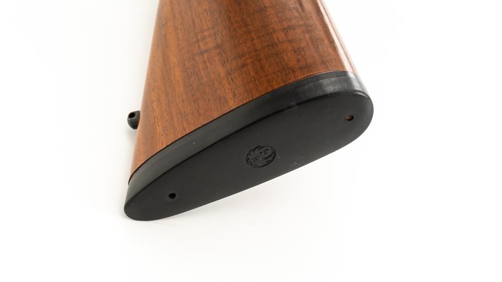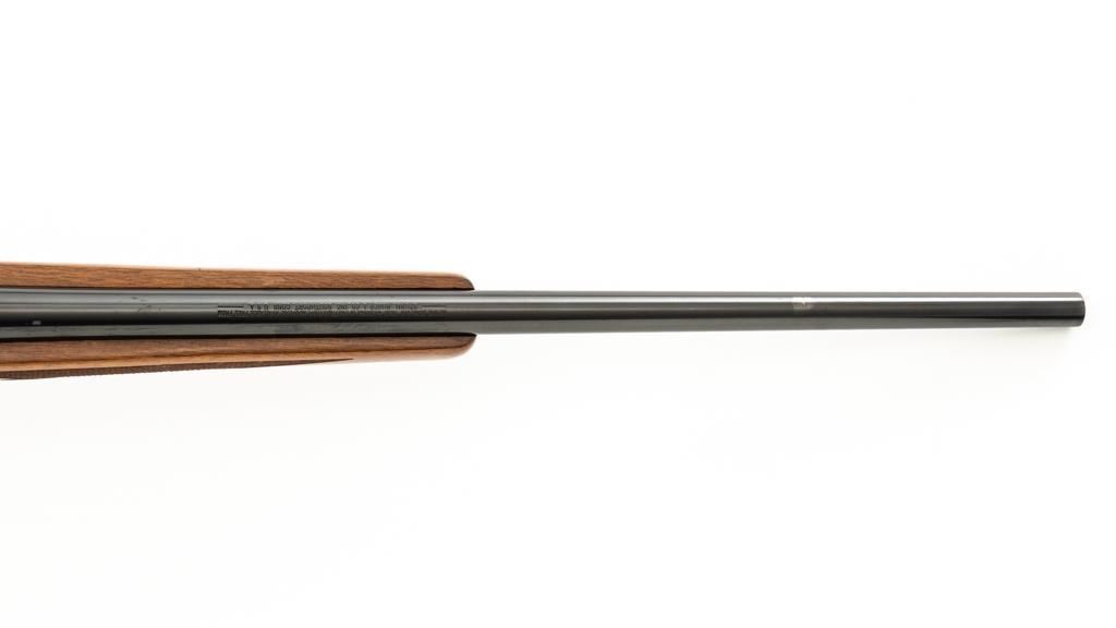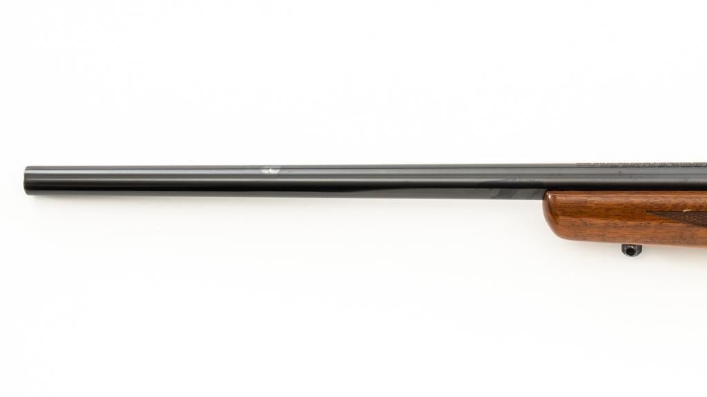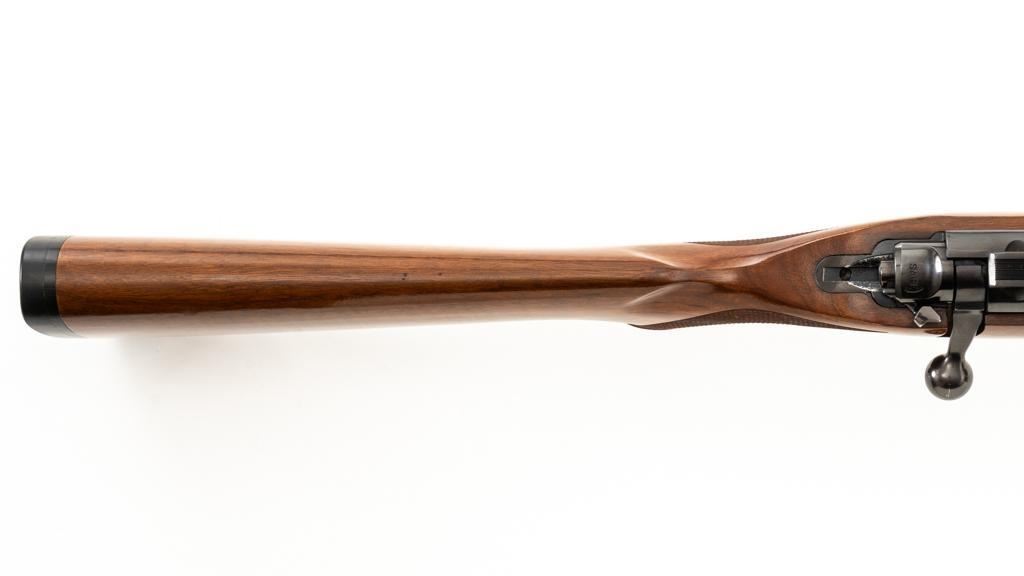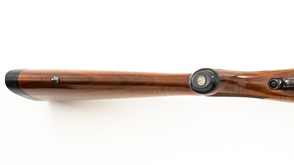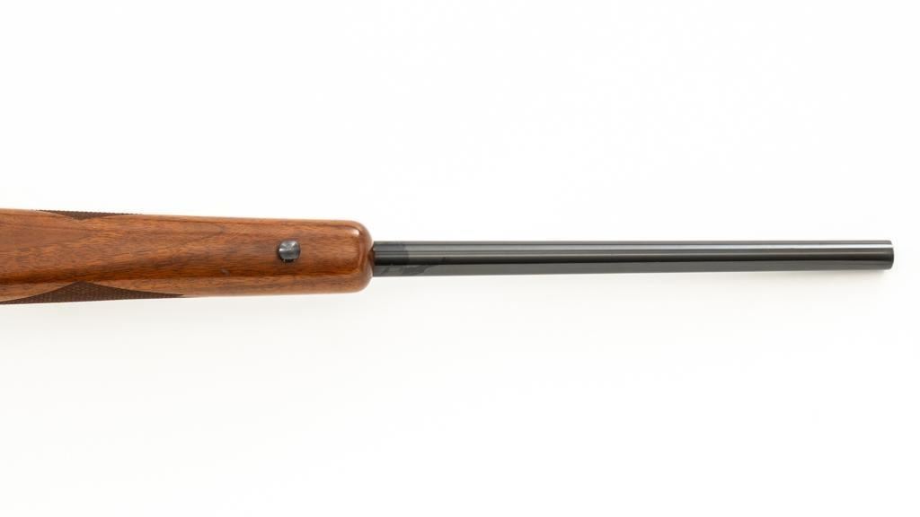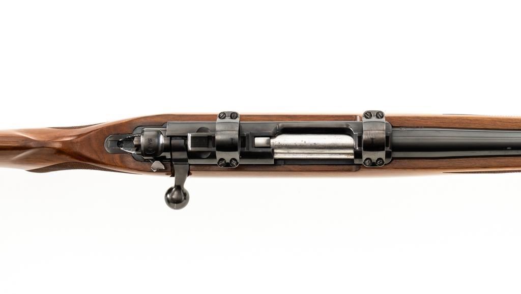 Ruger 77/22 Bolt Action Rifle, #720-43220, .22 Hornet cal., 20'' barrel, blue finish. Checkered walnut one-piece pistol grip stock has sling swivel studs and ends with a solid rubber recoil pad, providing a 13.75'' LOP. There is no provision for sights. Includes one 9-round detachable Ruger rotary magazine and Ruger scope rings. Bolt displays matching serial number. Mfg'd 2017. Rifle is in very good+ overall condition, retaining approx. 94%-95% factory finish, with a couple of rubs along the barrel, intermittent light scratches, and handling marks, with edgewear to the trigger guard. Stock with scattered light indentations and scratches consistent with handling and use, showing attractive fiddleback figure in the buttstock. Action functions well with a crisp trigger. Bore is bright with defined rifling. Est.: $600-$800. (Modern/PPT)