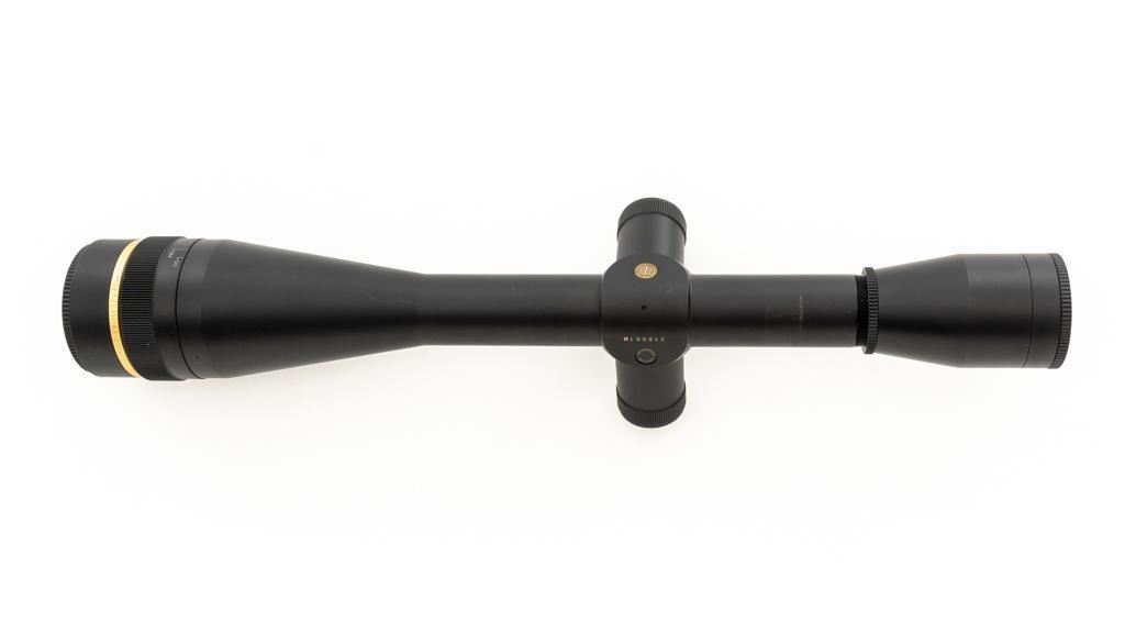 Leupold FX-III 12x40mm Rifle Scope, matte black finish, 1'' tube, 40mm adjustable objective with duplex reticle, and click adjustments. Serial #316961M. Scope is in near excellent condition with light ring and handling marks. There are 2 small blemishes to the finish, one on the objective bell and the other on the front of the scope body. Optics are bright and clear. Includes Leupold aluminum scope caps. Est.: $500-$800.