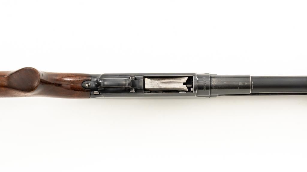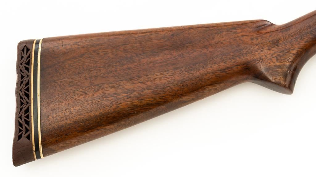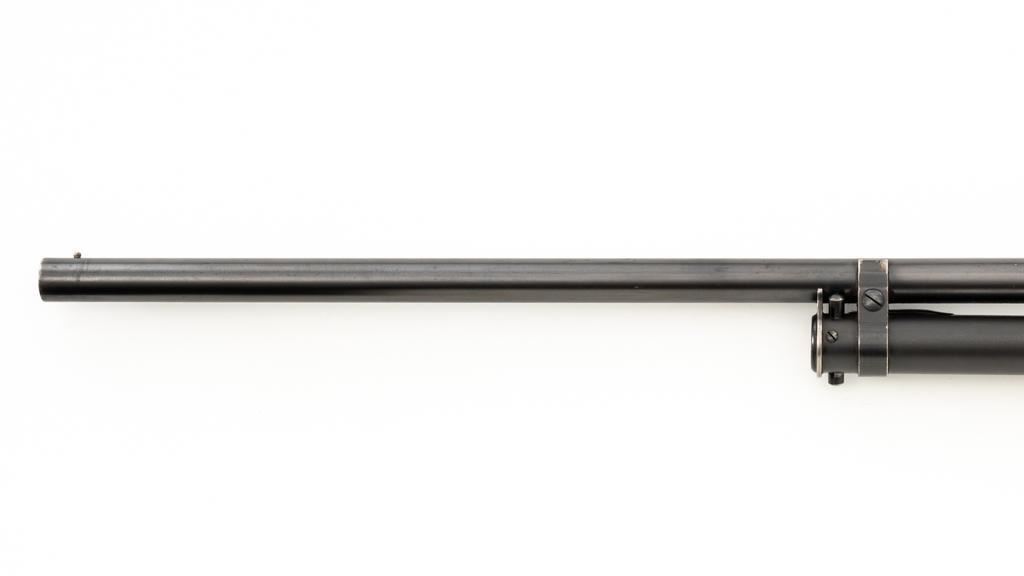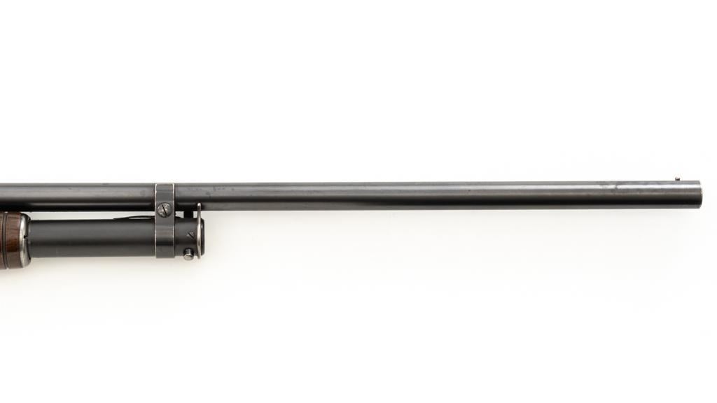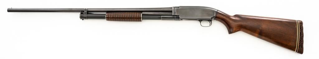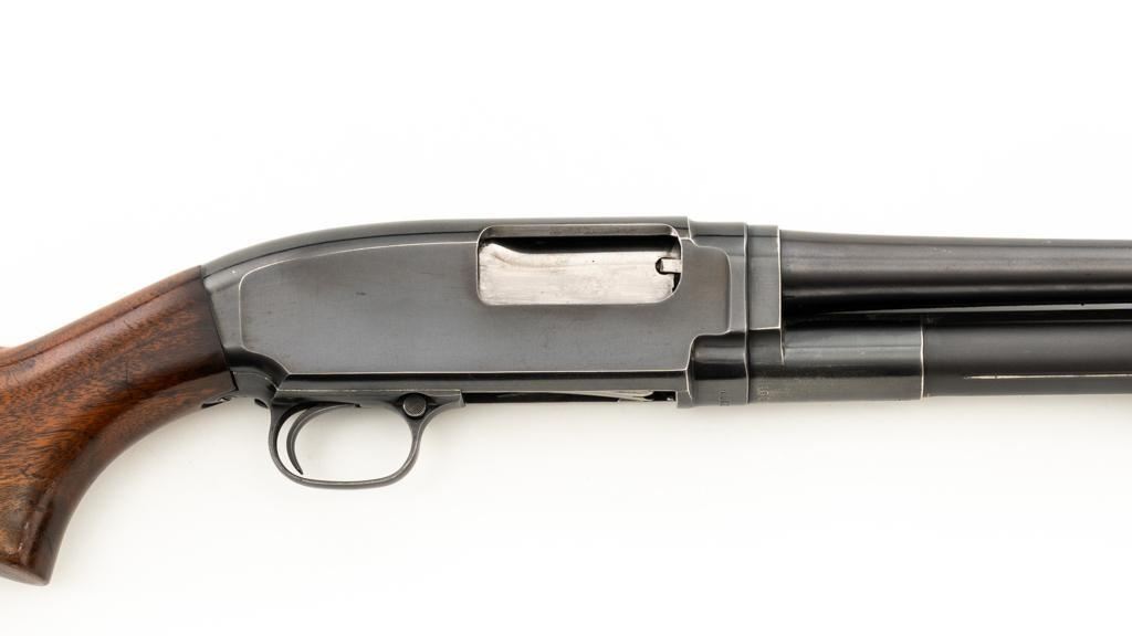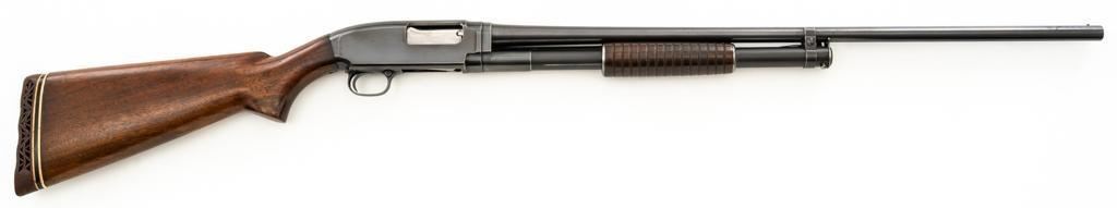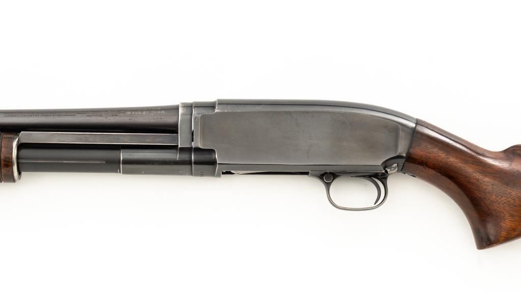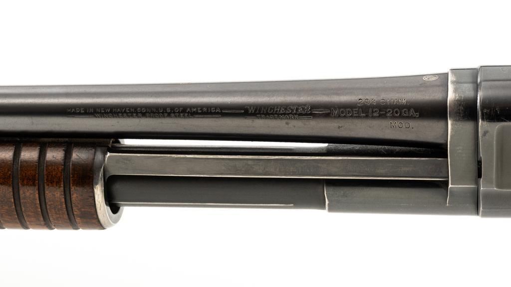 Winchester Model 12 Slide Action Shotgun, #1063490, 20 ga., 28'' plain barrel with 2-3/4'' chamber, bead front sight, stamped Mod but gauges IC; blue finish. Walnut smooth pistol grip stock with added 1'' vented recoil pad, forend with 14 grooves; LOP 14.75''. Top of barrel and receiver are both Winchester proofed. Mfg'd 1946. Condition is fine, approx. 90% factory blue finish remains. Receiver with high-point edgewear and other small handling marks. Barrel with thinning, mainly in the chamber area. Wood is in very good condition with intermittent surface dents and scattered light scratches; an additional coat of varnish has been added. Action functions smoothly and locks up tight. Bore is bright. Est.: $200-$400. (C&R/PPT)