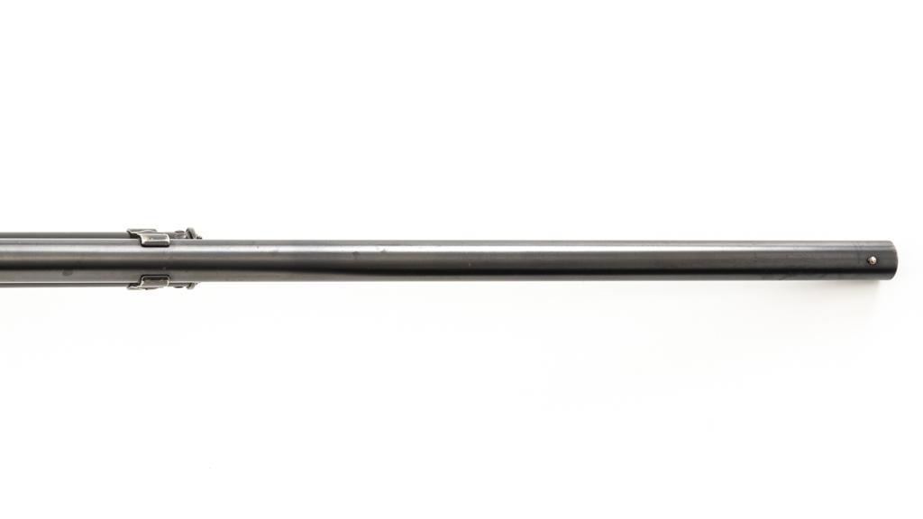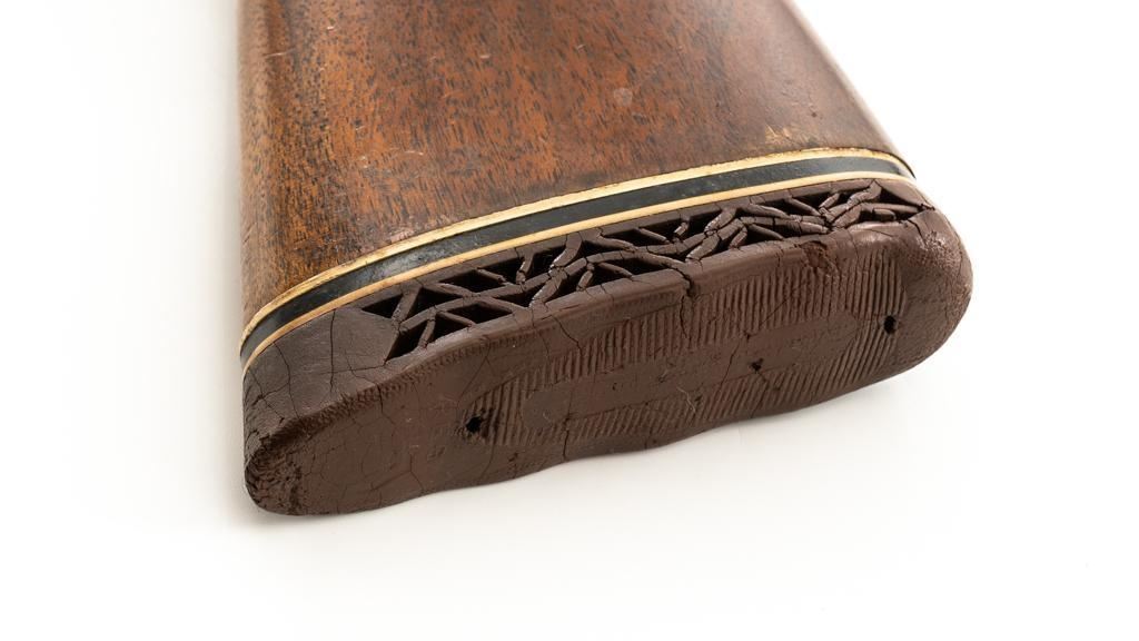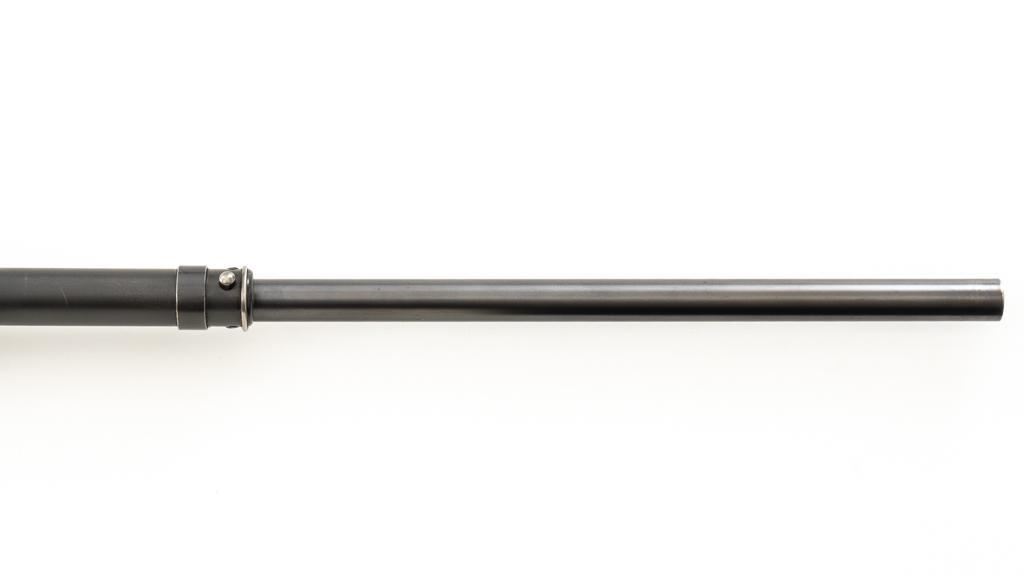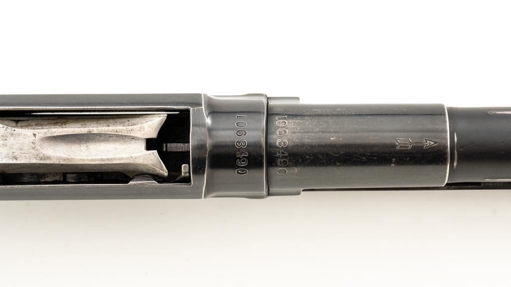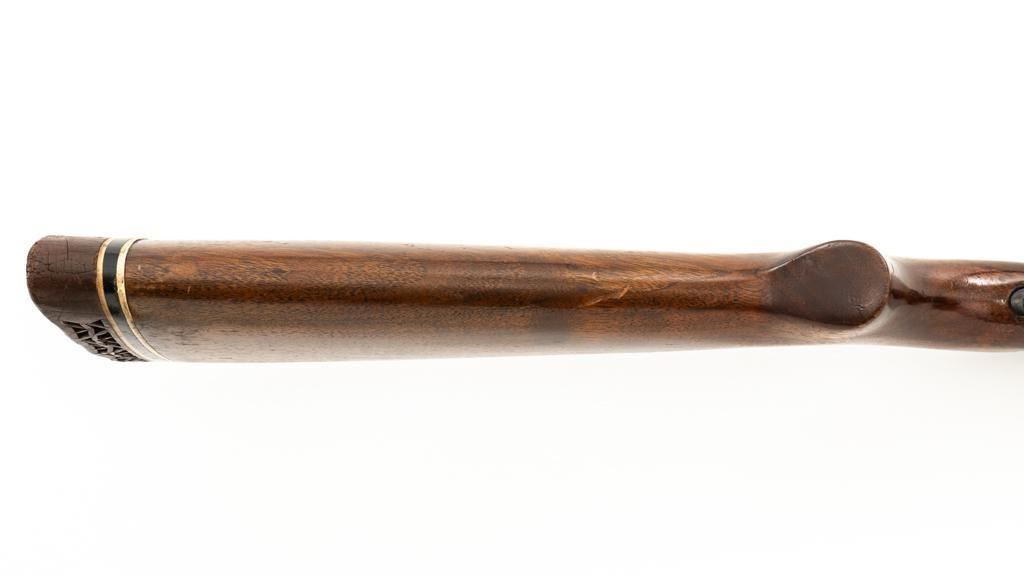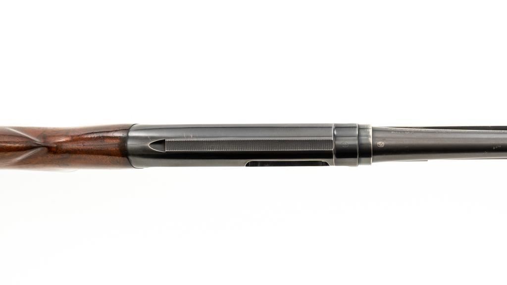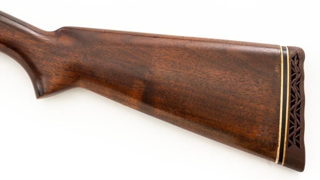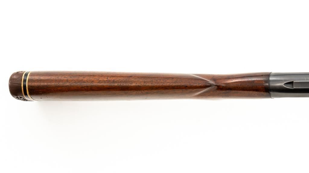 Winchester Model 12 Slide Action Shotgun, #1063490, 20 ga., 28'' plain barrel with 2-3/4'' chamber, bead front sight, stamped Mod but gauges IC; blue finish. Walnut smooth pistol grip stock with added 1'' vented recoil pad, forend with 14 grooves; LOP 14.75''. Top of barrel and receiver are both Winchester proofed. Mfg'd 1946. Condition is fine, approx. 90% factory blue finish remains. Receiver with high-point edgewear and other small handling marks. Barrel with thinning, mainly in the chamber area. Wood is in very good condition with intermittent surface dents and scattered light scratches; an additional coat of varnish has been added. Action functions smoothly and locks up tight. Bore is bright. Est.: $200-$400. (C&R/PPT)