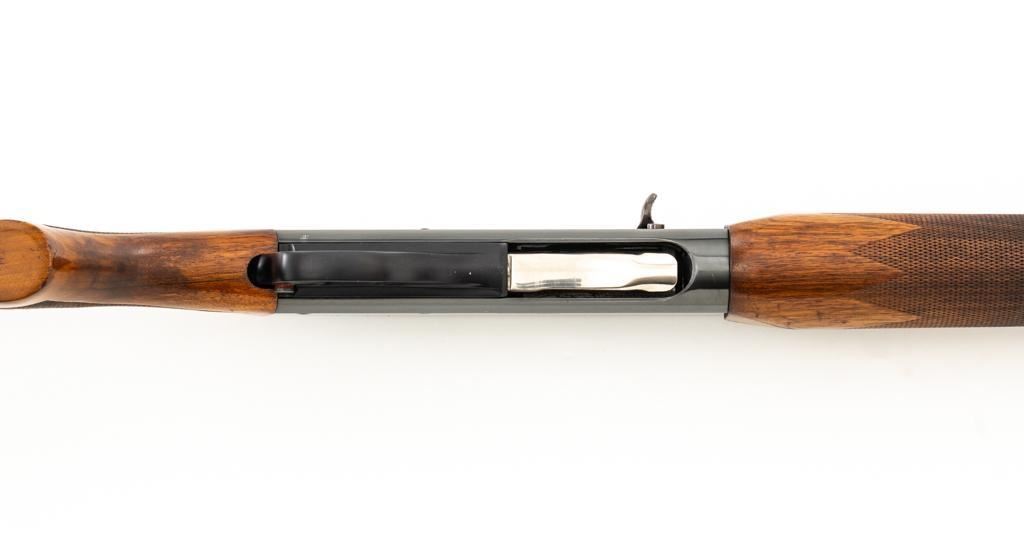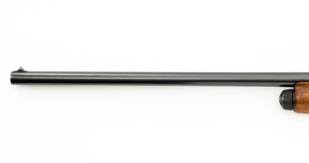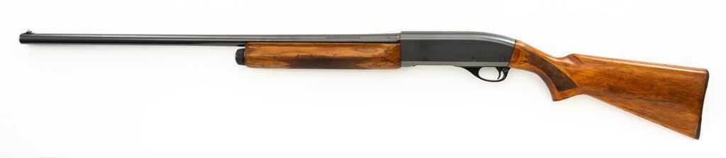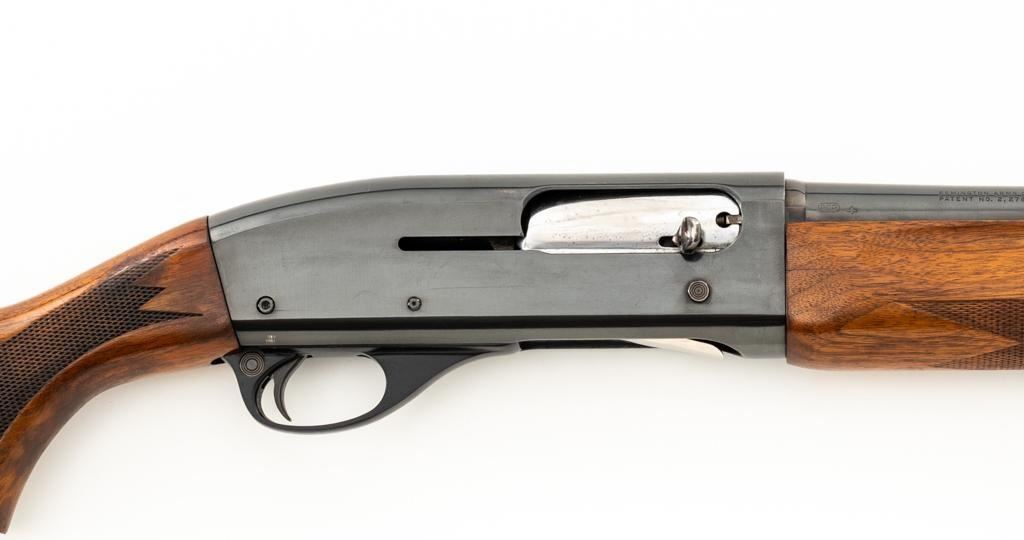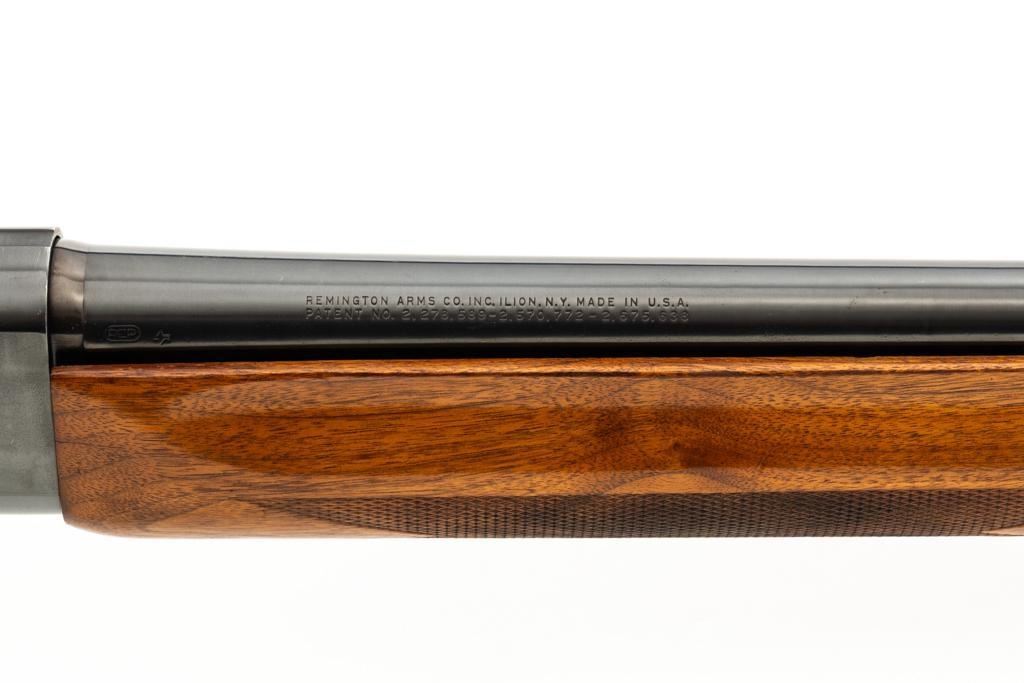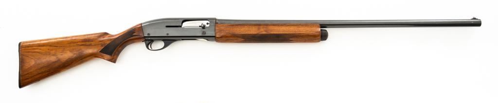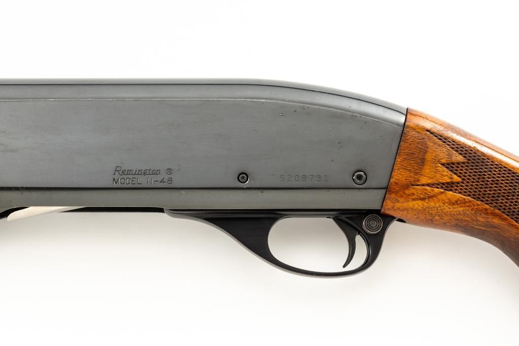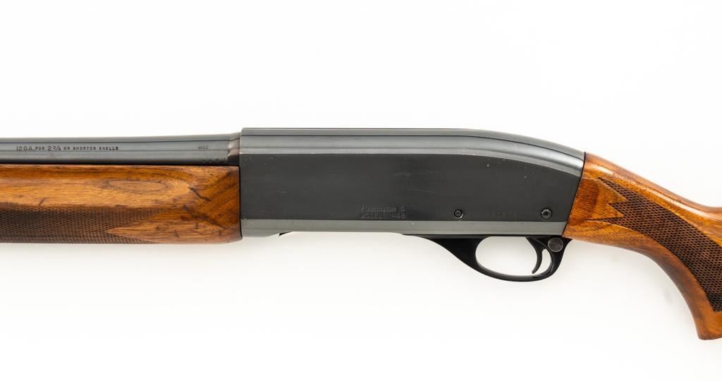 Remington Model 11-48 Semi-Automatic Shotgun, #5208731, 12 ga., 28'' plain barrel with 2-3/4'' chamber, Modified choke, and silver bead front sight; blue finish. Checkered pistol grip walnut stock and forend, with grooved black composite Remington buttplate; LOP 13-7/8''. Barrel date code is ''WW'', Mfg'd 1950. Condition is fine. Approx. 95%-97% factory blued finish remains, with scattered thinning, and few small handling marks. and light scratches. Stock has been lightly sanded and re-finished; there are light handling marks and scattered small dents. Checkering is clean but has smoothed. Action operates smoothly and locks up tight. Bore is bright. Est.: $300-$500. (C&R/PPT)