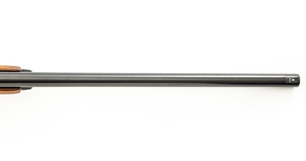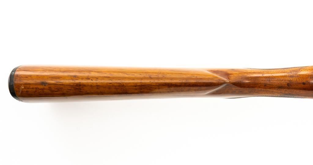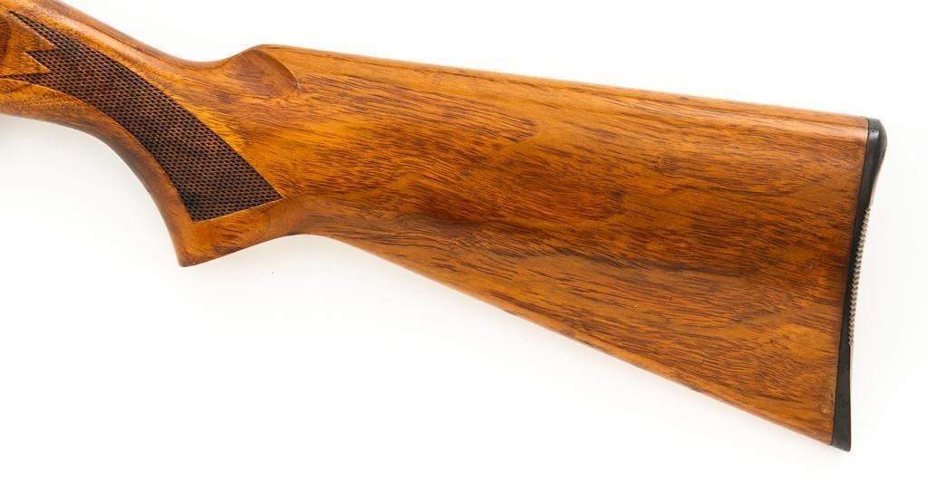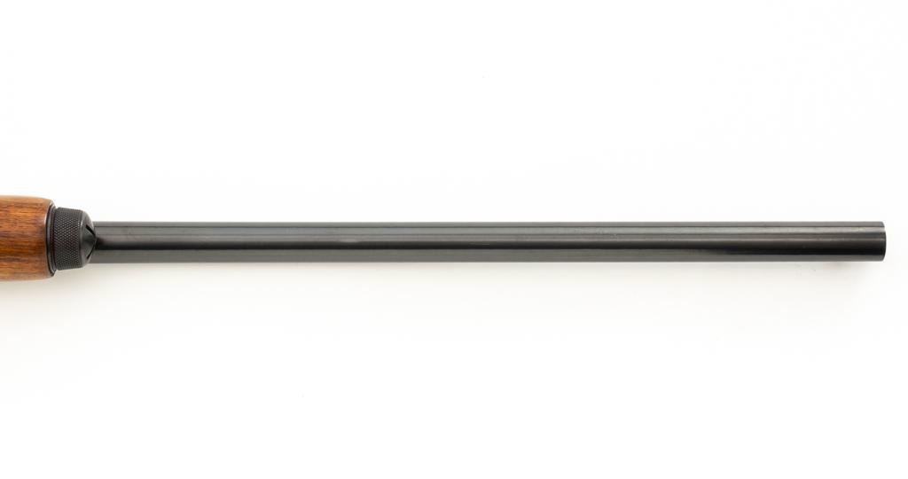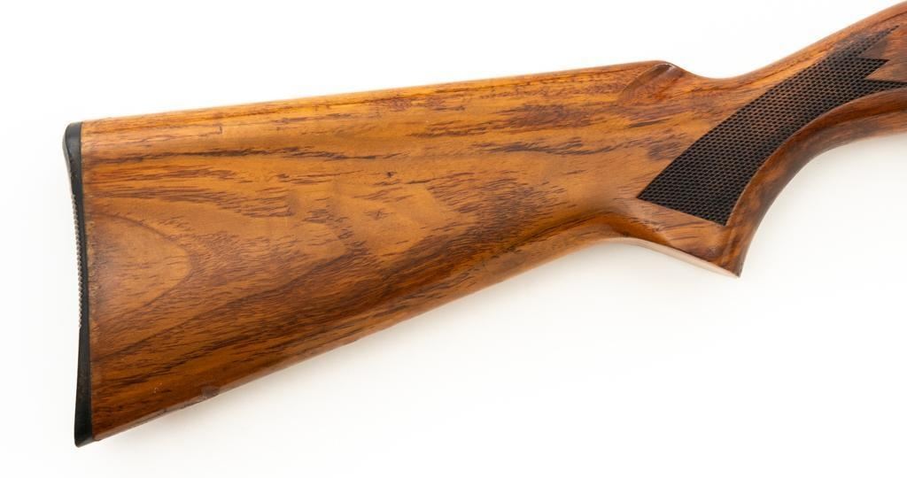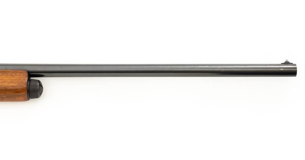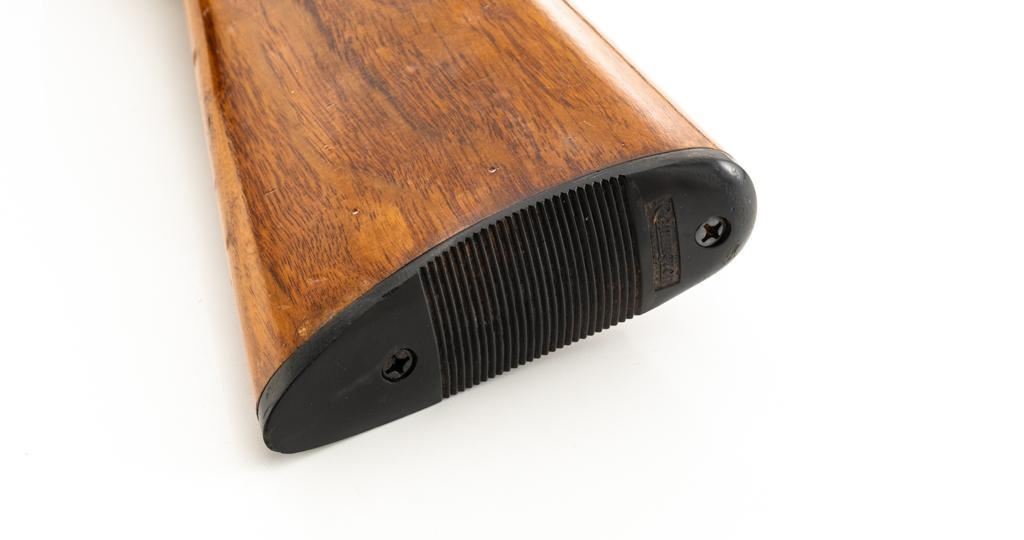 Remington Model 11-48 Semi-Automatic Shotgun, #5208731, 12 ga., 28'' plain barrel with 2-3/4'' chamber, Modified choke, and silver bead front sight; blue finish. Checkered pistol grip walnut stock and forend, with grooved black composite Remington buttplate; LOP 13-7/8''. Barrel date code is ''WW'', Mfg'd 1950. Condition is fine. Approx. 95%-97% factory blued finish remains, with scattered thinning, and few small handling marks. and light scratches. Stock has been lightly sanded and re-finished; there are light handling marks and scattered small dents. Checkering is clean but has smoothed. Action operates smoothly and locks up tight. Bore is bright. Est.: $300-$500. (C&R/PPT)