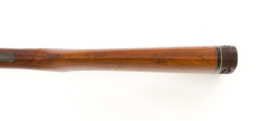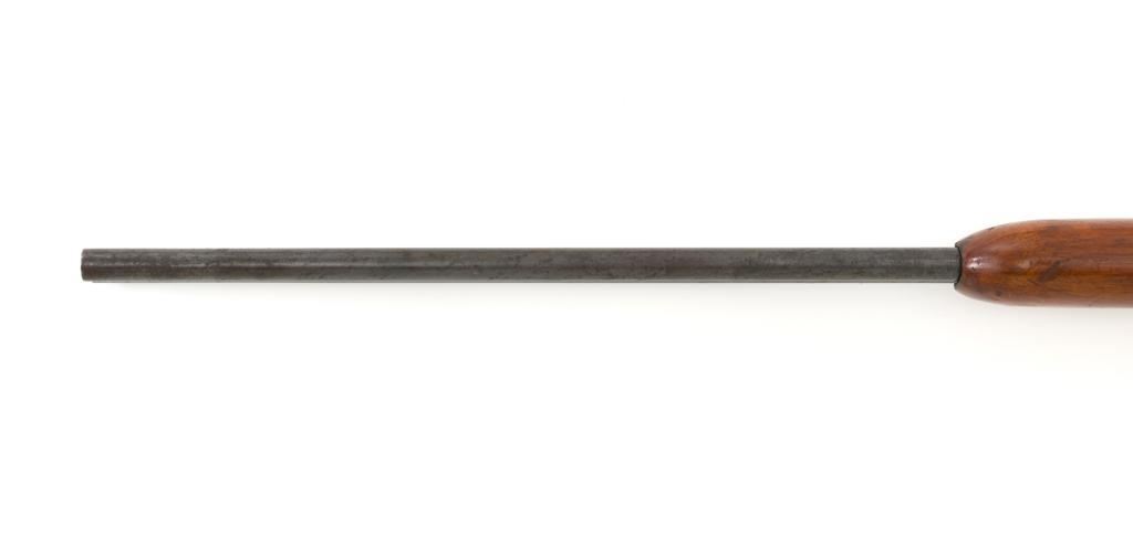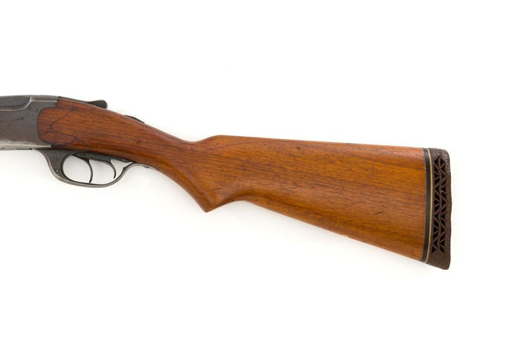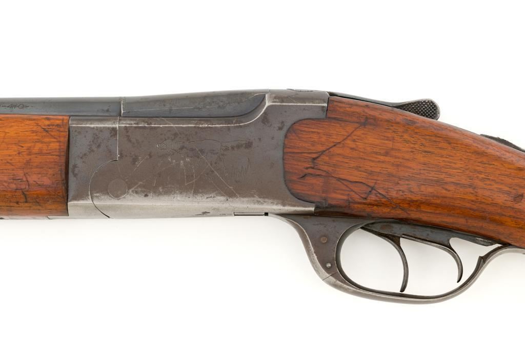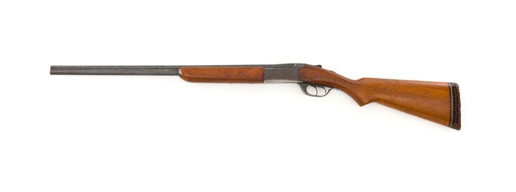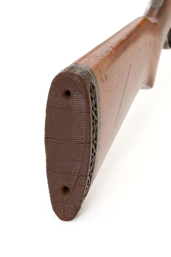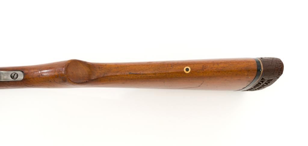 Scarce Marlin Model 90 Over/Under .410 Shotgun, #839, 26'' barrels with 3'' chambers, fixed IM/Mod chokes, and silver bead front sight. Metal with a blued finish, both sides of the receiver are lightly factory engraved with a ''Pointer'' standing in grass. Smooth pistol grip walnut stock and forend with ventilated brown rubber White Line recoil pad; LOP to end of deteriorating pad is 14-1/2'', 13-1/4'' to end of wood. Shotgun also features double triggers, automatic safety, and extractors. Condition is fair, showing general age and wear from field use. Approx. 70% thinning and toning blue remains, showing carry wear at bottom of the receiver. There are spots of moderate rust along the barrel, particularly within the first 8'' down from the muzzle. Engraving and factory lettering is clear. Wood with several dents and scratches, as well as a 1.25'' crack to the bottom of the forend, adjacent the receiver. Recoil pad has hardened with age and is deteriorating. Action functions properly and well-used, feeling just a little loose. Bores are bright and in excellent condition. Est.: $600-$800. (C&R/PPT)