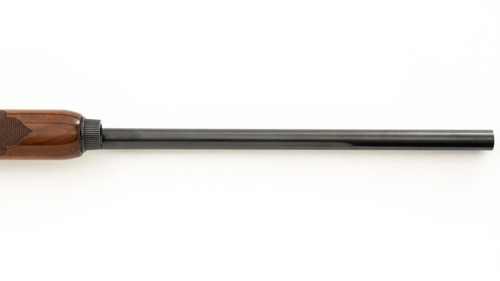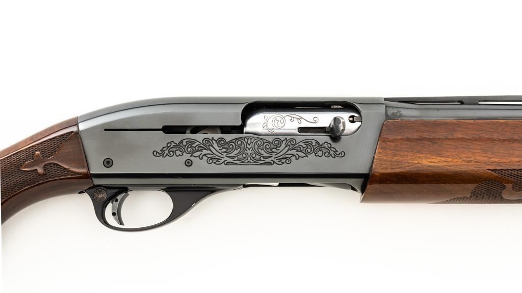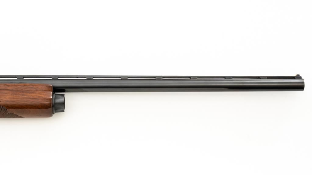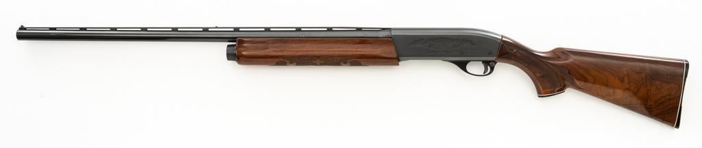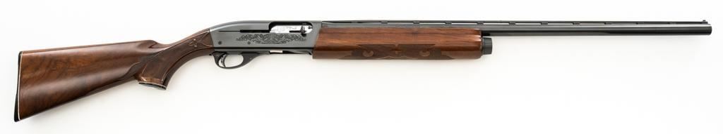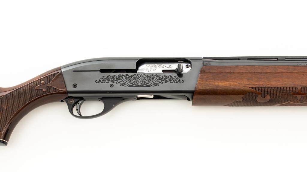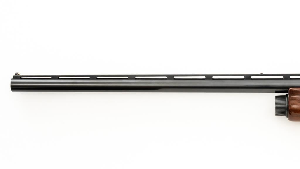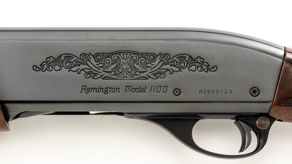Remington Model 1100 Field Grade Semi-Automatic Shotgun, #M789973V. 12 ga., 28" vent rib barrel with 2-3/4" chamber and Mod. choke. Finger groove forend and pistol grip buttstock are high-gloss straight-grained walnut, with pressed checkering, plastic grip cap, and buttplate. Sights include a front and middle ivory bead. Mfg'd approx. 1977, barrel code ''RO''. Condition is near excellent, showing light marks from handling and use on both the metal and wood. Action functions smoothly. Bore is bright. Est.: $400-$500. (Modern/PPT)
