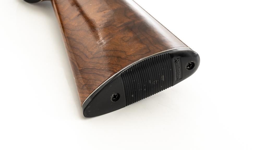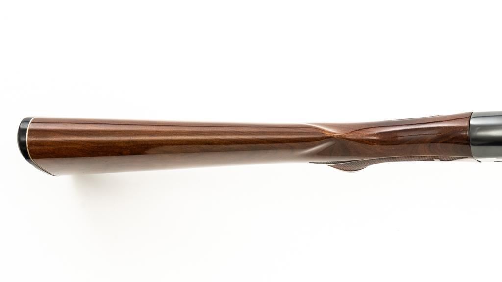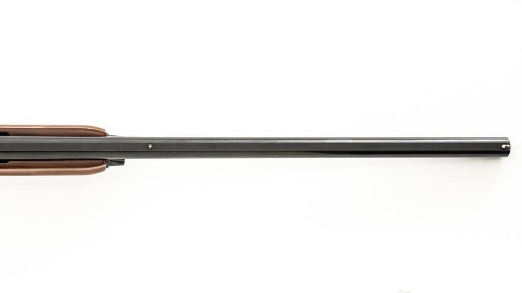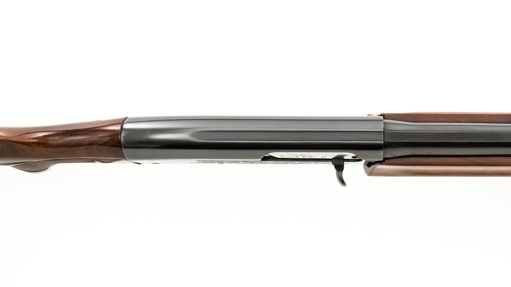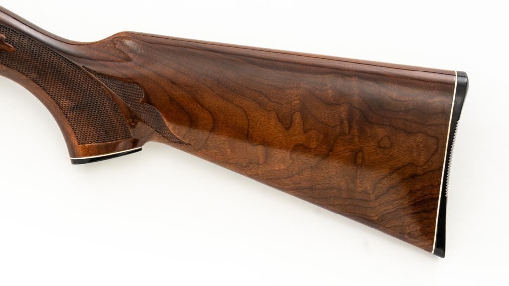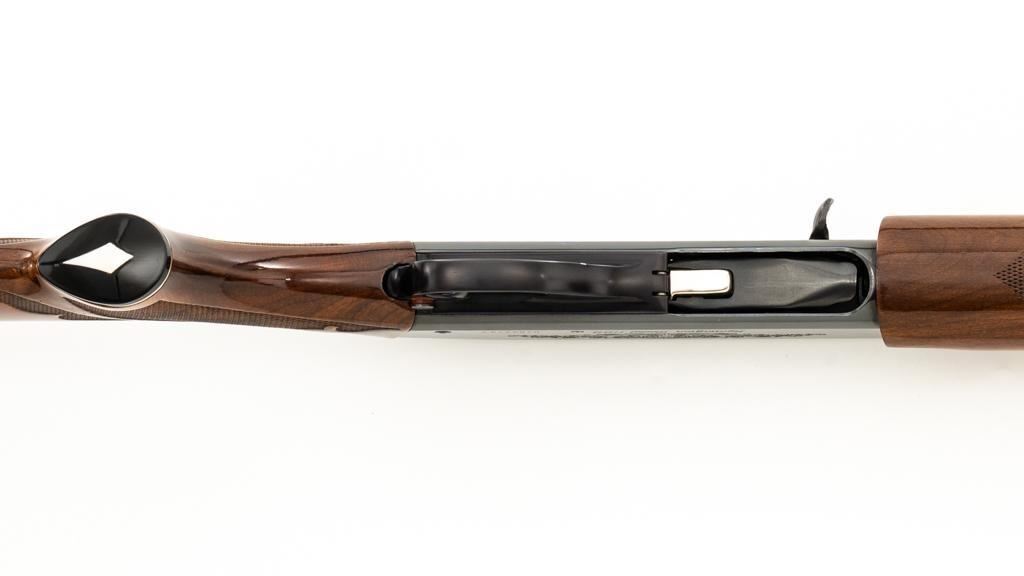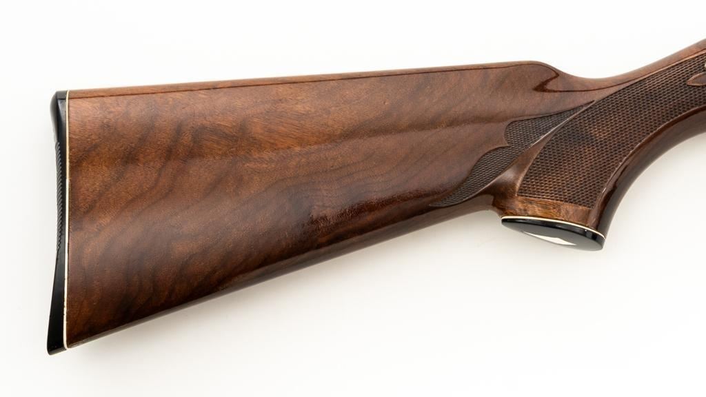 Remington Model 1100 Field Grade Semi-Automatic Shotgun, #M789973V. 12 ga., 28" vent rib barrel with 2-3/4" chamber and Mod. choke. Finger groove forend and pistol grip buttstock are high-gloss straight-grained walnut, with pressed checkering, plastic grip cap, and buttplate. Sights include a front and middle ivory bead. Mfg'd approx. 1977, barrel code ''RO''. Condition is near excellent, showing light marks from handling and use on both the metal and wood. Action functions smoothly. Bore is bright. Est.: $400-$500. (Modern/PPT)
