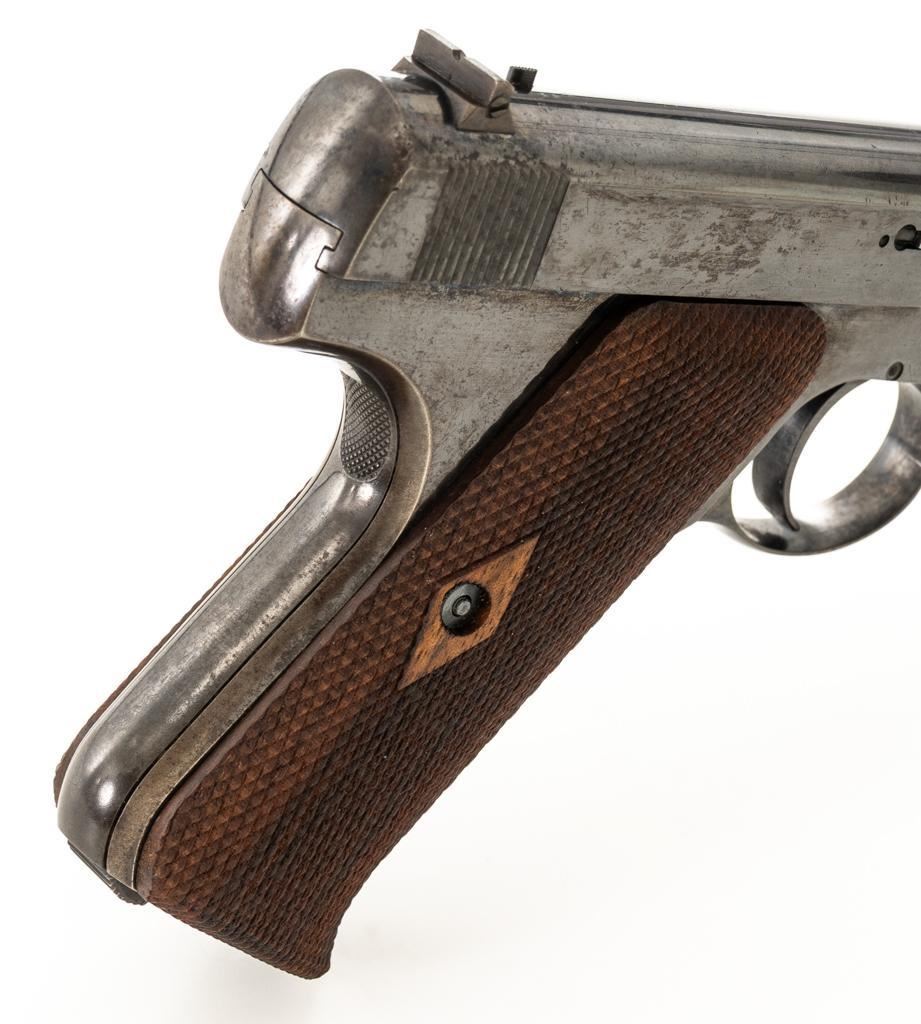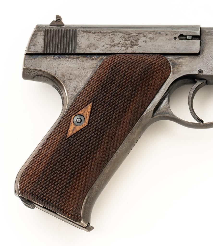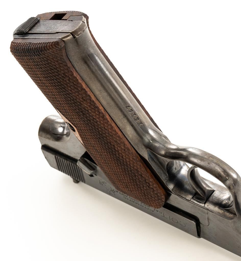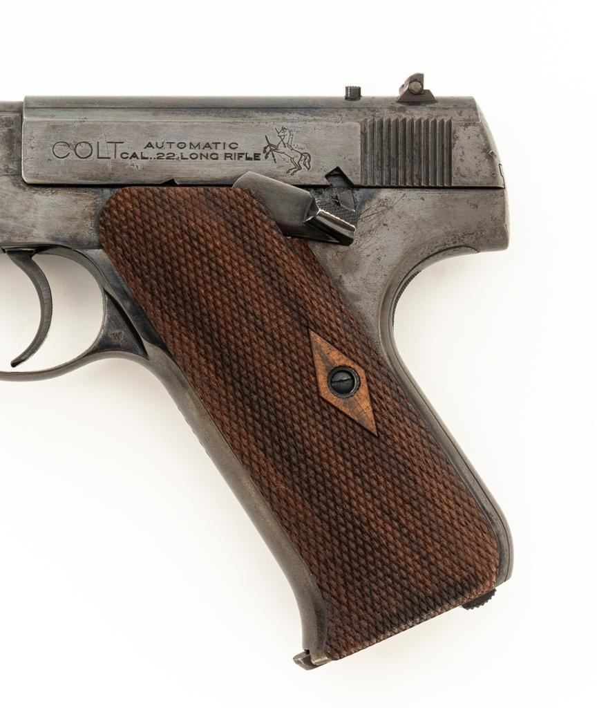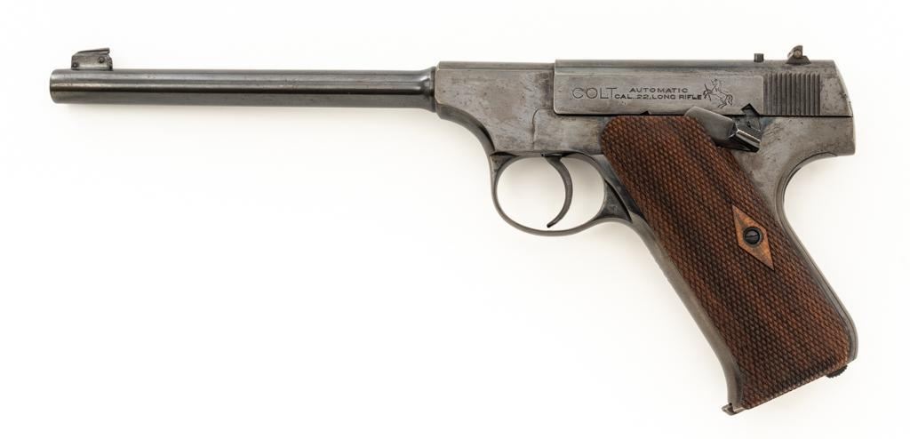 Early Colt Pre-Woodsman Semi-Automatic Target Pistol, #15197, .22 LR cal., 6-5/8'' barrel, blue finish, checkered walnut two-piece aftermarket grips, pinned blade front and drift adjustable square-notch rear sight. Includes one correct 10-round magazine, marked ''COLT / CAL.22 L.R.''. Mfg'd 1920. Pistol is in fine overall condition, retaining approx. 90%-92% thinning finish, with light wear at the muzzle and scratches along the barrel. Frame and slide show edgewear and losses of finish with areas of light corrosion. Grips are excellent and mimic the original pattern, fitting well. Action functions well and locks up securely. Bore is very good, showing moderate wear, with defined rifling. Est.: $600-$800. (C&R)