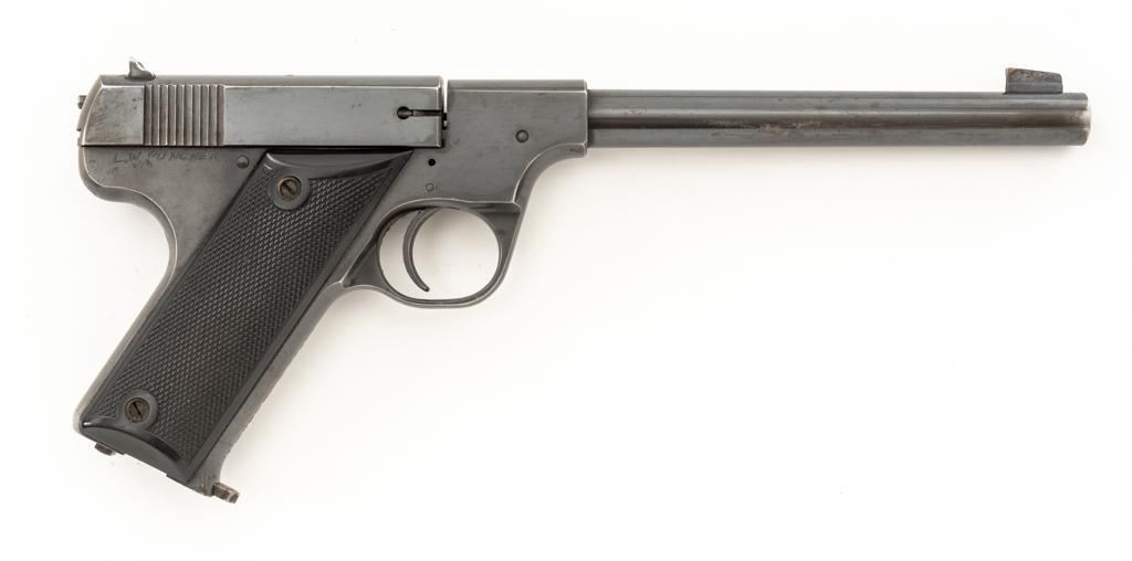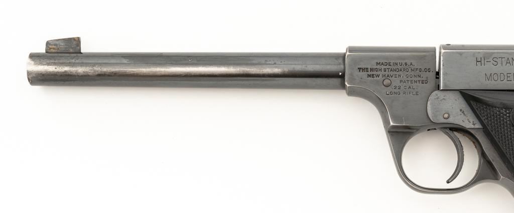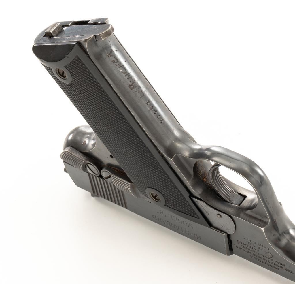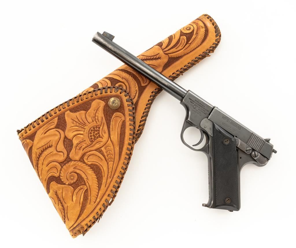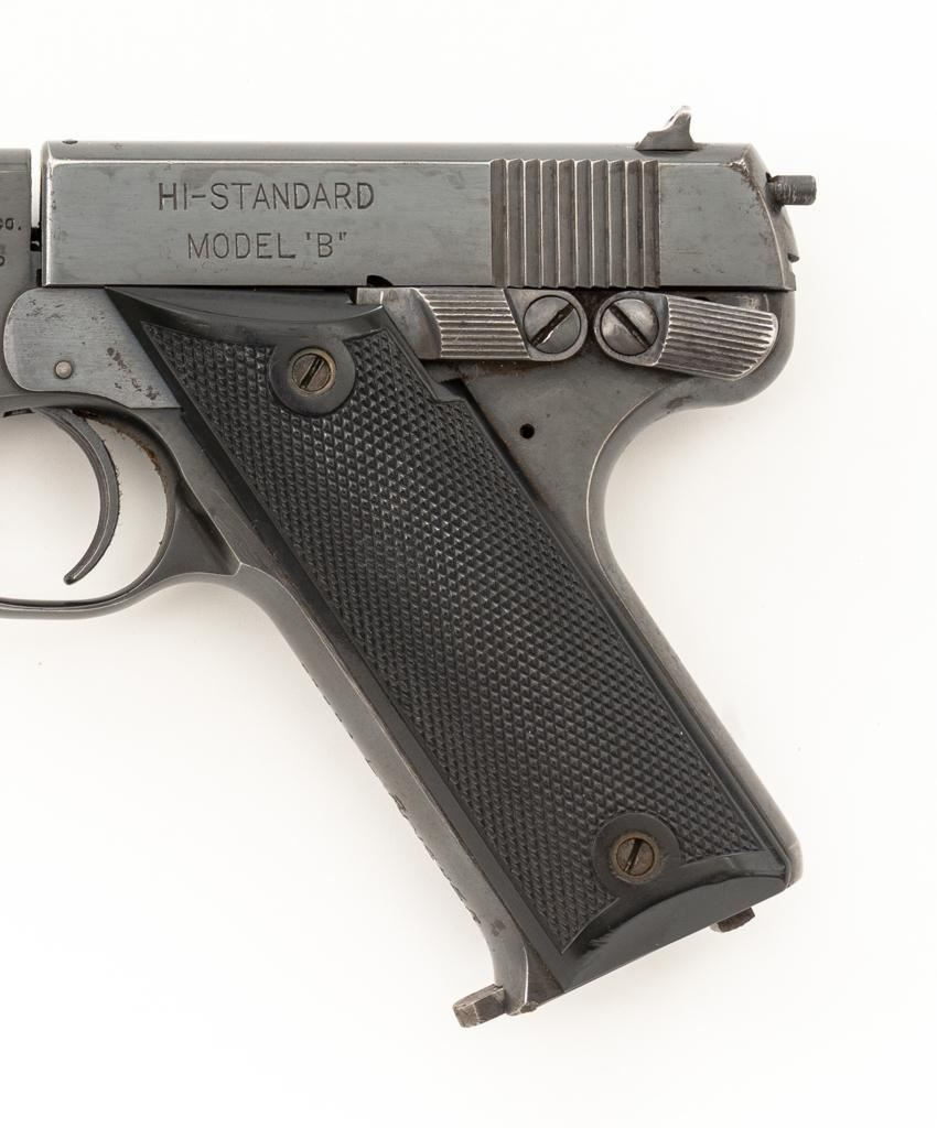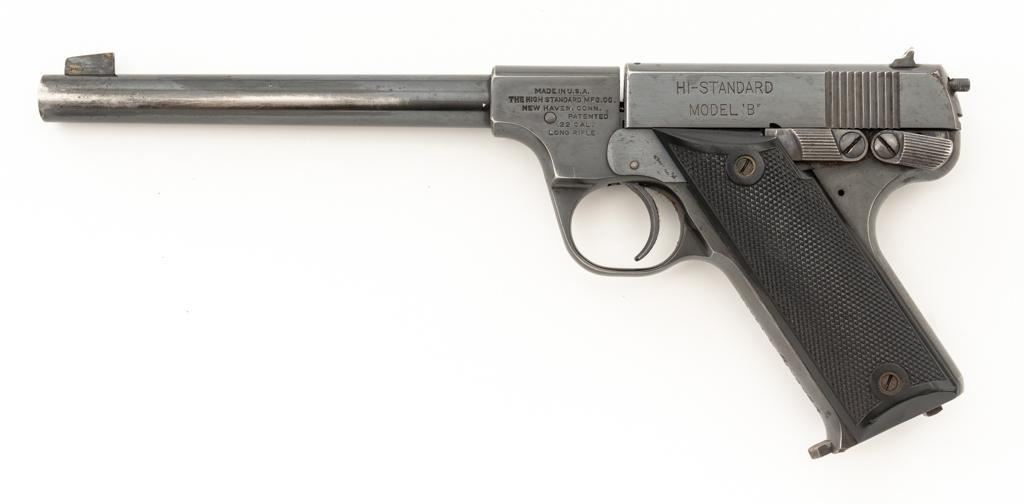 High Standard Model B Semi-Automatic Pistol, #23961, .22 LR cal., 6.75'' barrel, blue finish, checkered hard rubber two-piece grips, Patridge front and drift adjustable square-notch rear sight, with one correct unmarked two-tone 10-round blue steel magazine. Marked ''MADE IN U.S.A./THE HIGH STANDARD MFG. CO. /NEW HAVEN CONN.'' on the left barrel lug, a prior owner has etched ''L.W. PUNCHER'' at the left rear of the frame and ''L. PUNCHER'' on the front strap. Includes a period unmarked tooled leather right-hand flap holster with brass snap. Holster is in very good used condition. Mfg'd 1937. Pistol is in very good+ overall condition, retaining approx. 85%-90% thinning factory finish, with wear at the muzzle and loss of finish on the left side of the barrel. Frame and slide show moderate edgewear and scattered areas of light surface erosion. Grips are in fine condition with sharp checkering detail. Action functions well. Bore is very good with some areas of minor erosion and well-defined rifling. Est.: $300-$500. (C&R/PPT)