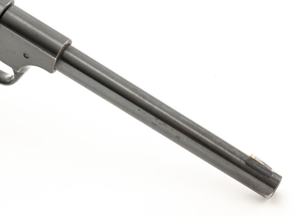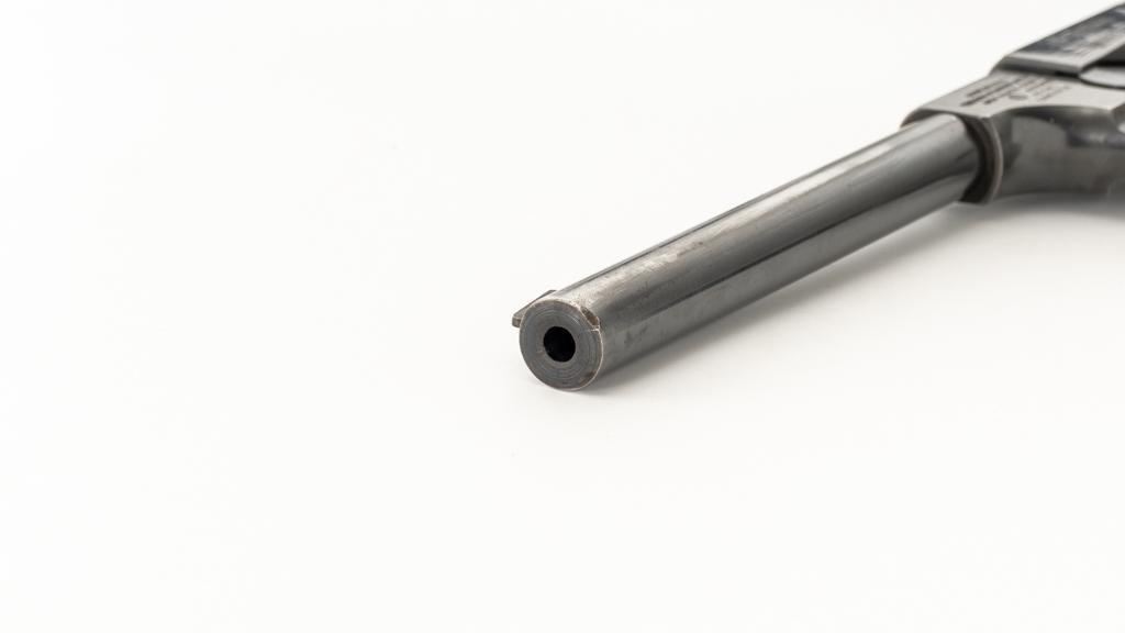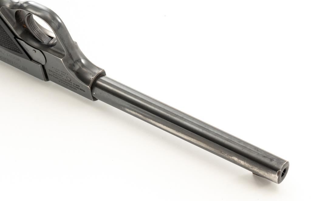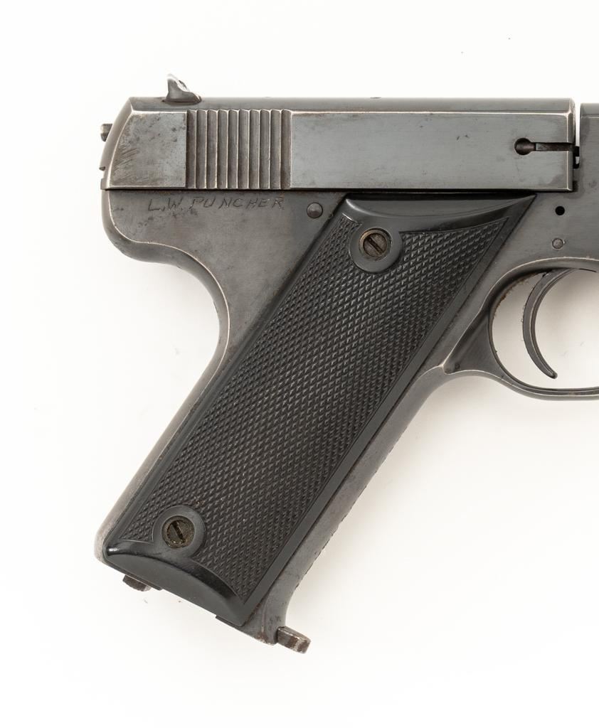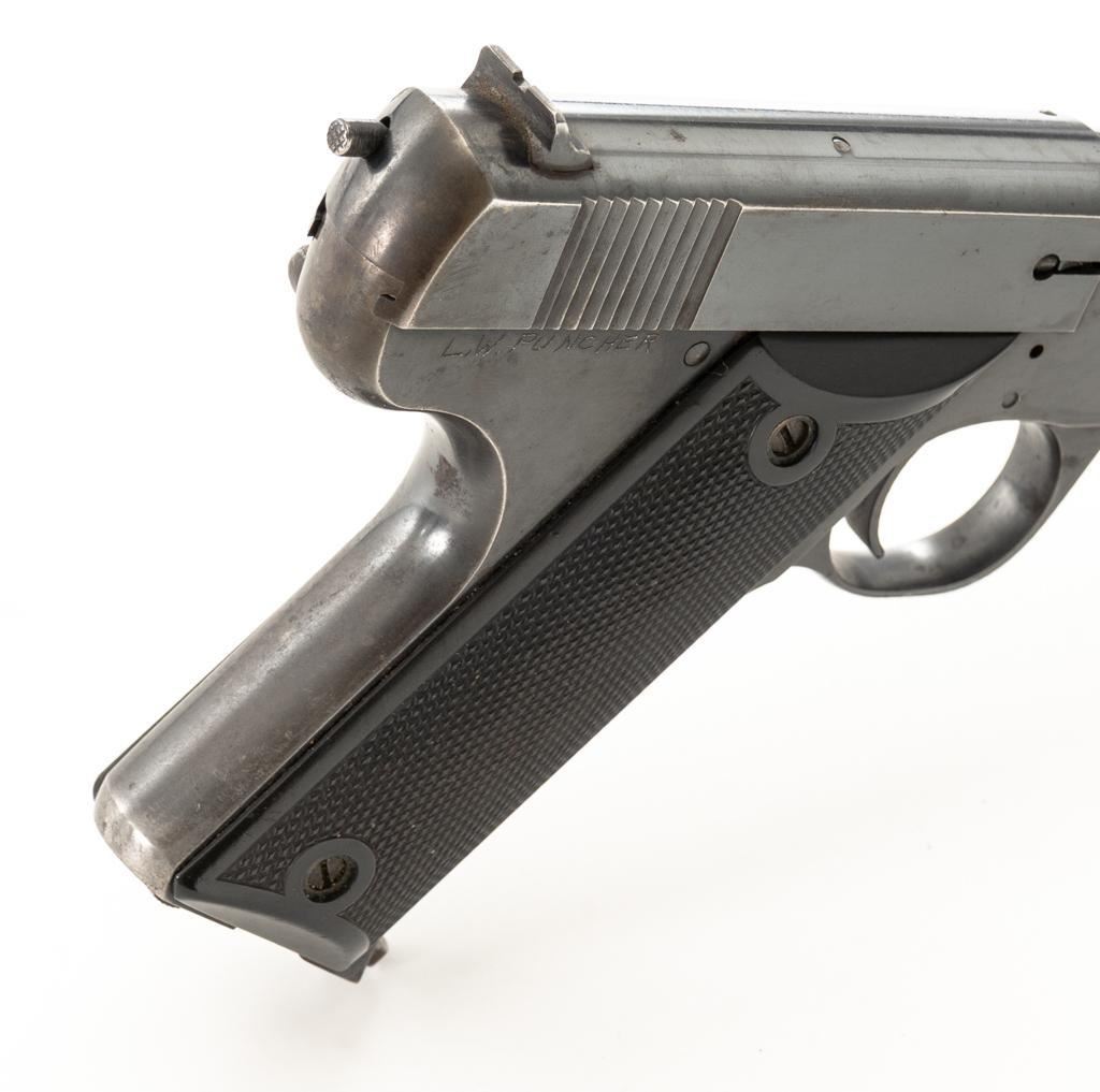 High Standard Model B Semi-Automatic Pistol, #23961, .22 LR cal., 6.75'' barrel, blue finish, checkered hard rubber two-piece grips, Patridge front and drift adjustable square-notch rear sight, with one correct unmarked two-tone 10-round blue steel magazine. Marked ''MADE IN U.S.A./THE HIGH STANDARD MFG. CO. /NEW HAVEN CONN.'' on the left barrel lug, a prior owner has etched ''L.W. PUNCHER'' at the left rear of the frame and ''L. PUNCHER'' on the front strap. Includes a period unmarked tooled leather right-hand flap holster with brass snap. Holster is in very good used condition. Mfg'd 1937. Pistol is in very good+ overall condition, retaining approx. 85%-90% thinning factory finish, with wear at the muzzle and loss of finish on the left side of the barrel. Frame and slide show moderate edgewear and scattered areas of light surface erosion. Grips are in fine condition with sharp checkering detail. Action functions well. Bore is very good with some areas of minor erosion and well-defined rifling. Est.: $300-$500. (C&R/PPT)