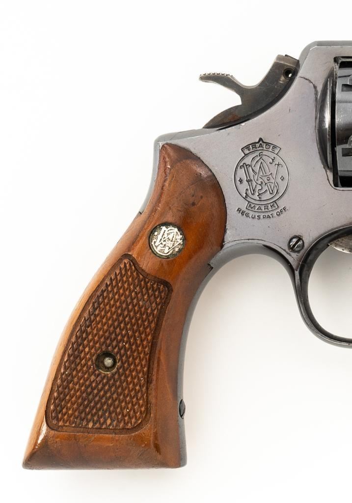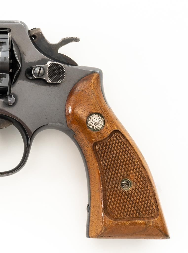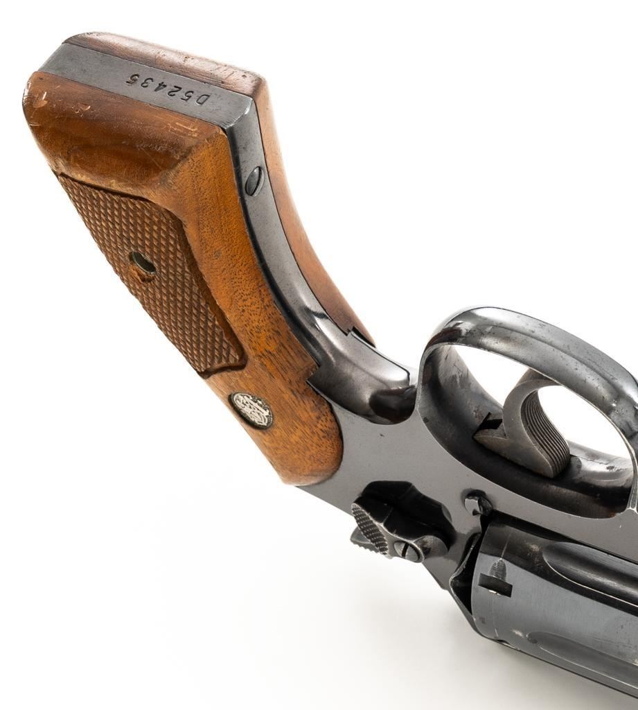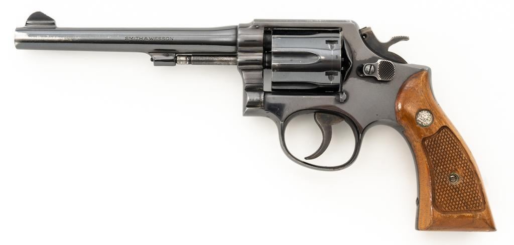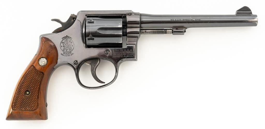 Early Smith & Wesson Model 10-5 Double Action Only Revolver, #D52435, .38 Spl. cal., 6'' pinned barrel, blue finish, checkered walnut two-piece grips with S&W medallions, serrated ramped blade front sight, fixed square-notch rear sight, with color case hardened hammer and trigger. Mfg'd 1968. Revolver is in near fine overall condition, retaining approx 94%-95% factory finish, with wear at the muzzle and thinning along the barrel. Cylinder shows leading edgewear, wear around the flutes, and index line at the rear. Frame and straps show modest edgewear. Factory lettering is clear. Hammer and trigger display muted color case hardened finish. Grips are very good with minor marks and smoothing of the checkering. Interior of the right panel is stamped with the matching serial number and both panels are stamped ''KPC''. Action functions well and locks up securely. Bore is very good with light frosting, and well-defined rifling. Est.: $400-$600. (C&R/PPT)
