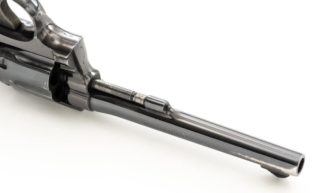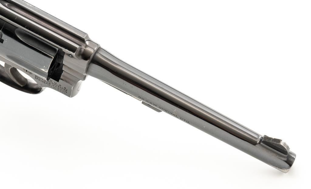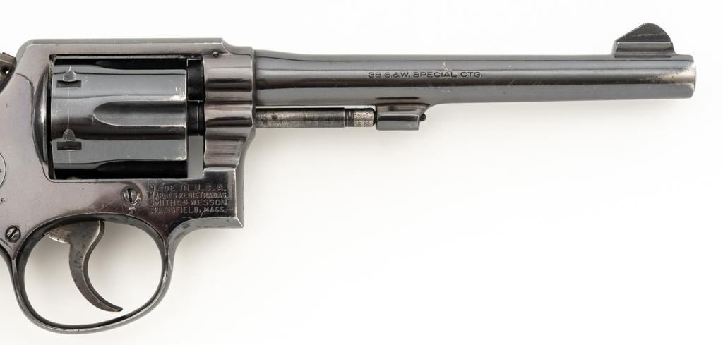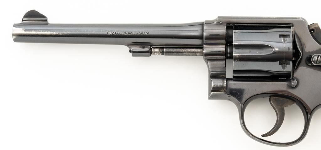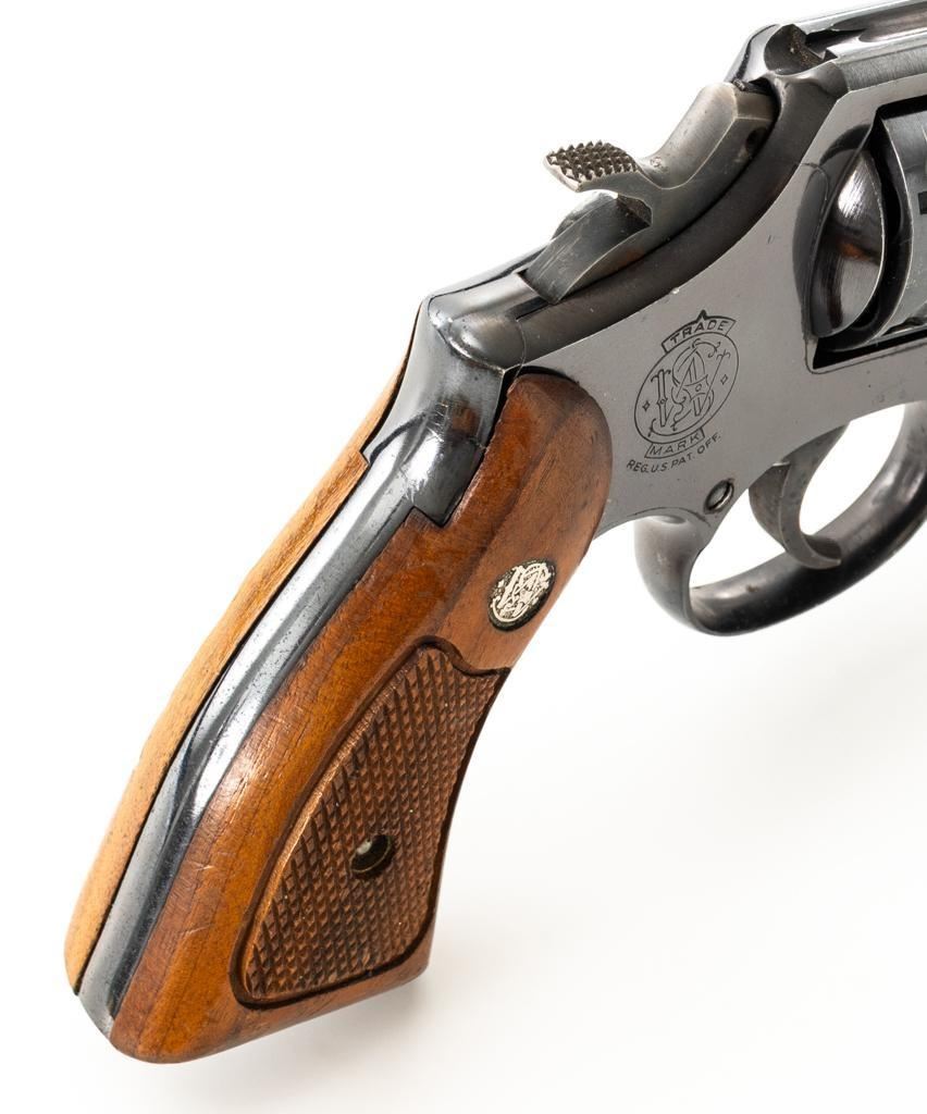 Early Smith & Wesson Model 10-5 Double Action Only Revolver, #D52435, .38 Spl. cal., 6'' pinned barrel, blue finish, checkered walnut two-piece grips with S&W medallions, serrated ramped blade front sight, fixed square-notch rear sight, with color case hardened hammer and trigger. Mfg'd 1968. Revolver is in near fine overall condition, retaining approx 94%-95% factory finish, with wear at the muzzle and thinning along the barrel. Cylinder shows leading edgewear, wear around the flutes, and index line at the rear. Frame and straps show modest edgewear. Factory lettering is clear. Hammer and trigger display muted color case hardened finish. Grips are very good with minor marks and smoothing of the checkering. Interior of the right panel is stamped with the matching serial number and both panels are stamped ''KPC''. Action functions well and locks up securely. Bore is very good with light frosting, and well-defined rifling. Est.: $400-$600. (C&R/PPT)