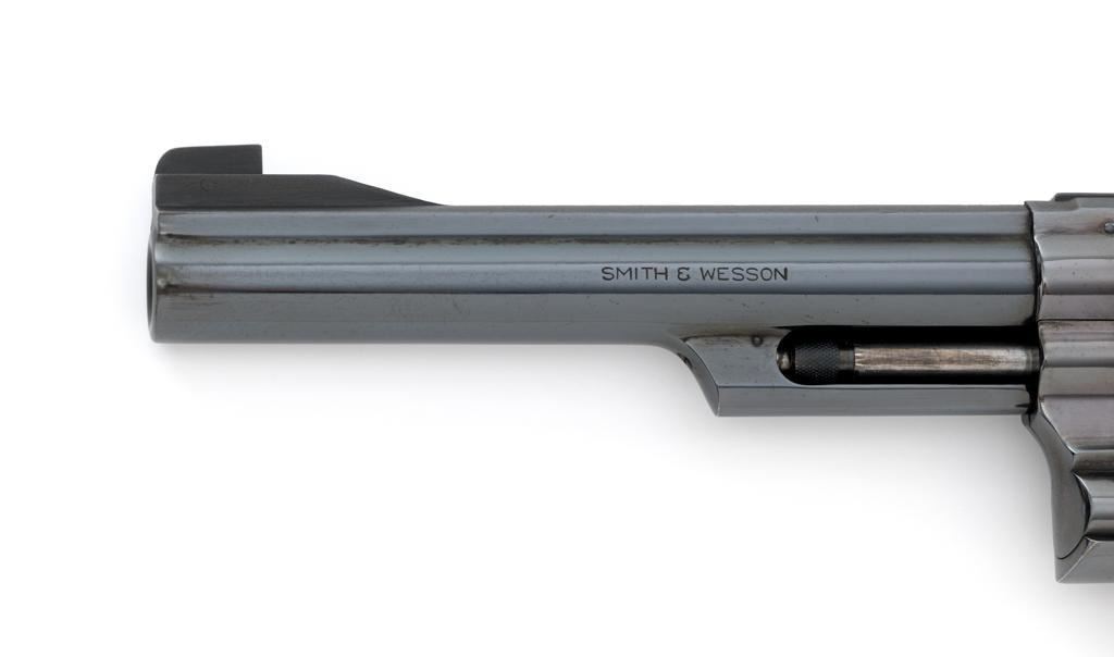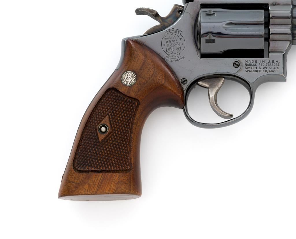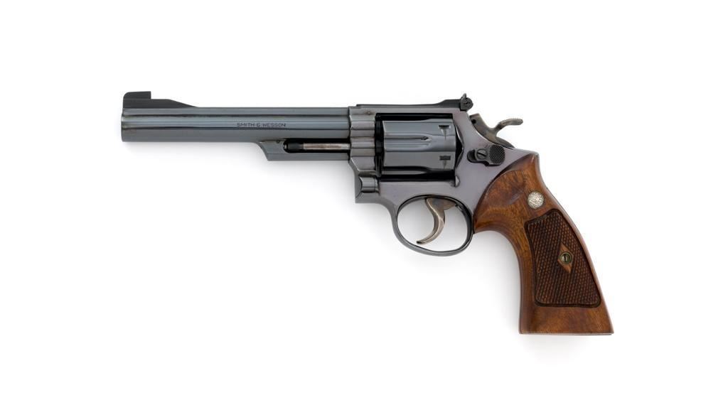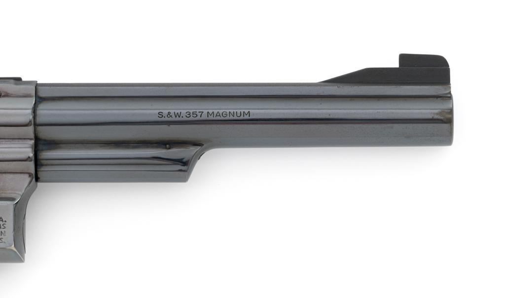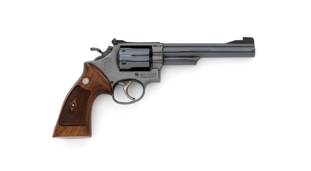Smith & Wesson Model 19-3 Combat Magnum Double Action Revolver, #7K79254, .357 Mag. cal., 6'' pinned barrel, high polish dark blue finish, checkered walnut square-butt diamond target grips with S&W medallions, Patridge front sight, and square-notched rear sight adjustable for windage and elevation; color case hardened target trigger and target hammer. Mfg'd 1975. Condition is excellent, retaining approx. 98%+ original factory blue, with light handling marks. Right side of the rib has several very small nicks towards the muzzle. Factory lettering is crisp and clear. Hammer retains approx 97%-98% case colors while the trigger has mostly faded to a gray patina. Cylinder with a light index line. Grips near excellent, showing very light handling wear; checkering is sharp. Action cycles smoothly and locks up tight. Bore is bright with excellent rifling. Est.: $700-$1,000. (C&R)