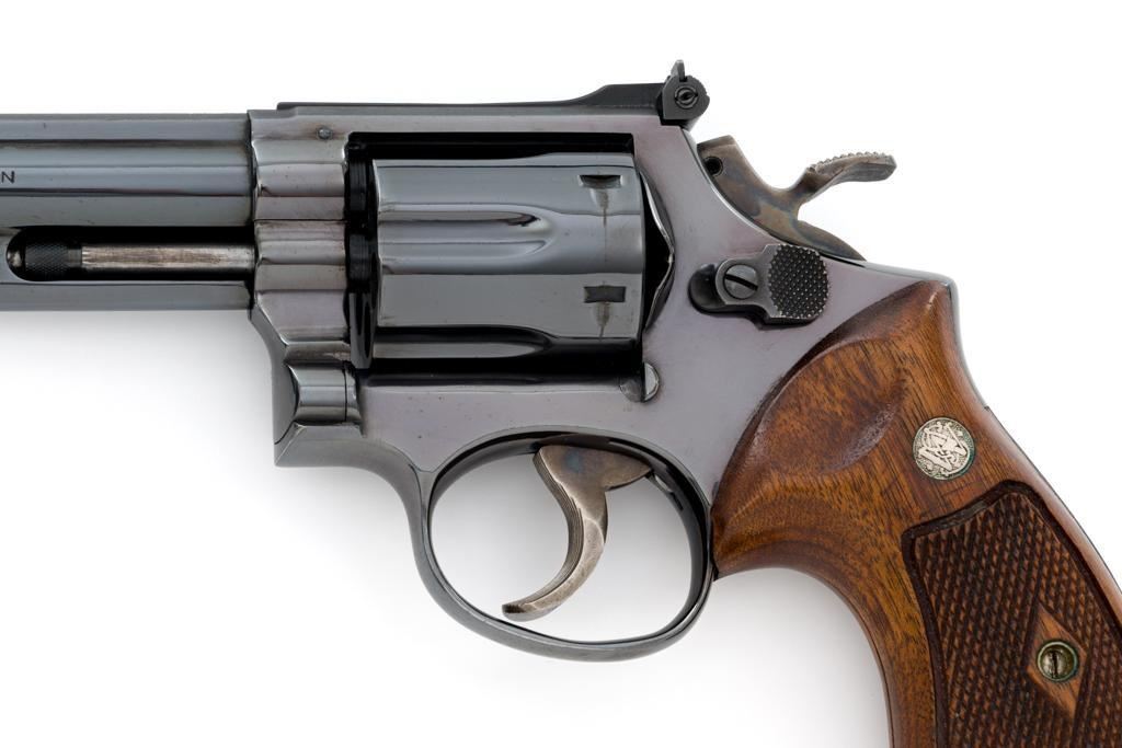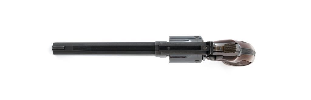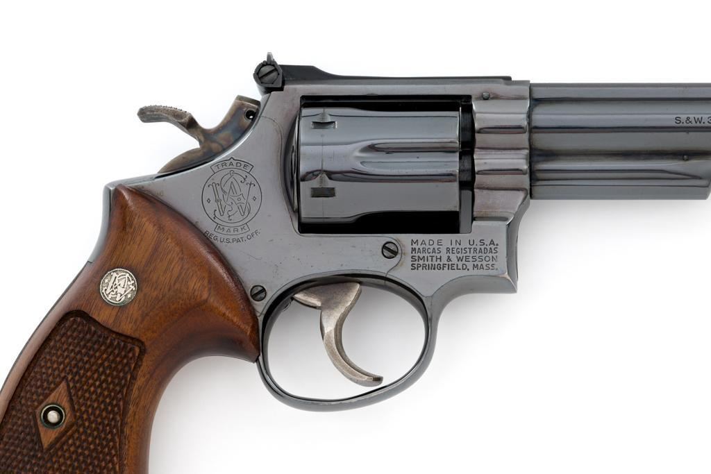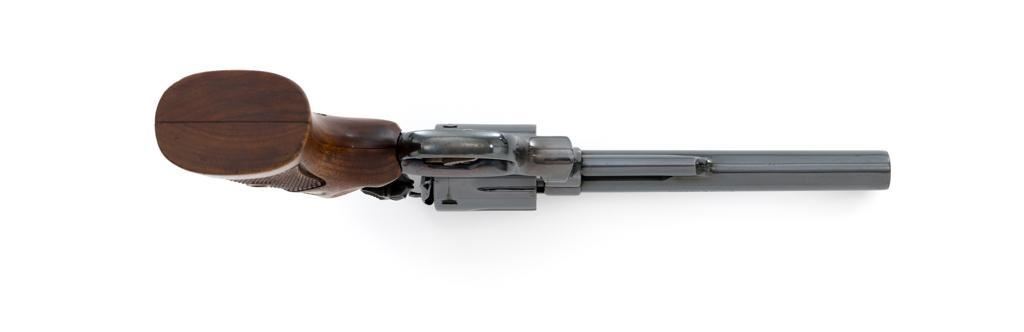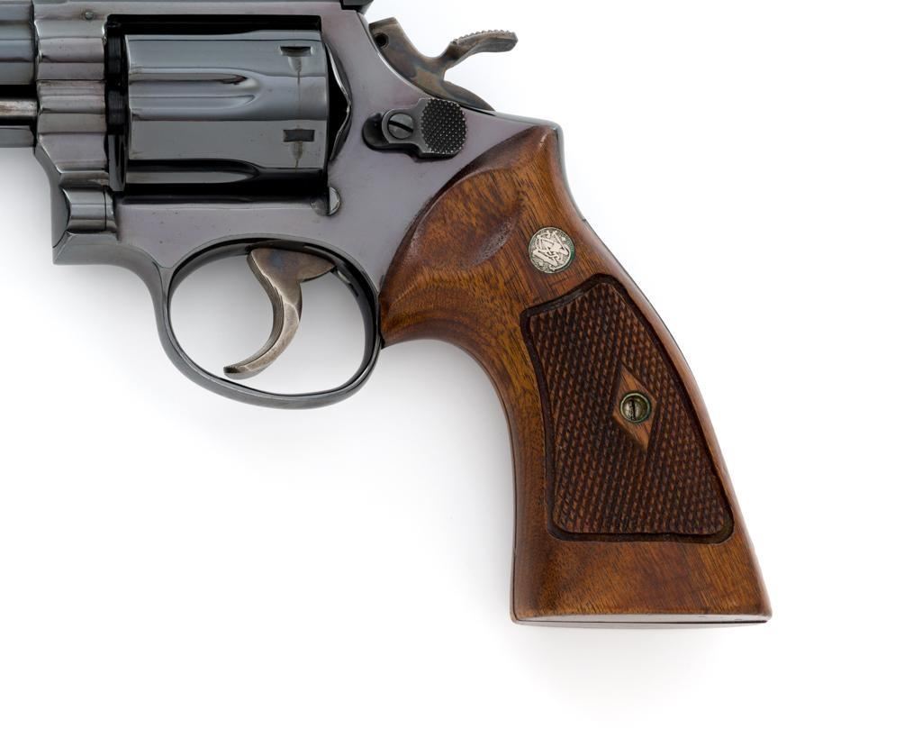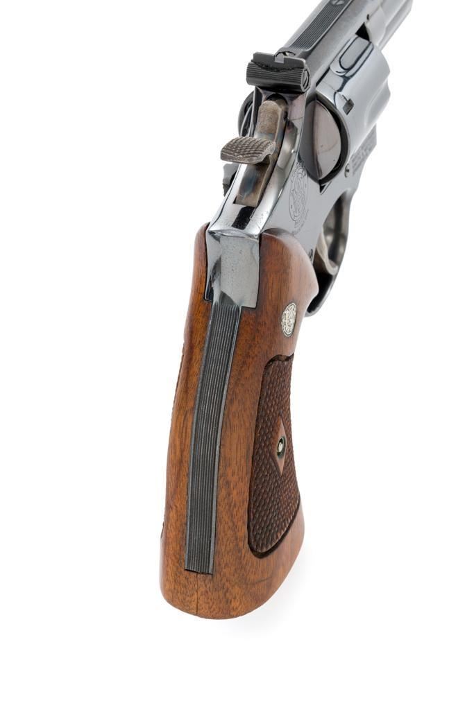 Smith & Wesson Model 19-3 Combat Magnum Double Action Revolver, #7K79254, .357 Mag. cal., 6'' pinned barrel, high polish dark blue finish, checkered walnut square-butt diamond target grips with S&W medallions, Patridge front sight, and square-notched rear sight adjustable for windage and elevation; color case hardened target trigger and target hammer. Mfg'd 1975. Condition is excellent, retaining approx. 98%+ original factory blue, with light handling marks. Right side of the rib has several very small nicks towards the muzzle. Factory lettering is crisp and clear. Hammer retains approx 97%-98% case colors while the trigger has mostly faded to a gray patina. Cylinder with a light index line. Grips near excellent, showing very light handling wear; checkering is sharp. Action cycles smoothly and locks up tight. Bore is bright with excellent rifling. Est.: $700-$1,000. (C&R)
