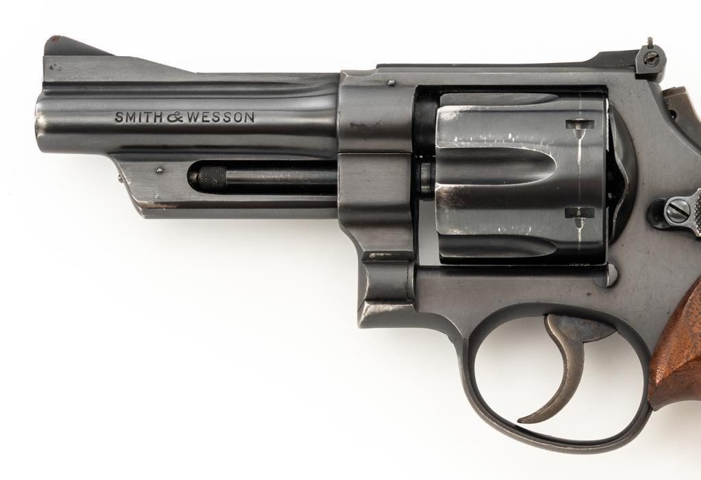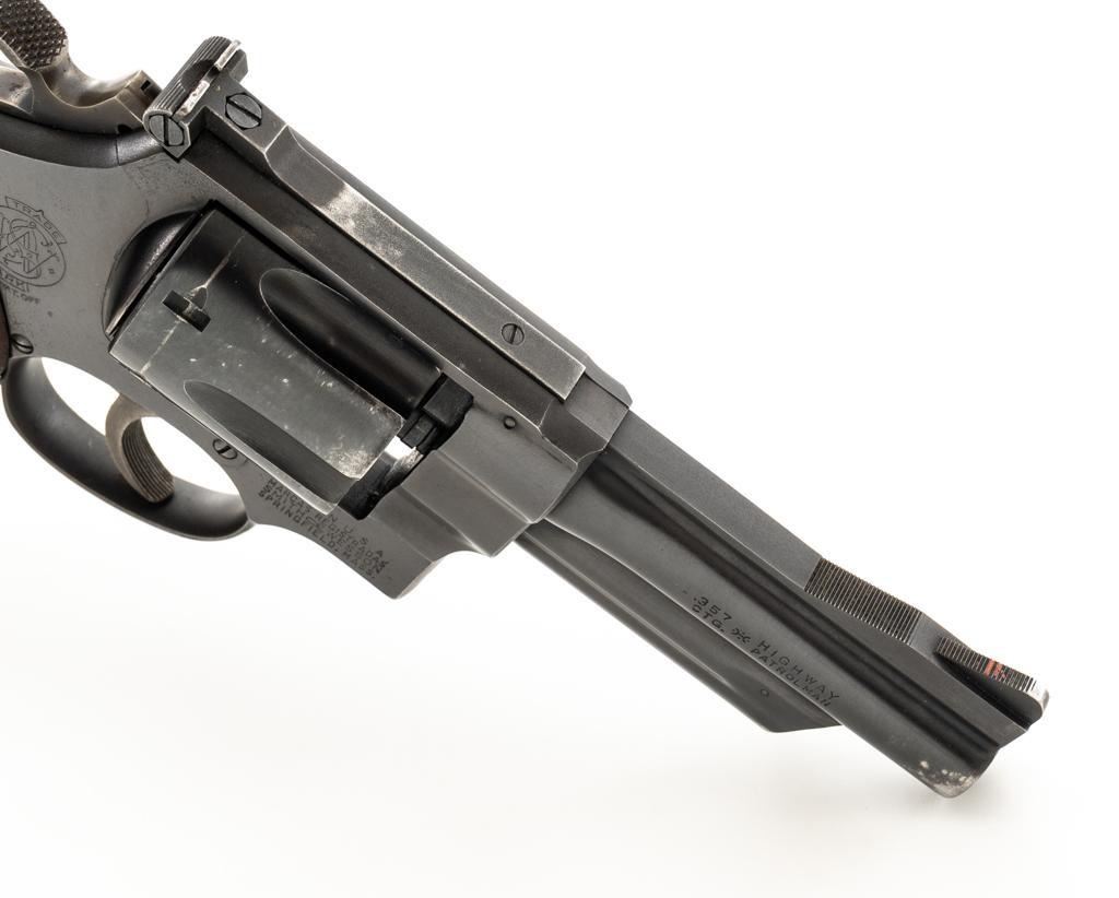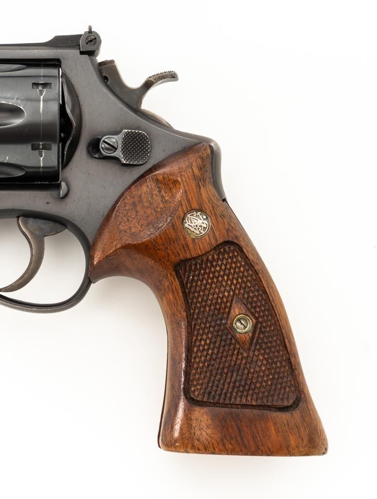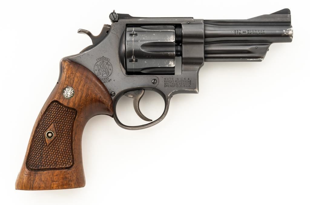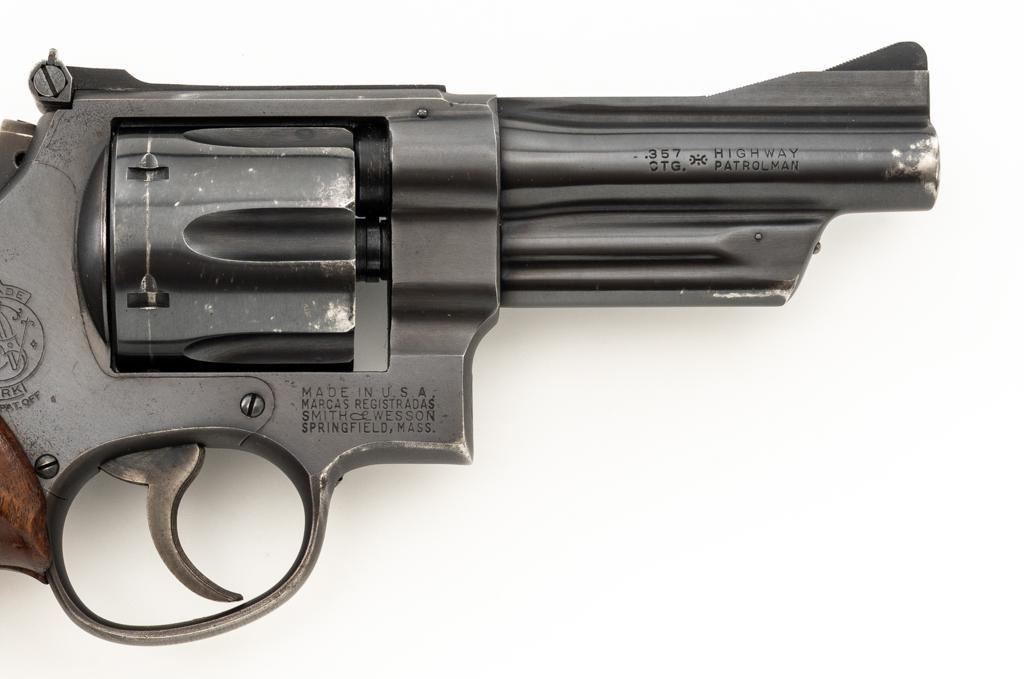 Early Smith & Wesson Model 28 (No Dash) Highway Patrolman Double Action Revolver, #S191458, .357 Mag. cal., 4'' pinned barrel, blue finish, diamond center checkered walnut two-piece Magna grips with S&W medallions, 4-screw frame, serrated ramped blade front sight, micro adjustable square-notch rear sight, with color case hardened hammer and trigger. Mfg'd 1959. Revolver is in near fine overall condition, retaining approx 92%-93% toning factory finish, with holster wear at the muzzle and along the barrel. Cylinder shows leading edge wear and thinning finish, with a moderate index line. Hammer and trigger display muted color case hardened finish. Grips with light indentations, showing minor flattening of the checkering. Action functions smoothly and locks up securely. Bore is very good with light erosion at the breech and defined rifling. Est.: $800-$1,000. (C&R/PPT)