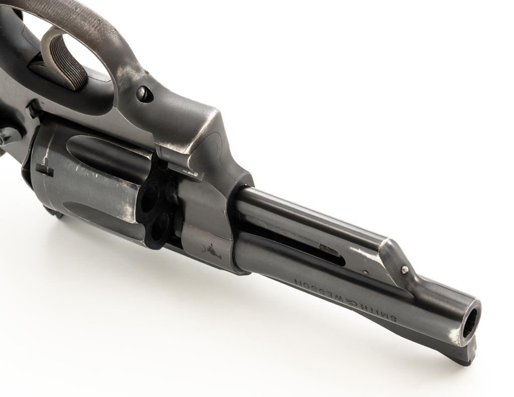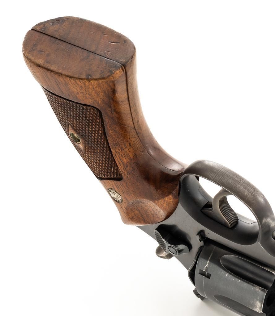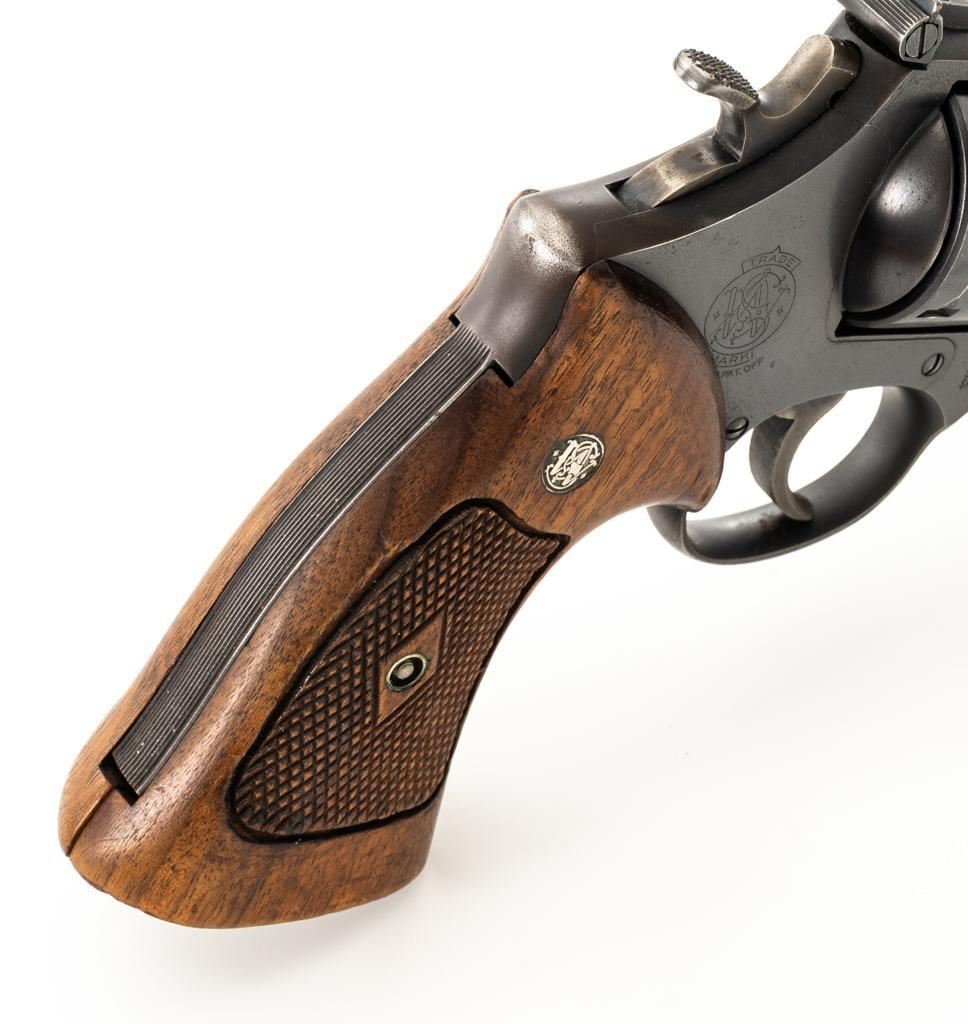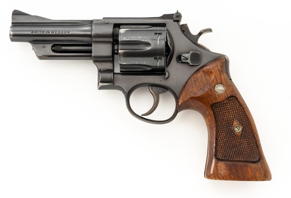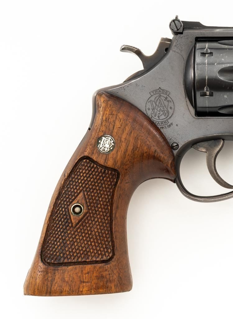 Early Smith & Wesson Model 28 (No Dash) Highway Patrolman Double Action Revolver, #S191458, .357 Mag. cal., 4'' pinned barrel, blue finish, diamond center checkered walnut two-piece Magna grips with S&W medallions, 4-screw frame, serrated ramped blade front sight, micro adjustable square-notch rear sight, with color case hardened hammer and trigger. Mfg'd 1959. Revolver is in near fine overall condition, retaining approx 92%-93% toning factory finish, with holster wear at the muzzle and along the barrel. Cylinder shows leading edge wear and thinning finish, with a moderate index line. Hammer and trigger display muted color case hardened finish. Grips with light indentations, showing minor flattening of the checkering. Action functions smoothly and locks up securely. Bore is very good with light erosion at the breech and defined rifling. Est.: $800-$1,000. (C&R/PPT)