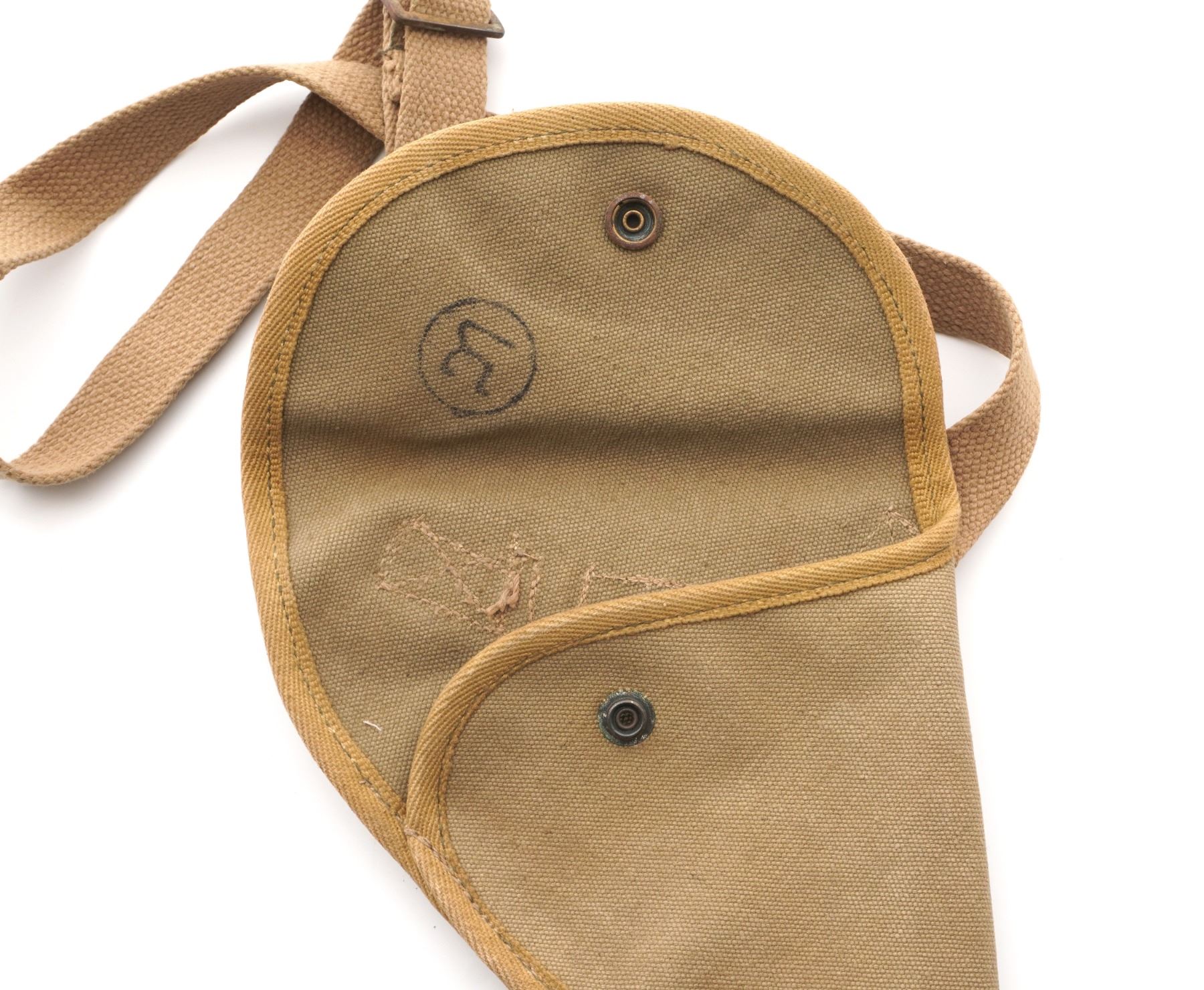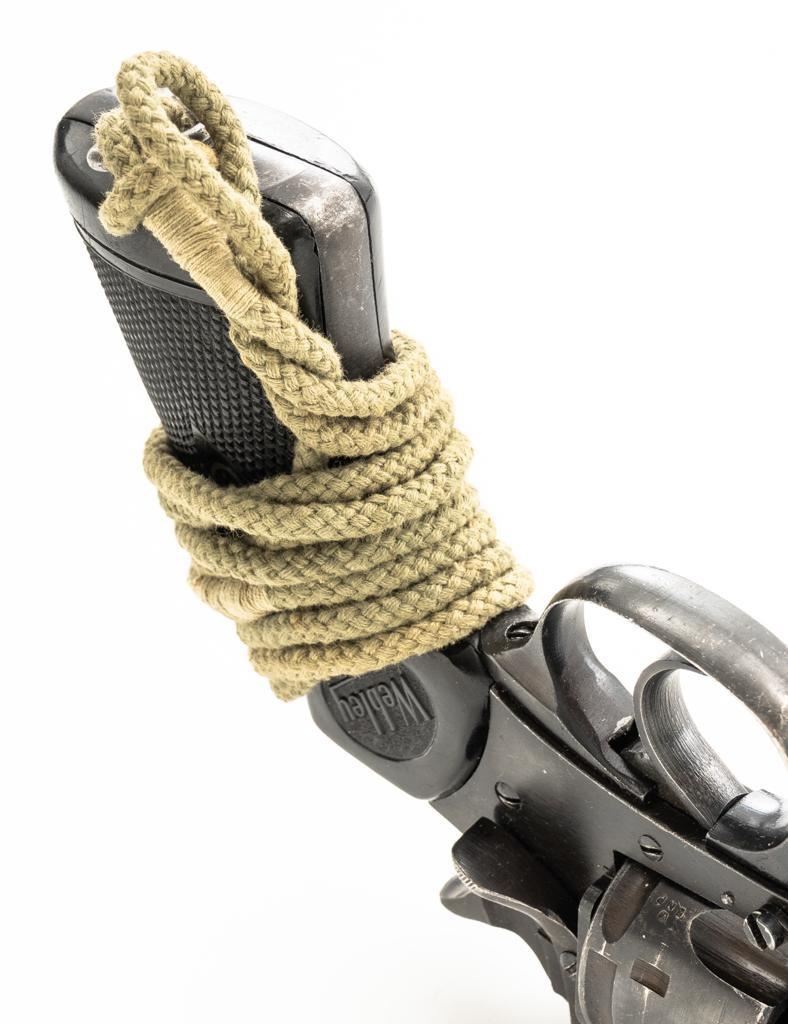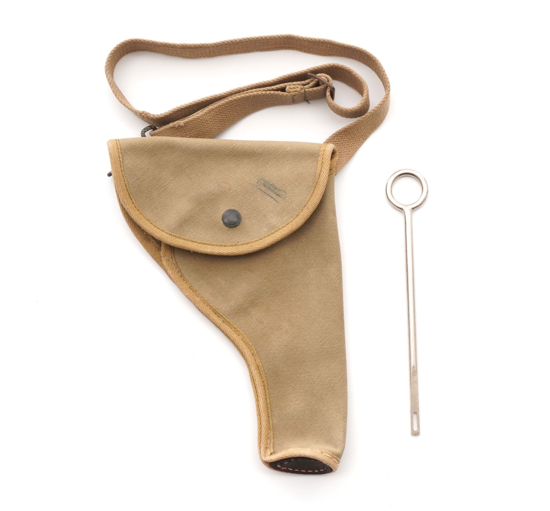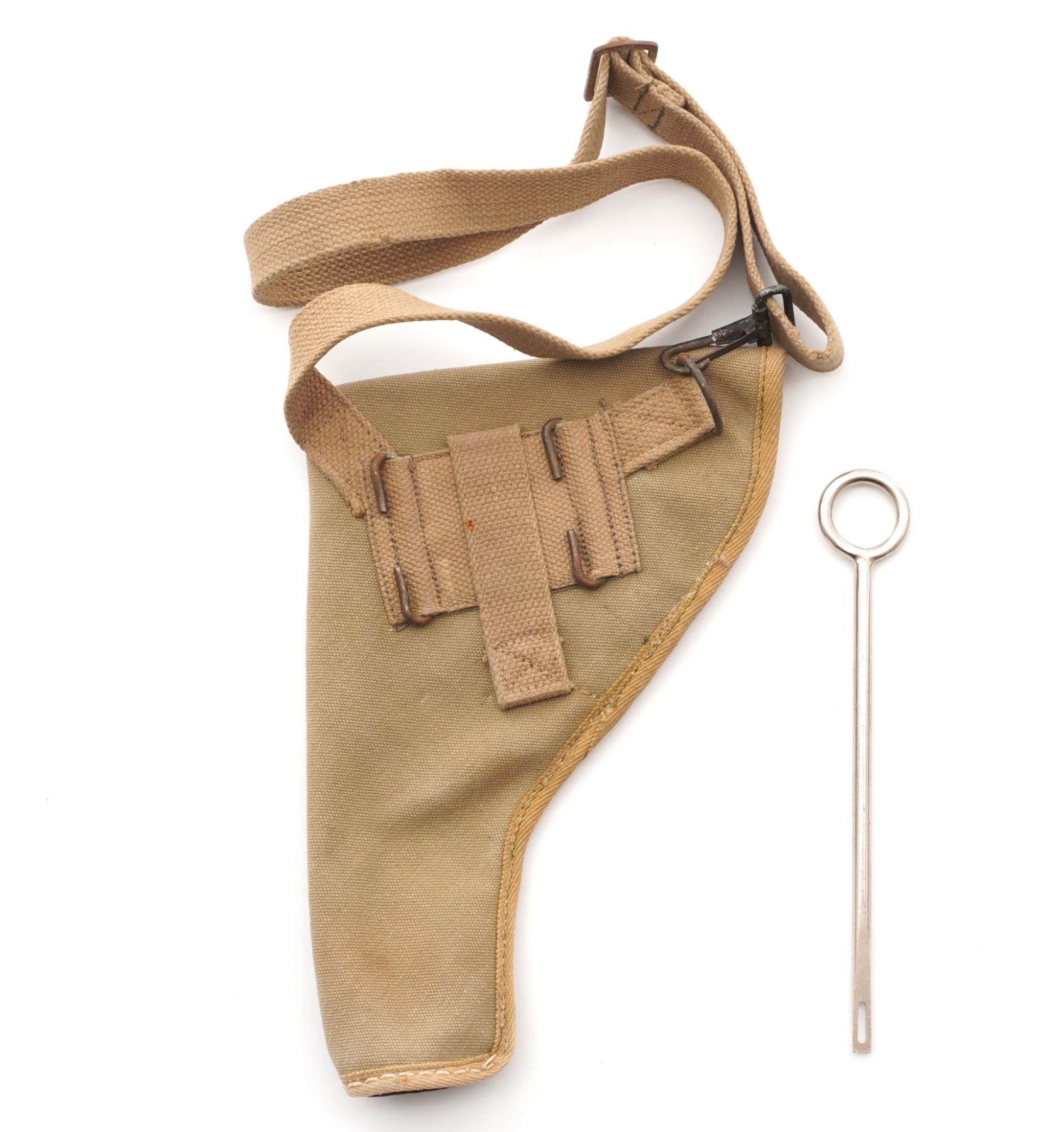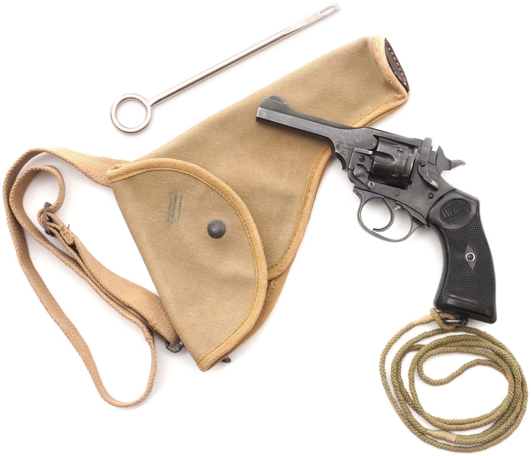 Israeli Issued Webley Mk IV Double Action Revolver, with Israeli Holster and Accessories, #B47296, .38 S&W cal., 4" barrel, blued finish, black plastic grips, blade front sight, and fixed square-notched rear sight. Marked on top of barrel strap "WEBLEY & SCOTT LTD/MADE IN ENGLAND", and "MARK IV .38" on left top strap. Revolver was issued to the Israeli Defense Forces and is marked on the right side barrel with their acceptance and property stamps. Plastic grips are impressed with the "WEBLEY" logo across each top. Matching numbers on frame, barrel, and cylinder. Condition overall is very good with the metal retaining over 90% finish, with toning to the grip straps and edgewear to the muzzle, cylinder, and stirrup. There is a chip missing from the right side grip, otherwise both are very good, showing mostly light wear and scratches. Action locks, cycles and extracts smoothly; bore has a spot at mid barrel, otherwise excellent with sharp well-defined rifling. Import stamped on underside of barrel. The rare Israeli flap holster is marked with a property stamp on the inside flap and is complete with its "D" ring loop and shoulder strap. There are pen markings to the flap, otherwise very good with a strong even color to the material; snaps have areas of patina, otherwise good and functional. The green British lanyard and cleaning rod are both in excellent condition. Est.: $500-$800. (C&R)