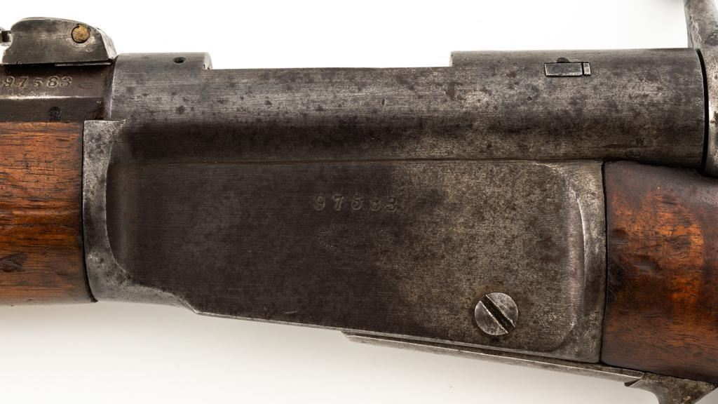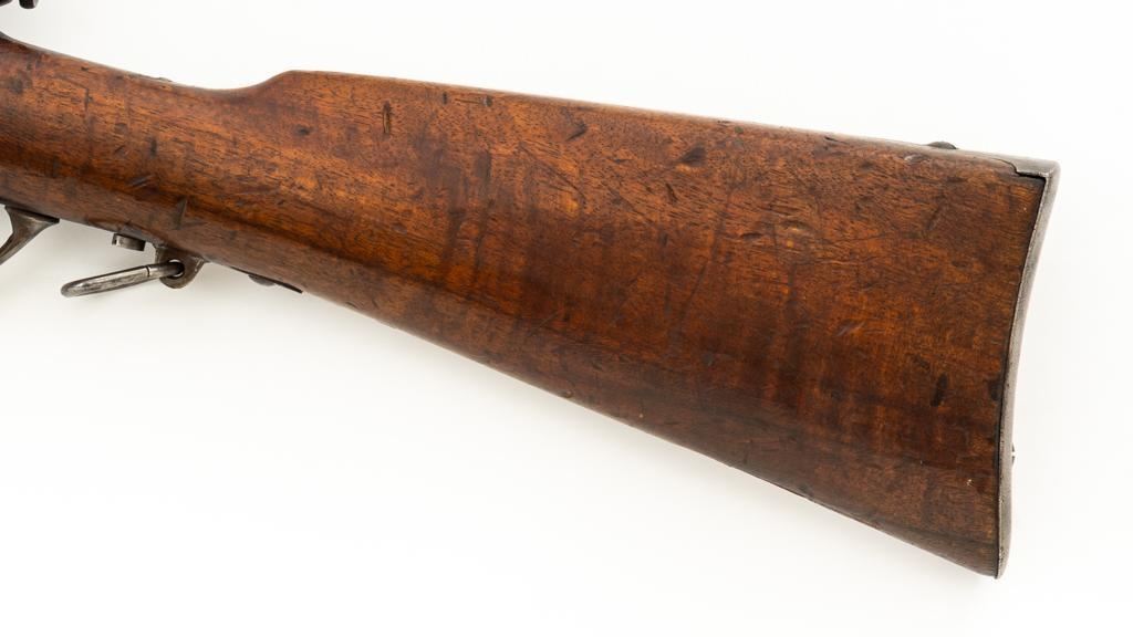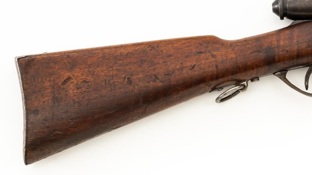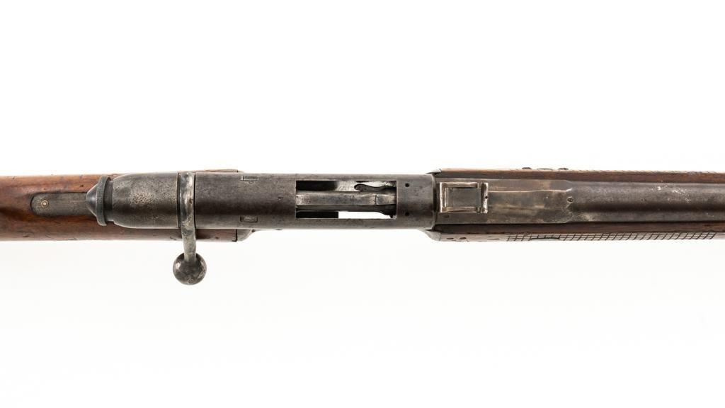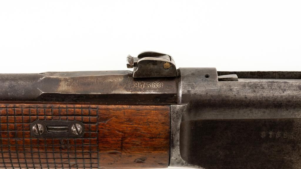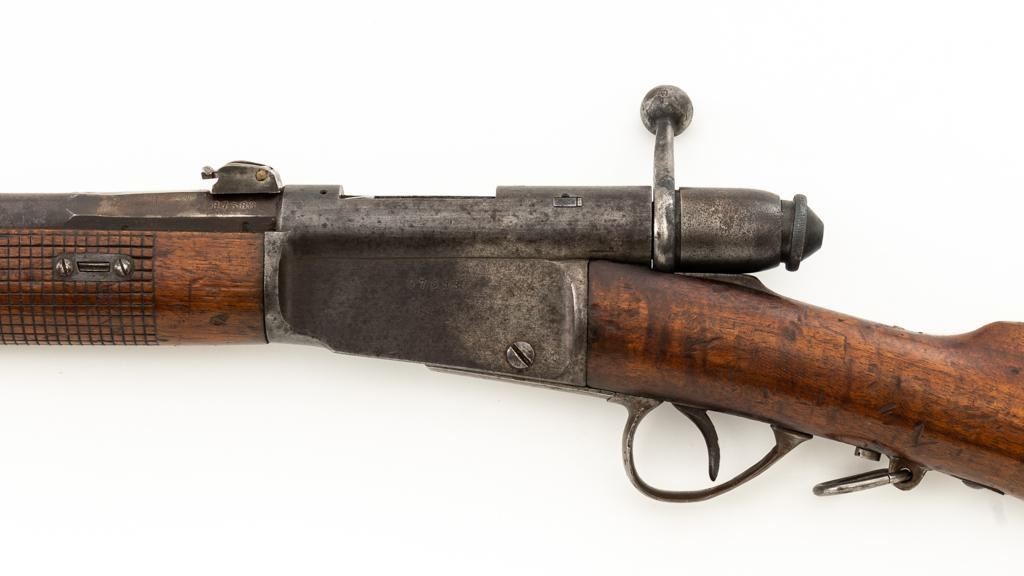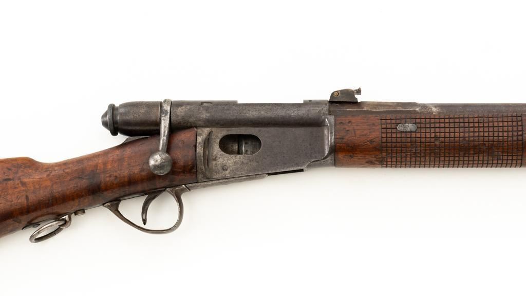 Modified Antique Swiss Model 1869/71 Vetterli Bolt Action Rifle, #97583, .41 Swiss Rimfire cal., barrel has been shortened to 18.25'', with blued finish, straight grip hardwood stock and checkered forend, inverted-''V'' front sight with protectors, and replacement ''V''-notched rear sight. Includes a modified steel cleaning rod and a sling ring has been welded onto the trigger guard tang. Left side of the is receiver marked ''SOC.IND.SUISSE/SYST.VETTERLIN.'' and there are Swiss crosses stamped on the rear receiver bridge and right side of the buttstock. Bolt is numbered but does not match. Rifle was modified by cutting back the forend, shortening the barrel, and attaching a newly fabricated forend cap. Condition overall is fair as modified. Metal retains little finish, with general patina, scratches, and some areas of light pitting. Wood with overall dents, scratches, and some areas of darkening. The old band spring and rear sling swivel recesses have been filled in. There are flat spots visible on the muzzle face and end of the nose cap. Action functions well. Rifling is well-defined but there is darkening and scattered erosion, particularly in the grooves. Missing the cartridge carrier, floorplate, and associated internal components. Est.: $200-$400. (Antique)